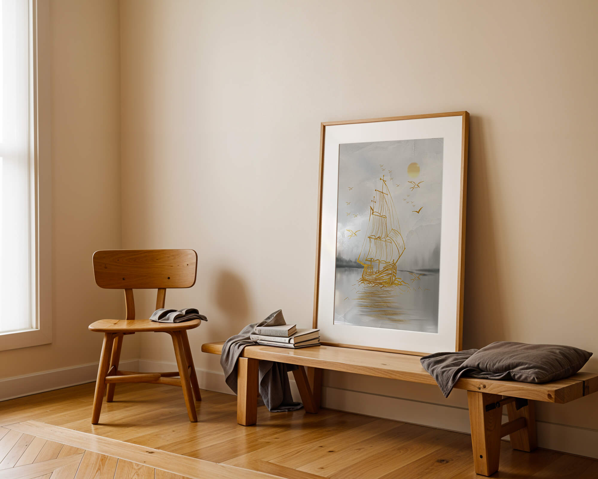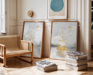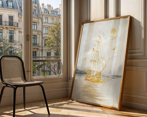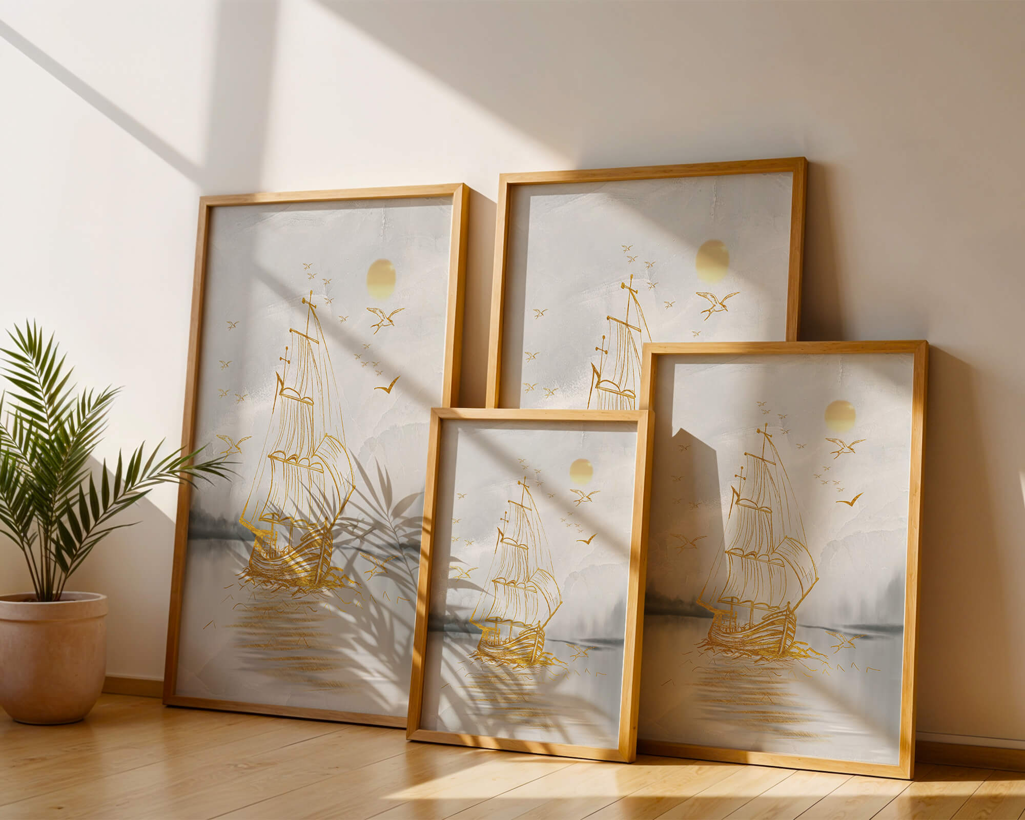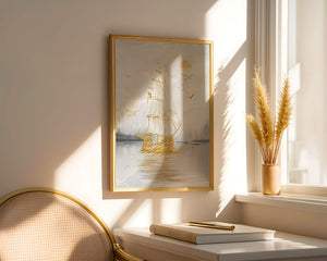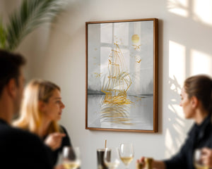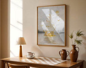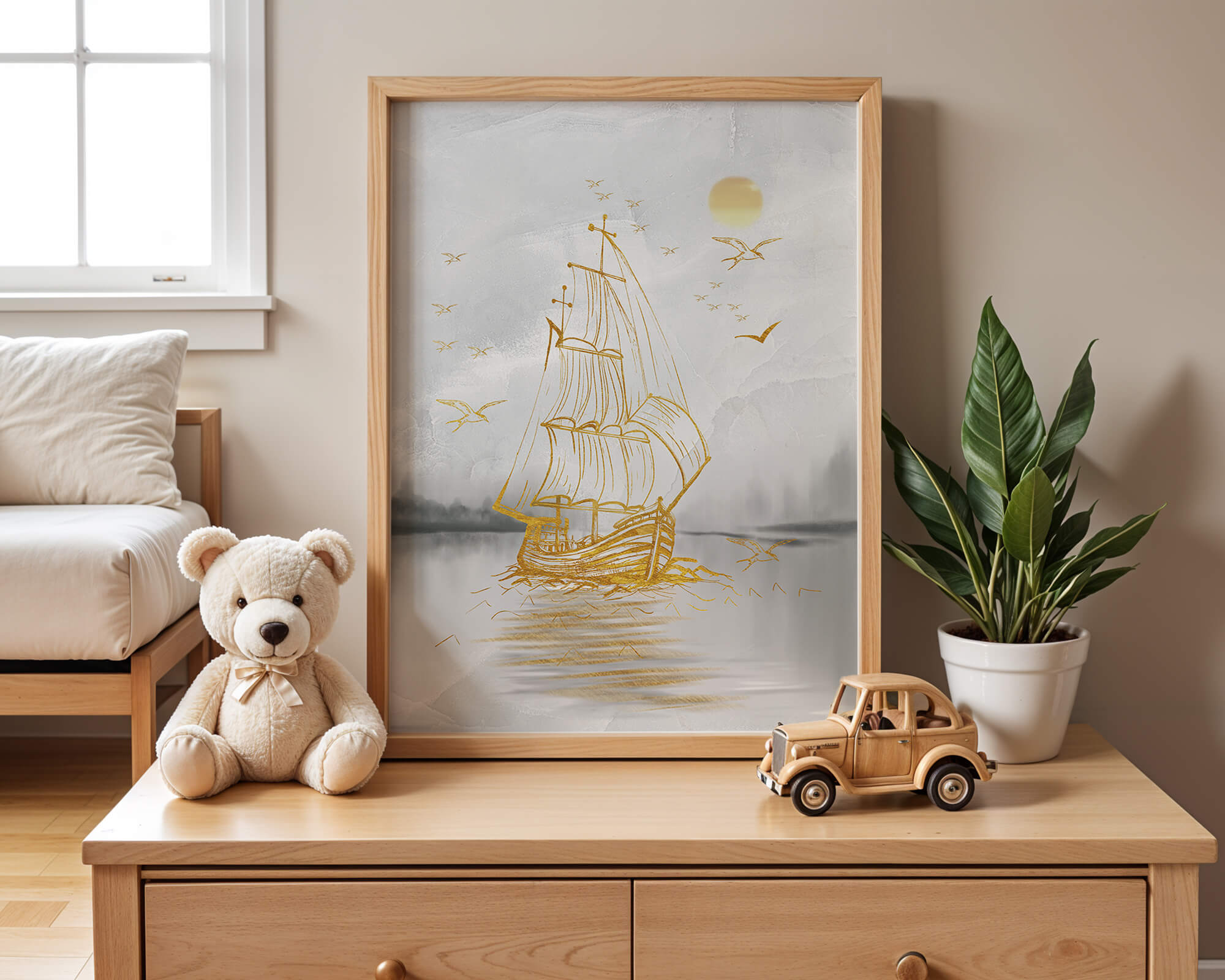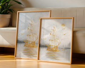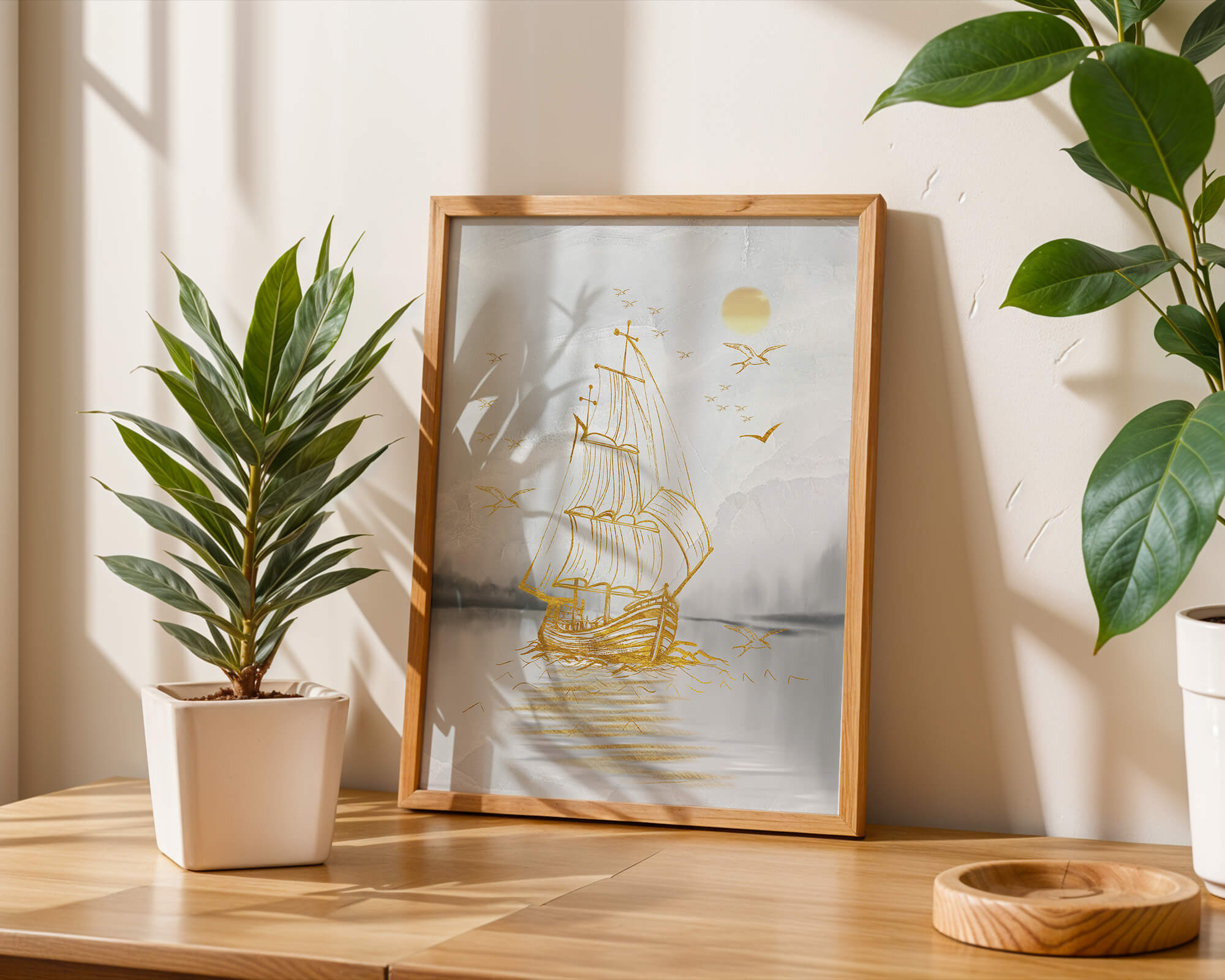 The image features a beautifully detailed sailboat rendered in gold, reflecting off the pristine surface of the ocean. The delicate balance of colors creates a harmonious blend, with the golden hues standing out against the soothing blue and green tones of the sea and sky. The sailboat, elegantly sketched, suggests movement and adventure, while the presence of birds adds a sense of freedom and exploration.This piece evokes feelings of serenity and wanderlust, making it a perfect addition to any living room, study, or office space. The nautical theme combined with the golden accents brings a touch of elegance, making it an ideal choice for those who appreciate maritime history and sophisticated decor. Whe| Type |