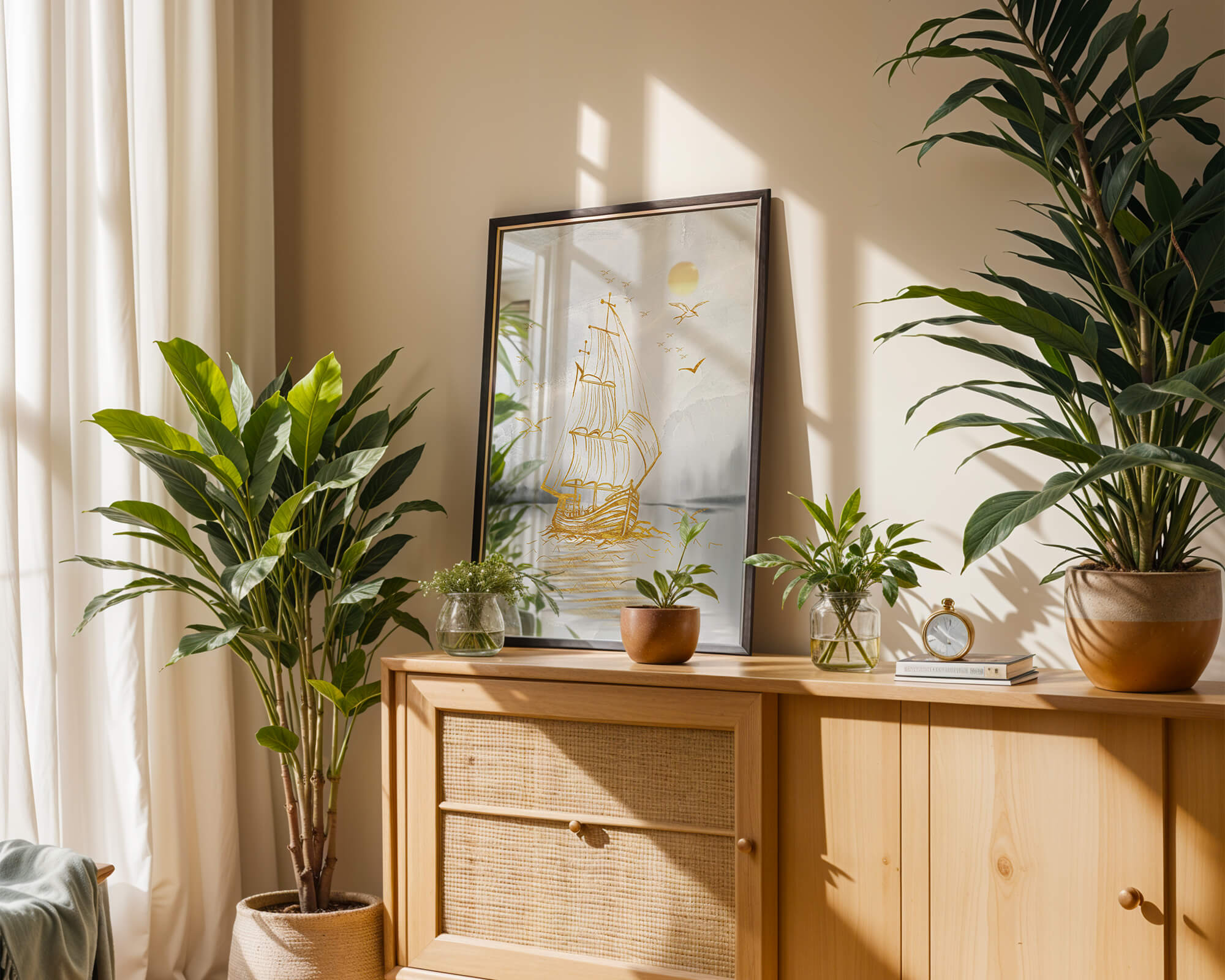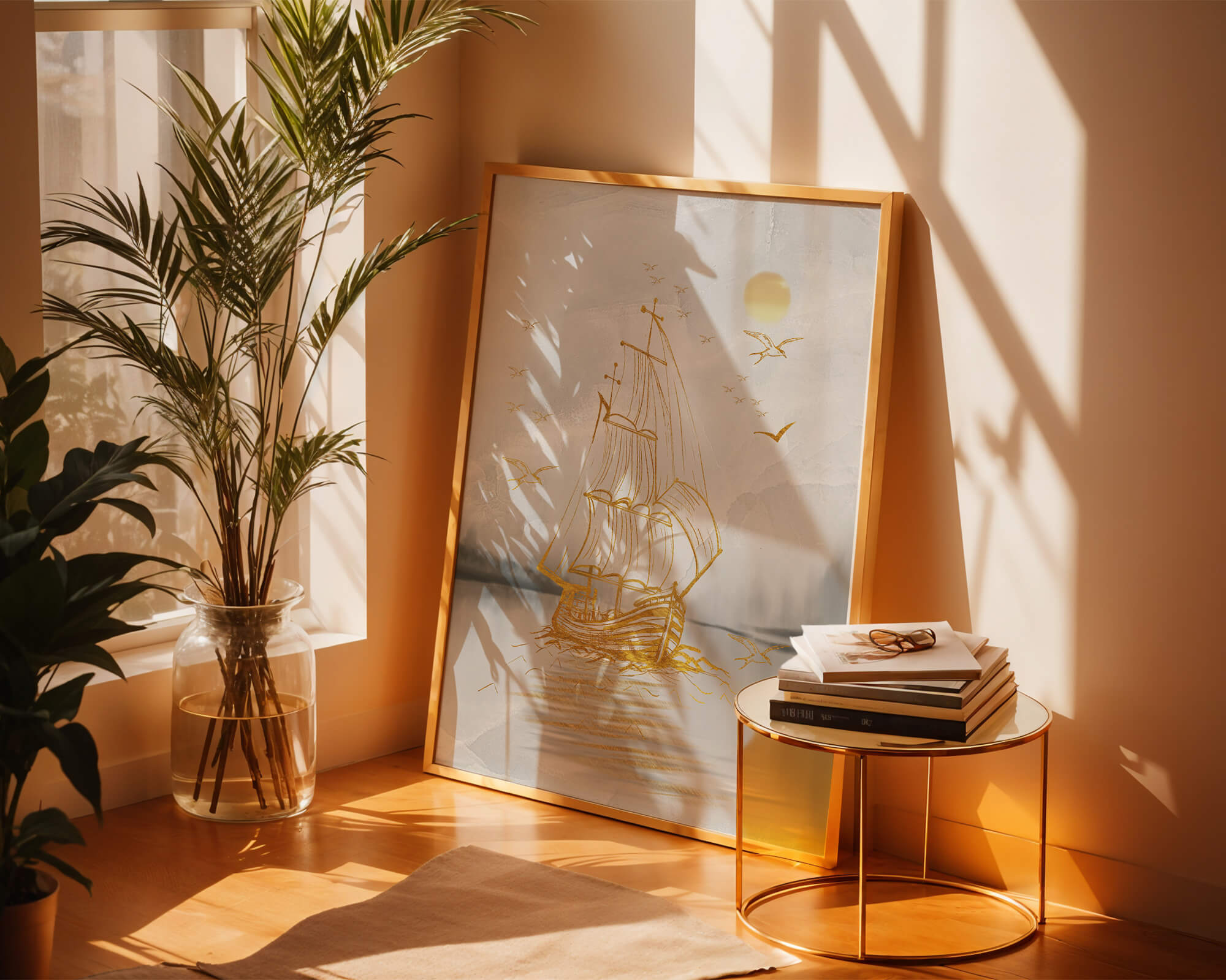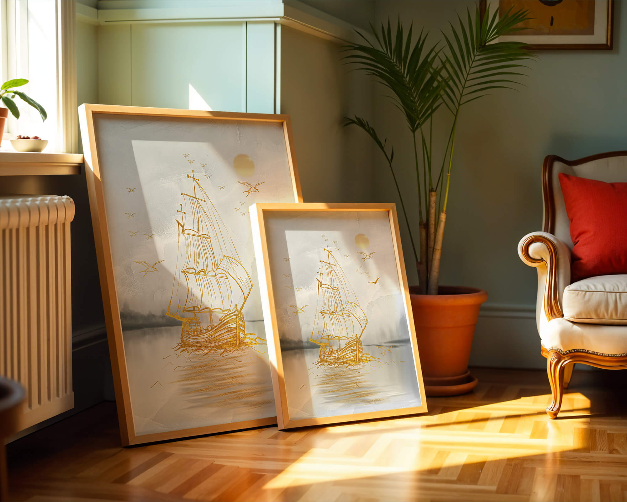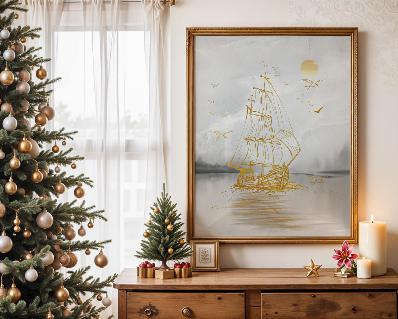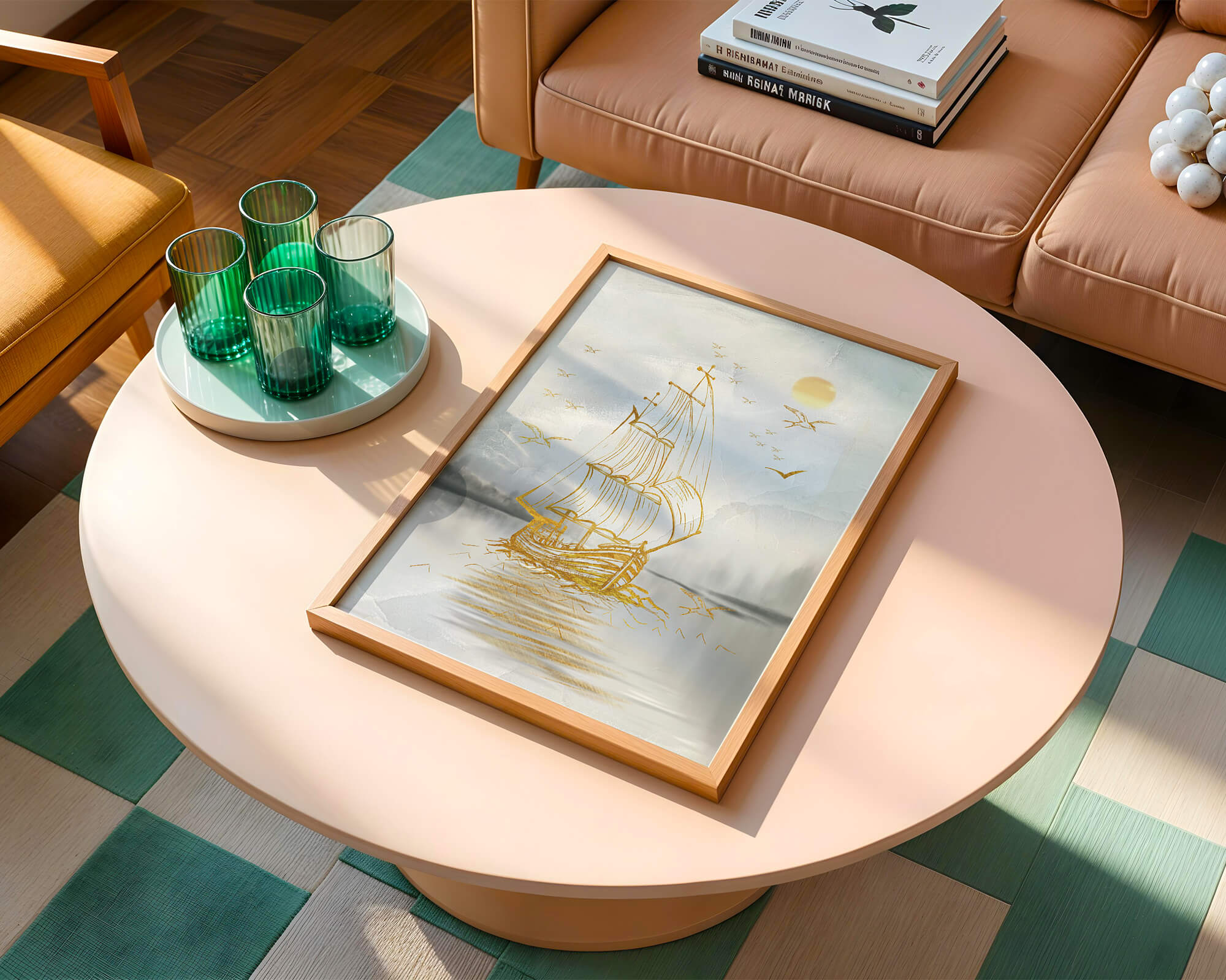 The image features a beautifully detailed sailboat rendered in gold, reflecting off the pristine surface of the ocean. The delicate balance of colors creates a harmonious blend, with the golden hues standing out against the soothing blue and green tones of the sea and sky. The sailboat, elegantly sketched, suggests movement and adventure, while the presence of birds adds a sense of freedom and exploration.This piece evokes feelings of serenity and wanderlust, making it a perfect addition to any living room, study, or office space. The nautical theme combined with the golden accents brings a touch of elegance, making it an ideal choice for those who appreciate maritime history and sophisticated decor. Whe| Type |
