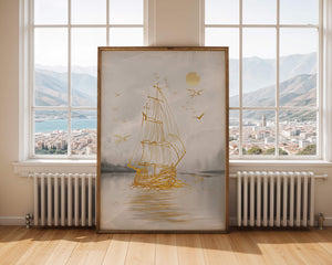 This captivating artwork captures a serene nautical scene where a golden sailboat glides gracefully across calm waters. The sky is adorned with birds taking flight against a backdrop of a soft sunrise, where the sun casts a gentle glow over the horizon.