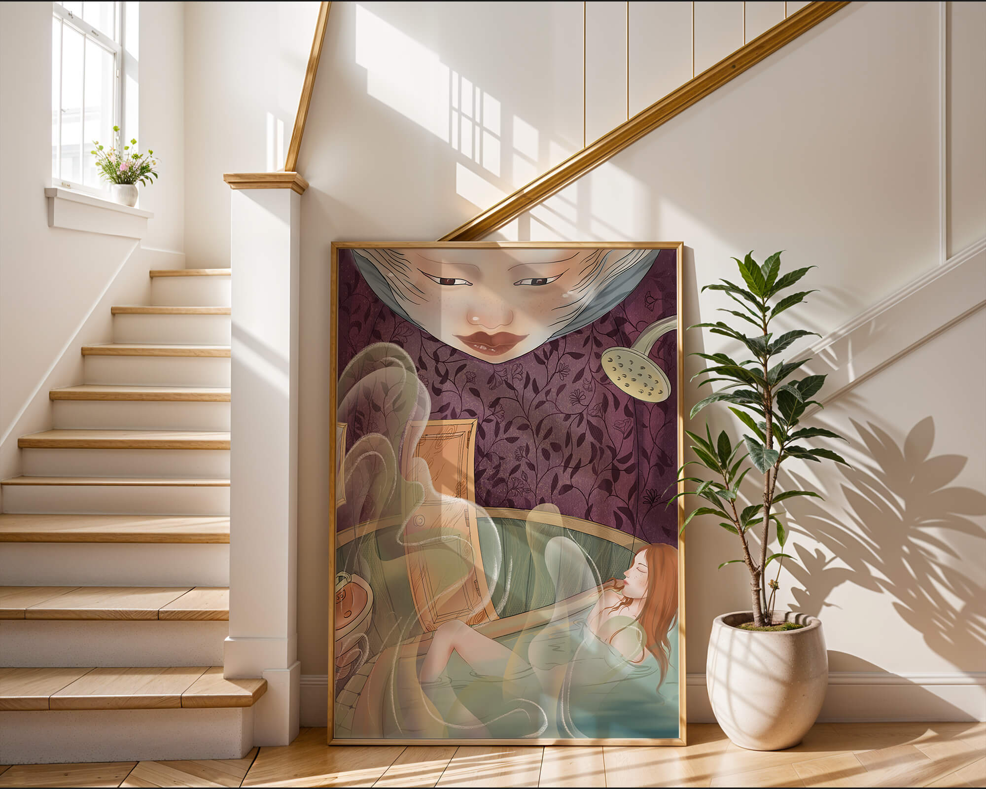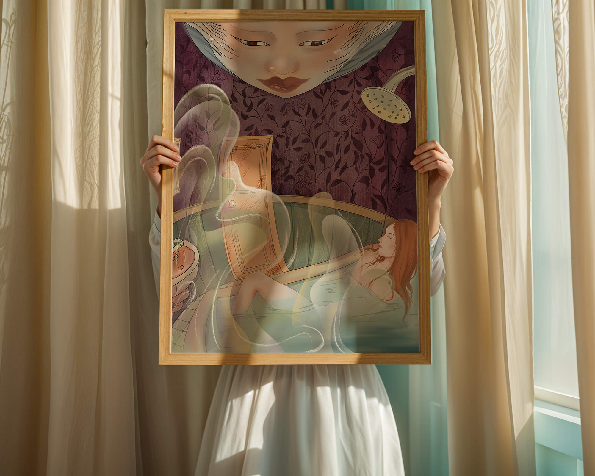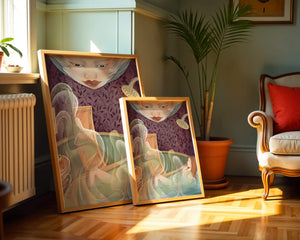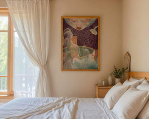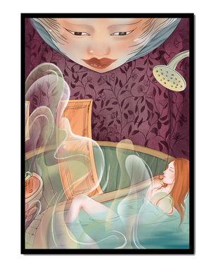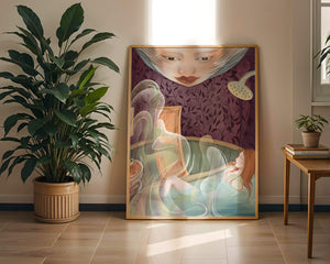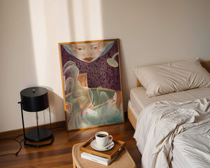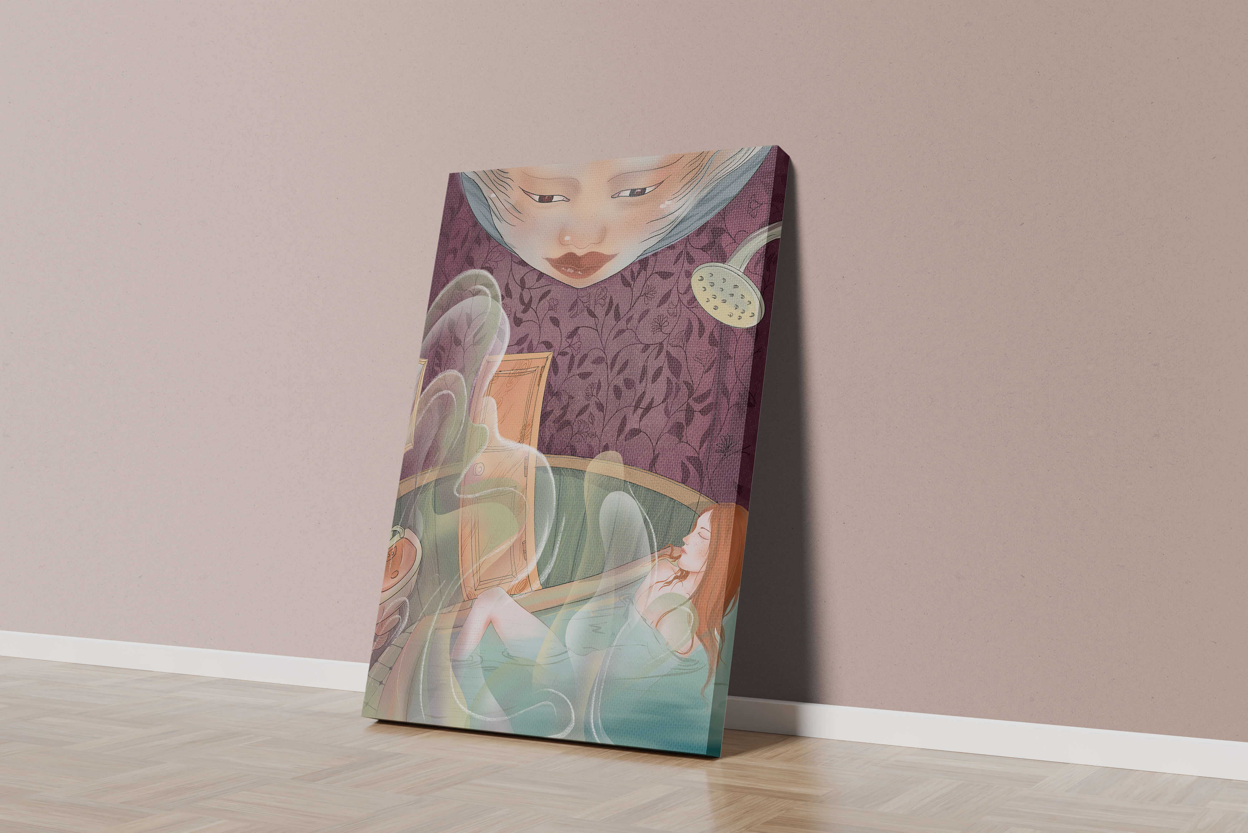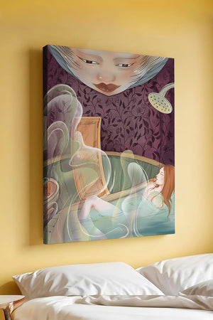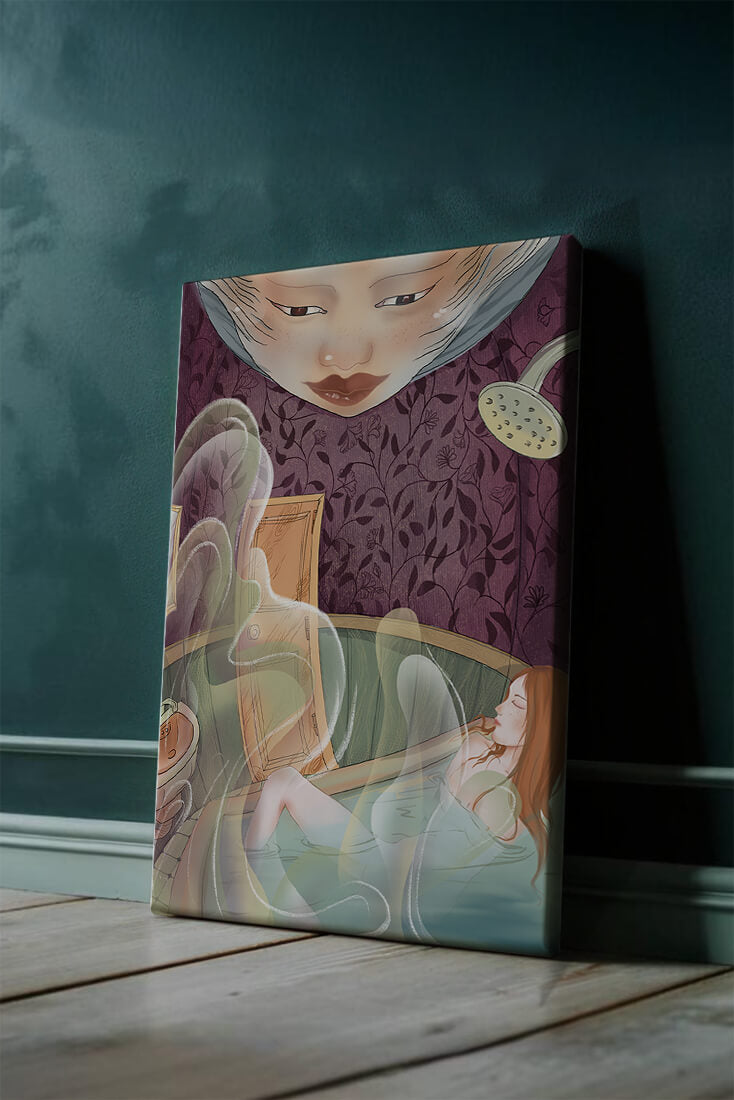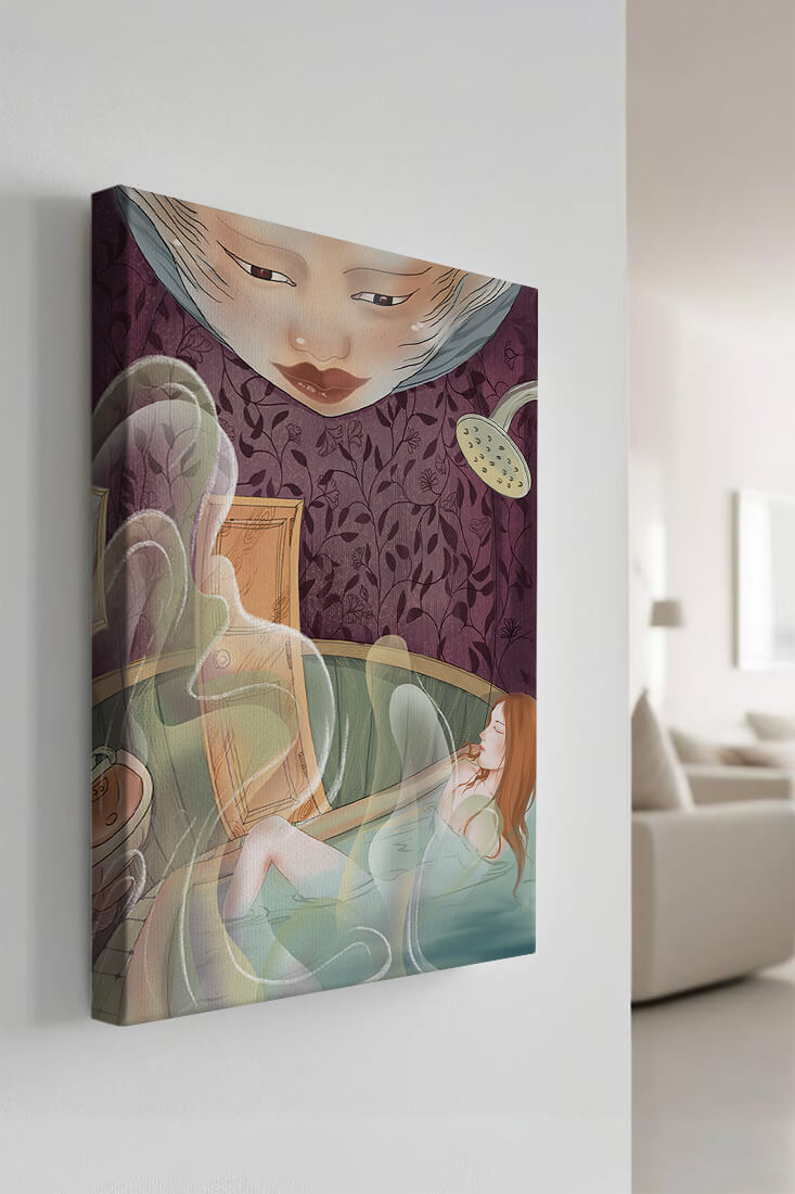 The interior is adorned with detailed wallpaper featuring a floral pattern in shades of purple, providing a rich and sophisticated backdrop. Above the relaxing figure, a mysterious face gazes downward, adding a touch of fantasy and intrigue to the setting. The warm tones and gentle textures create an ambiance of tranquility, making it an ideal space for relaxation and reverie.This artwork seamlessly blends elements of serenity and fantasy, inviting viewers to imagine themselves within the soothing embrace of the scene. The combination of ornate design elements and ethereal features makes it a compelling piece for those who appreciate the fusion of art and relaxation spaces.| Type |