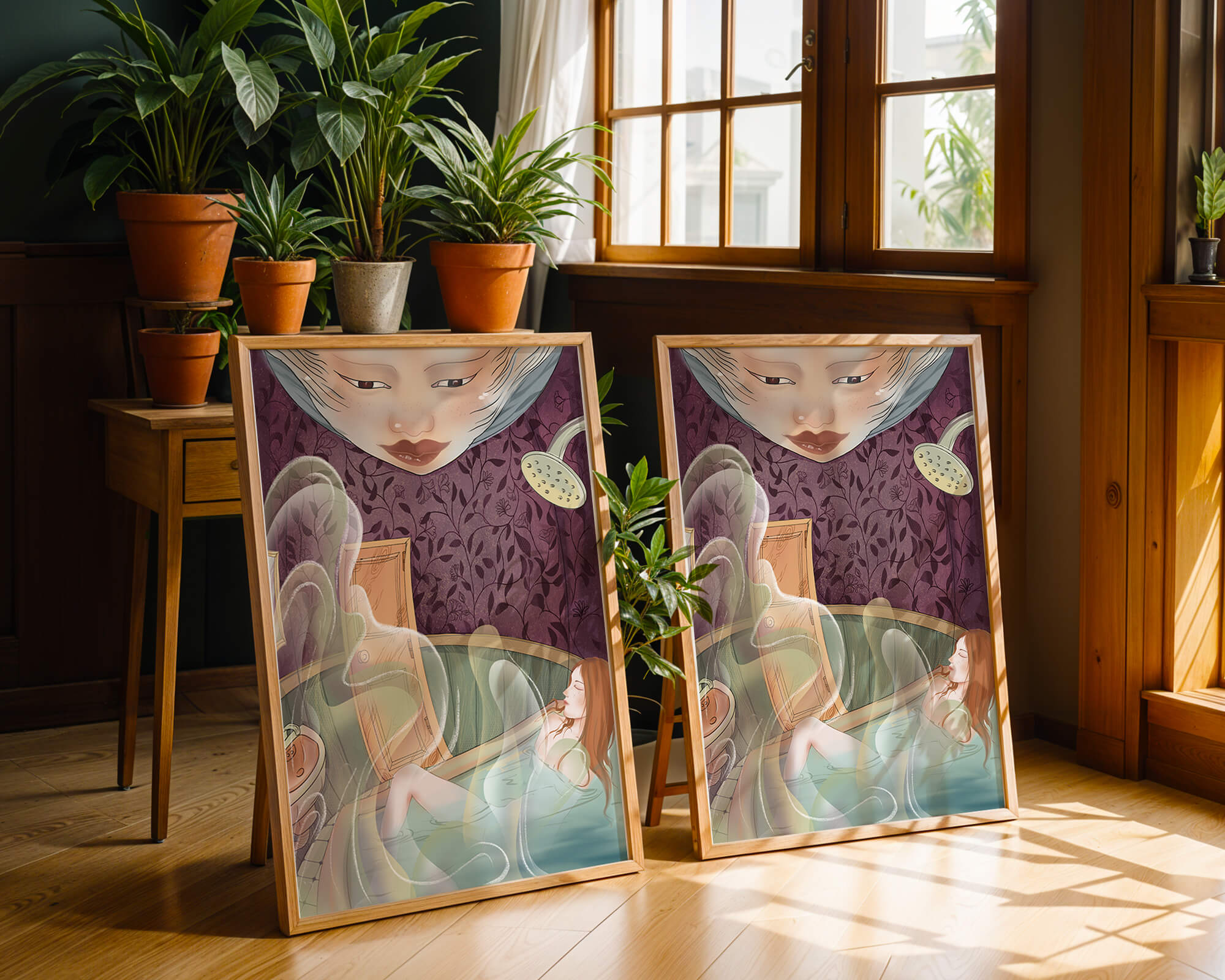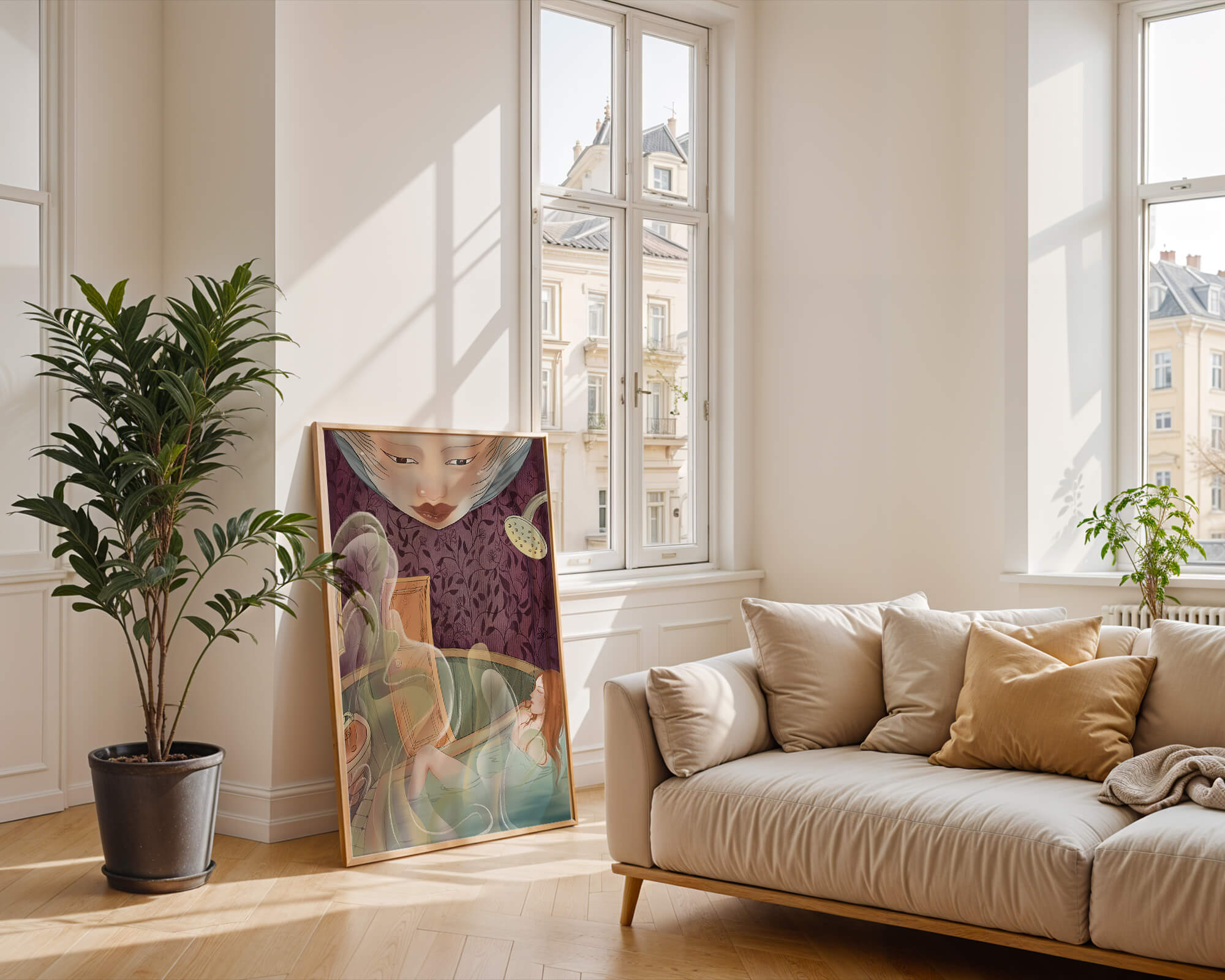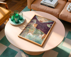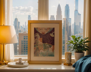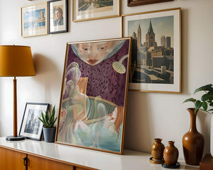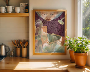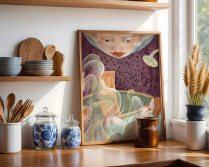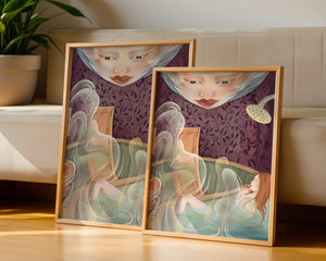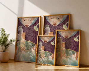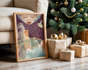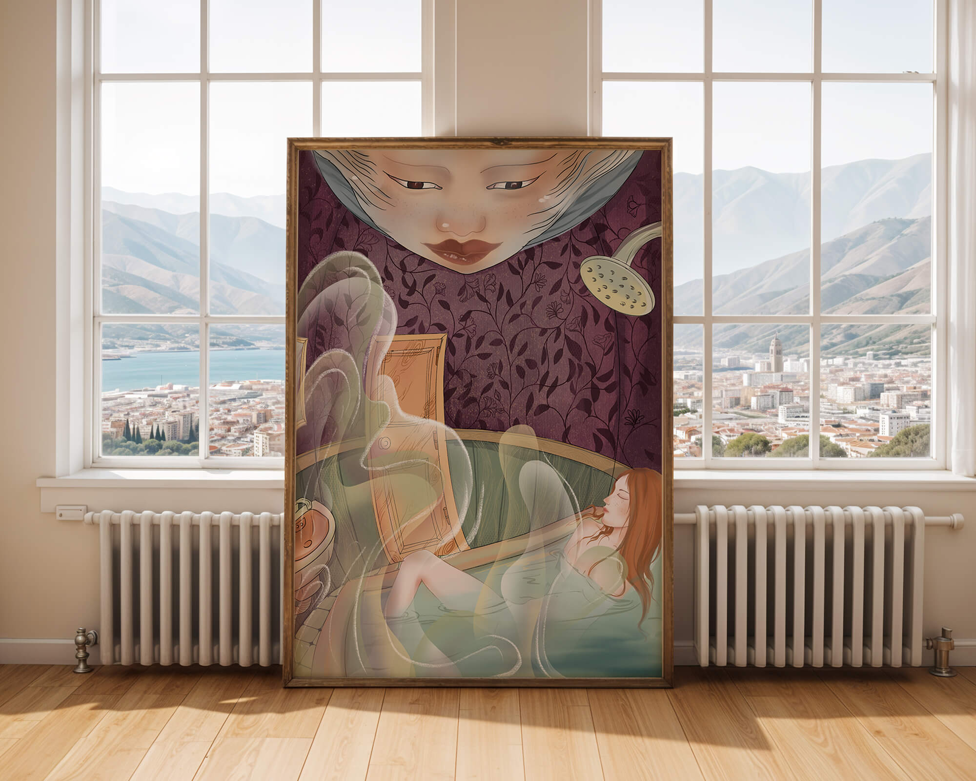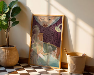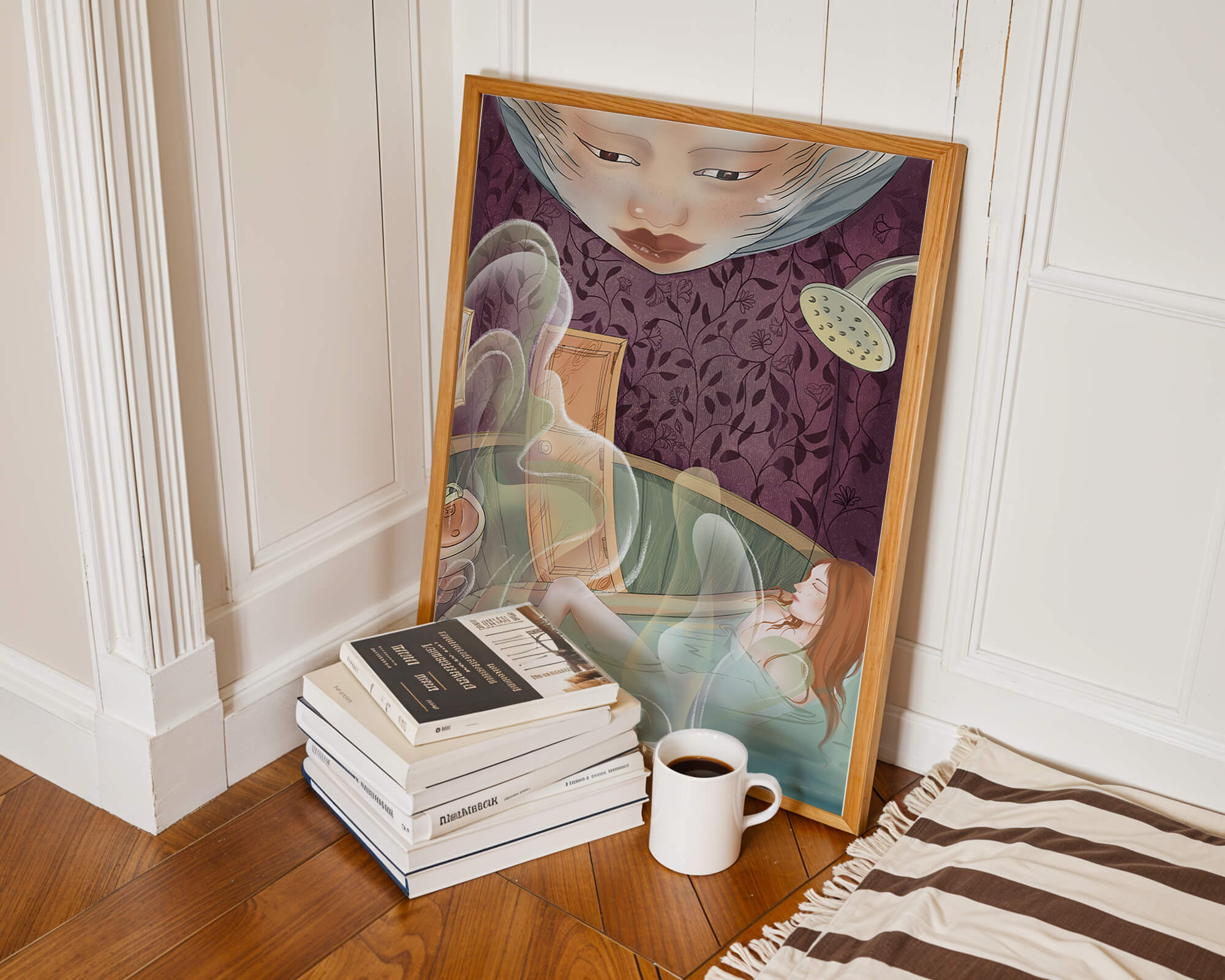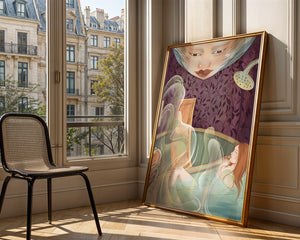 The interior is adorned with detailed wallpaper featuring a floral pattern in shades of purple, providing a rich and sophisticated backdrop. Above the relaxing figure, a mysterious face gazes downward, adding a touch of fantasy and intrigue to the setting. The warm tones and gentle textures create an ambiance of tranquility, making it an ideal space for relaxation and reverie.This artwork seamlessly blends elements of serenity and fantasy, inviting viewers to imagine themselves within the soothing embrace of the scene. The combination of ornate design elements and ethereal features makes it a compelling piece for those who appreciate the fusion of art and relaxation spaces.| Type |