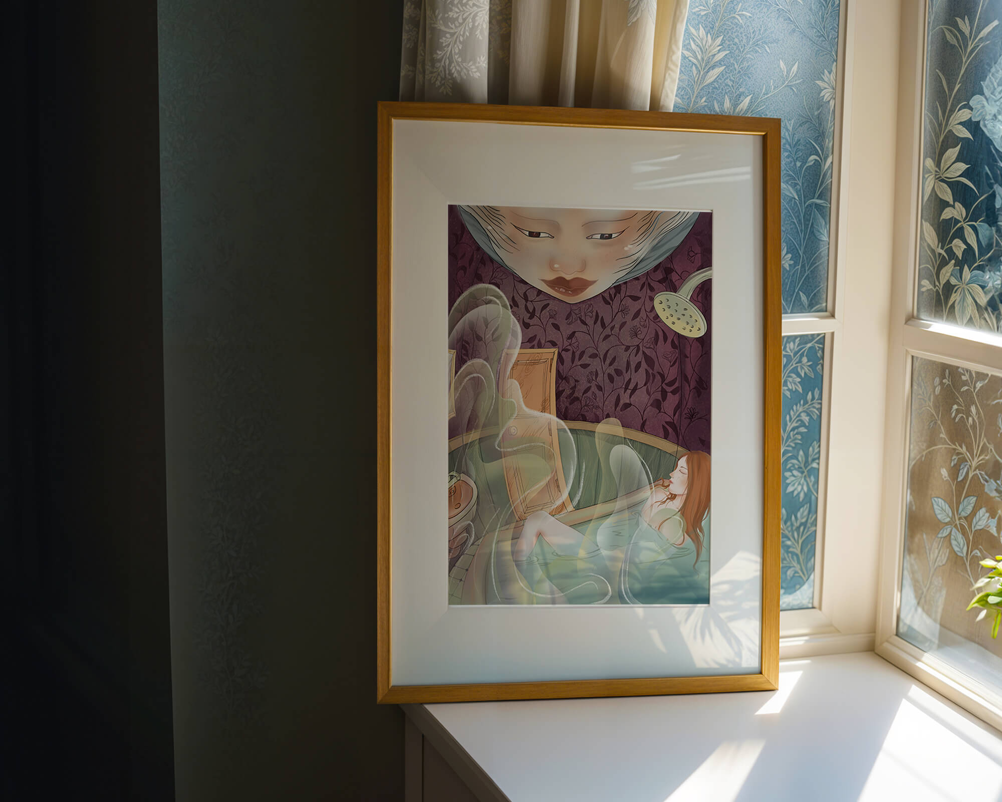 Tranquil bath scene with ethereal elements and ornate wallpaper
