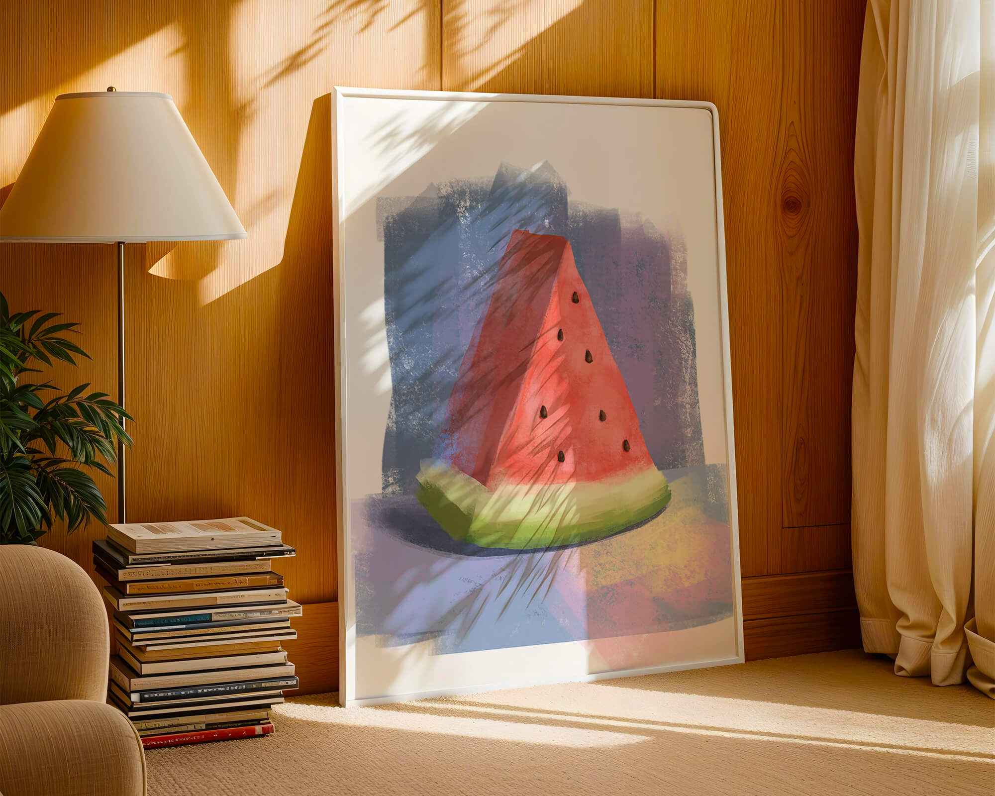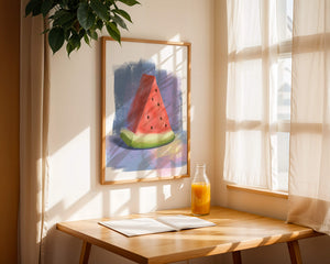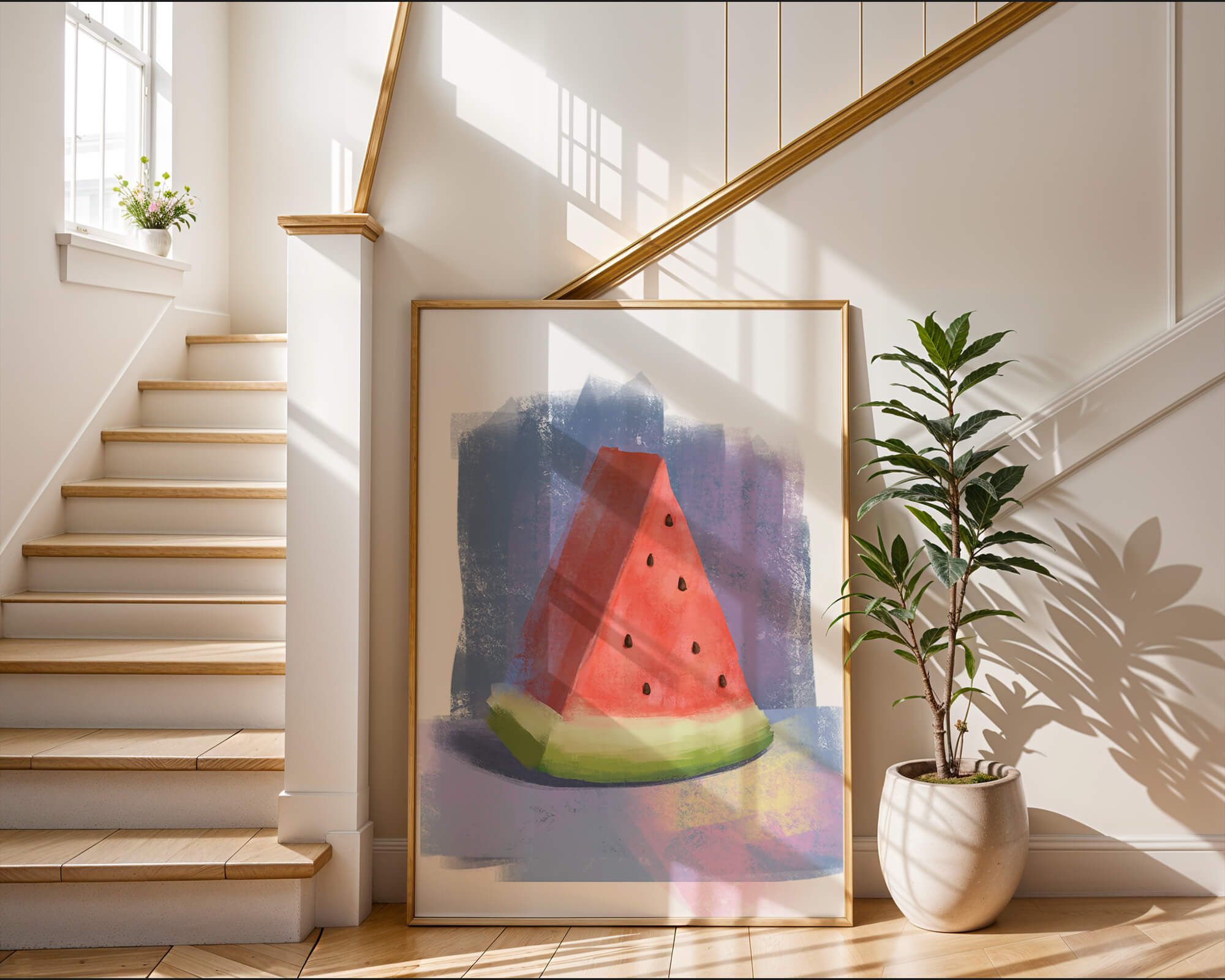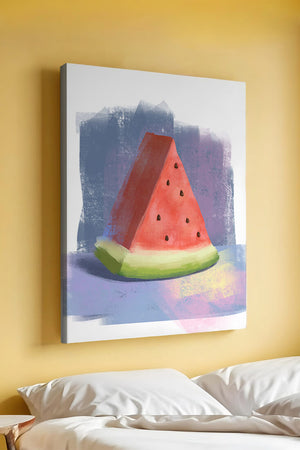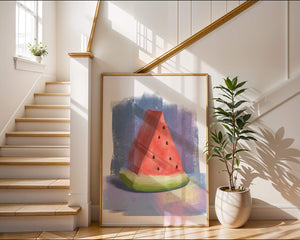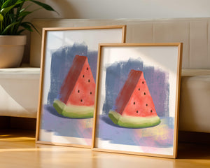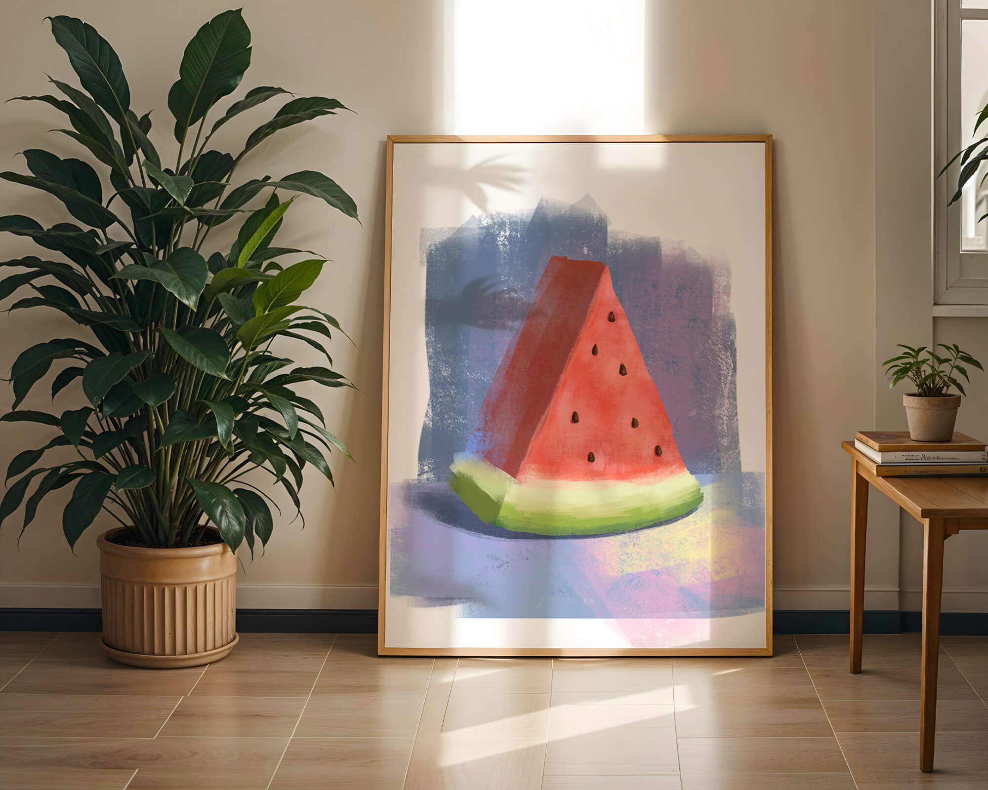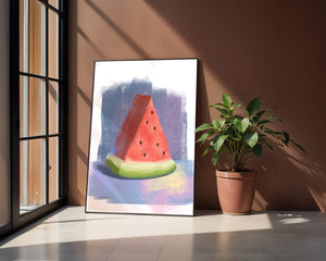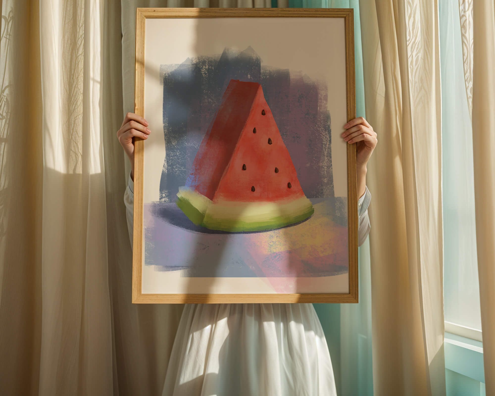The illustration beautifully captures the essence of a fresh watermelon. The slice stands prominently against a backdrop of subtle hues and textured strokes, exhibiting a delightful play of color and form. The red flesh, dotted with dark seeds, and the contrasting green rind add a natural charm and vividness.This artwork can be an appealing addition to a variety of spaces. Its modern, abstract style paired with a classic fruit subject makes it versatile, suitable for a kitchen, dining area, or even a café setting. This piece not only embodies the freshness of summer but also offers an artistic flair to any room.
