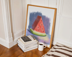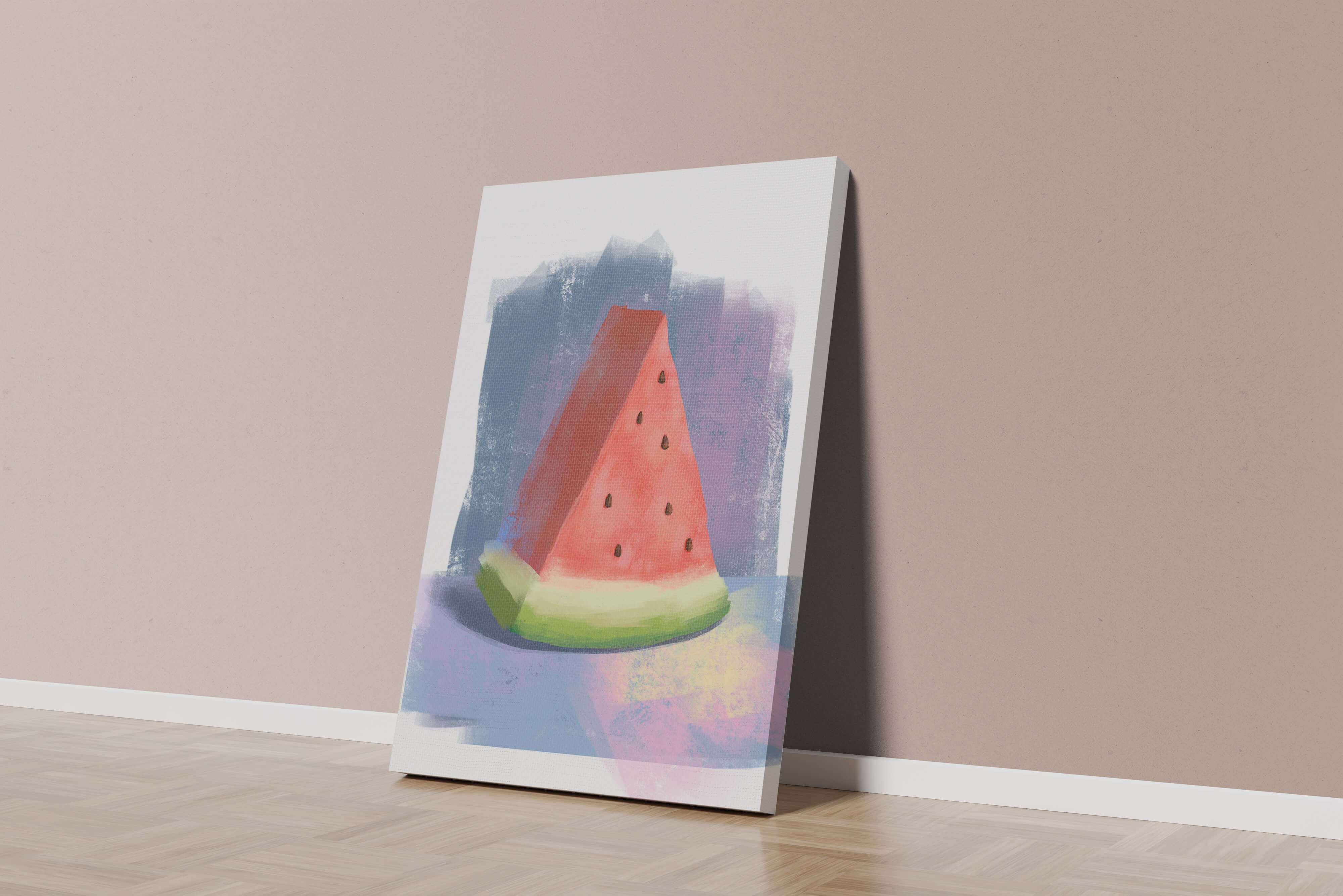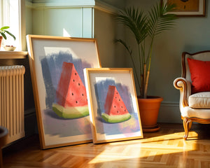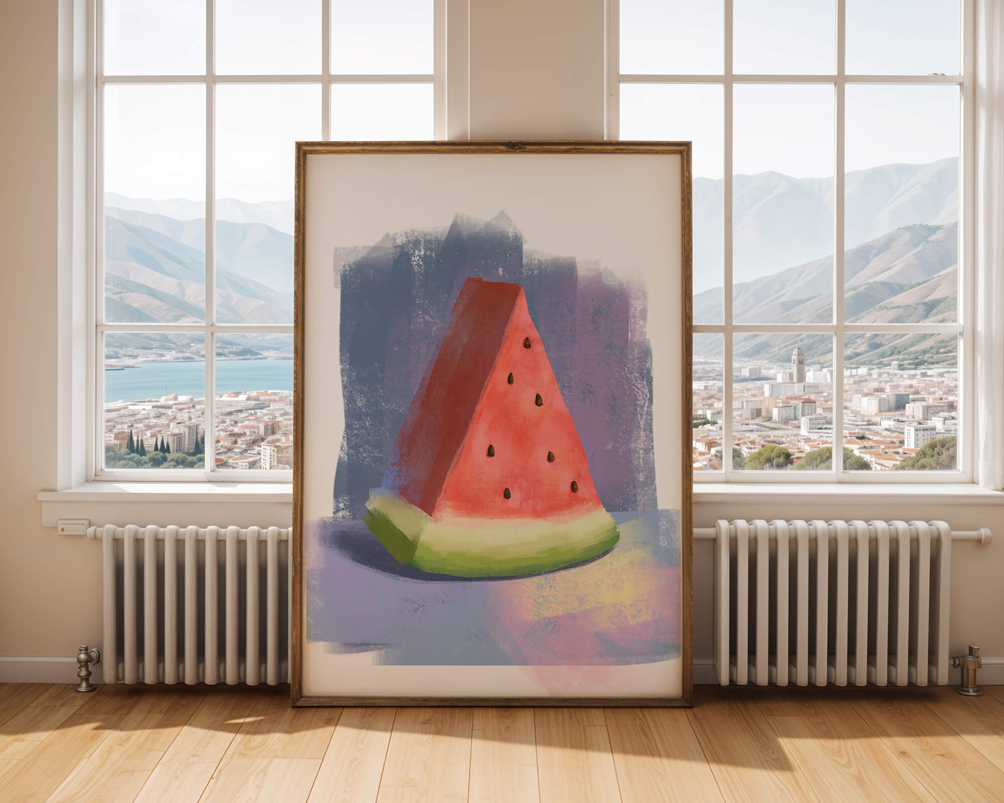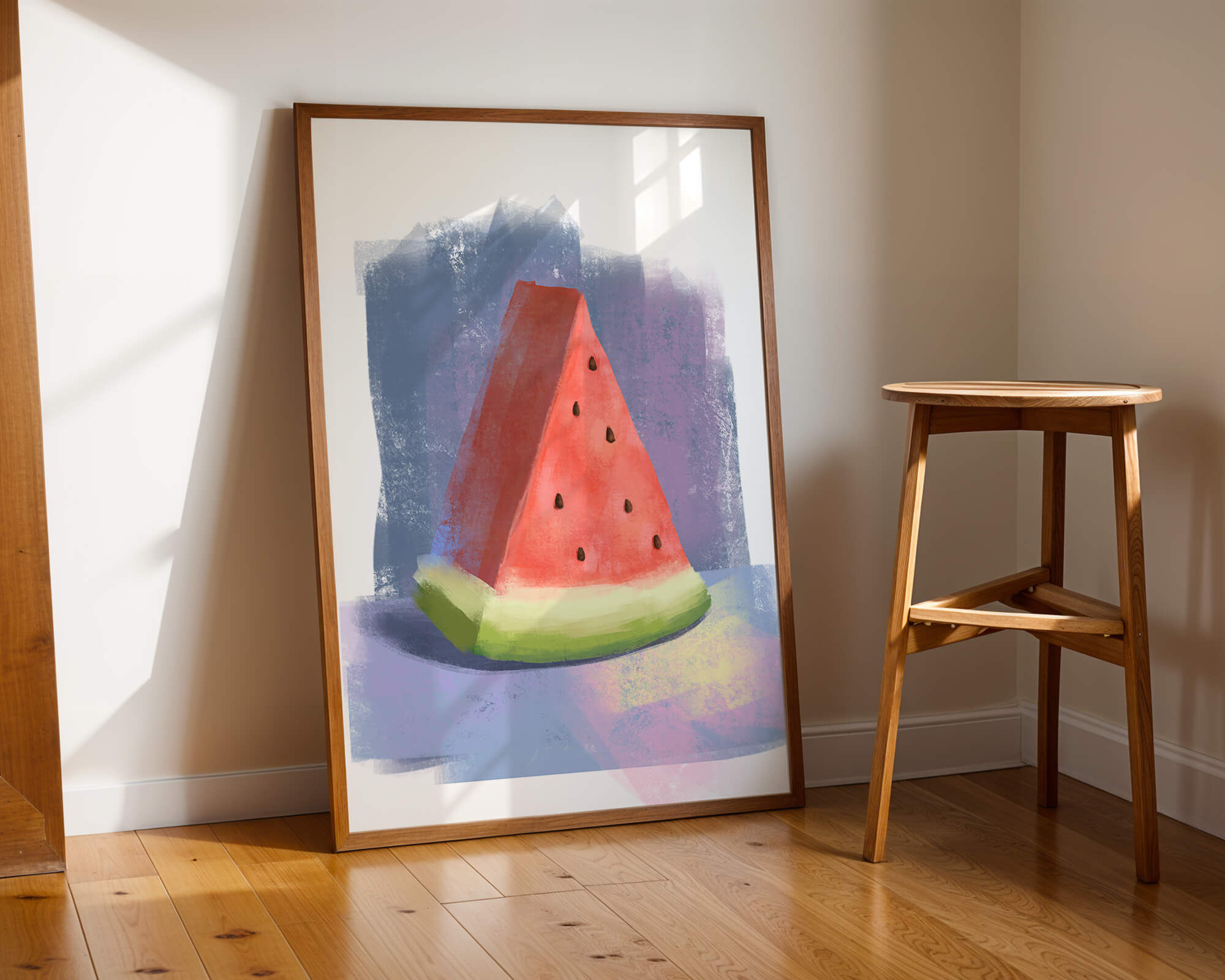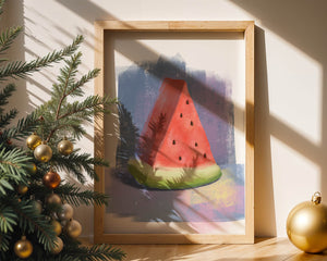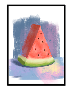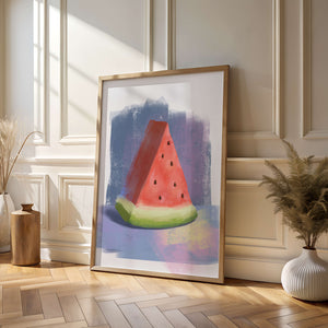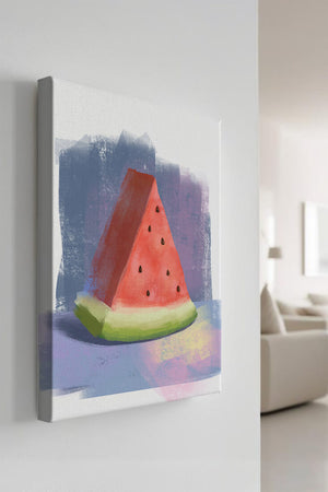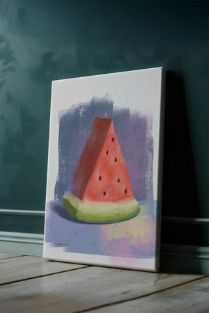 The illustration beautifully captures the essence of a fresh watermelon. The slice stands prominently against a backdrop of subtle hues and textured strokes, exhibiting a delightful play of color and form. The red flesh, dotted with dark seeds, and the contrasting green rind add a natural charm and vividness.This artwork can be an appealing addition to a variety of spaces. Its modern, abstract style paired with a classic fruit subject makes it versatile, suitable for a kitchen, dining area, or even a café setting. This piece not only embodies the freshness of summer but also offers an artistic flair to any room.