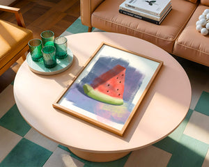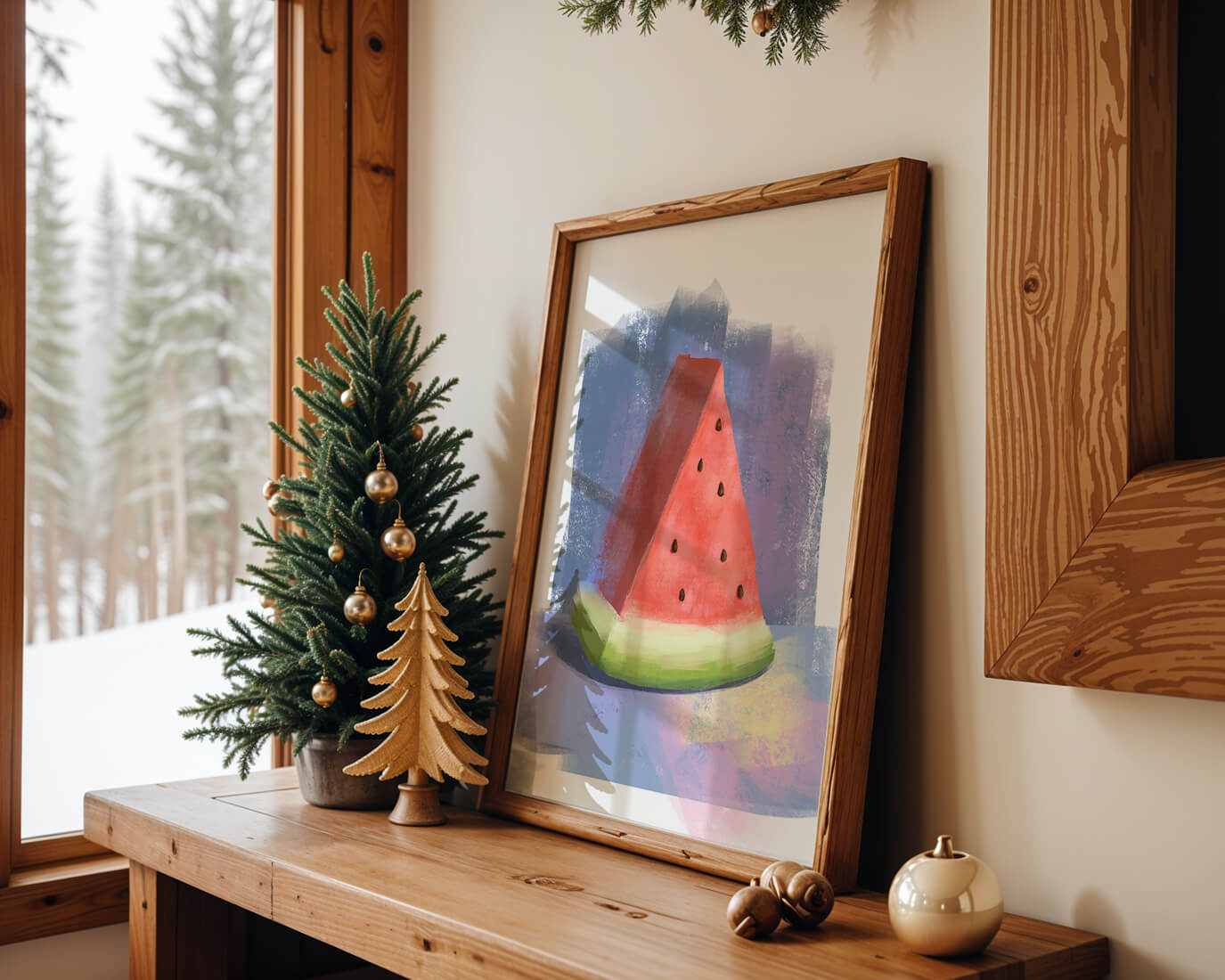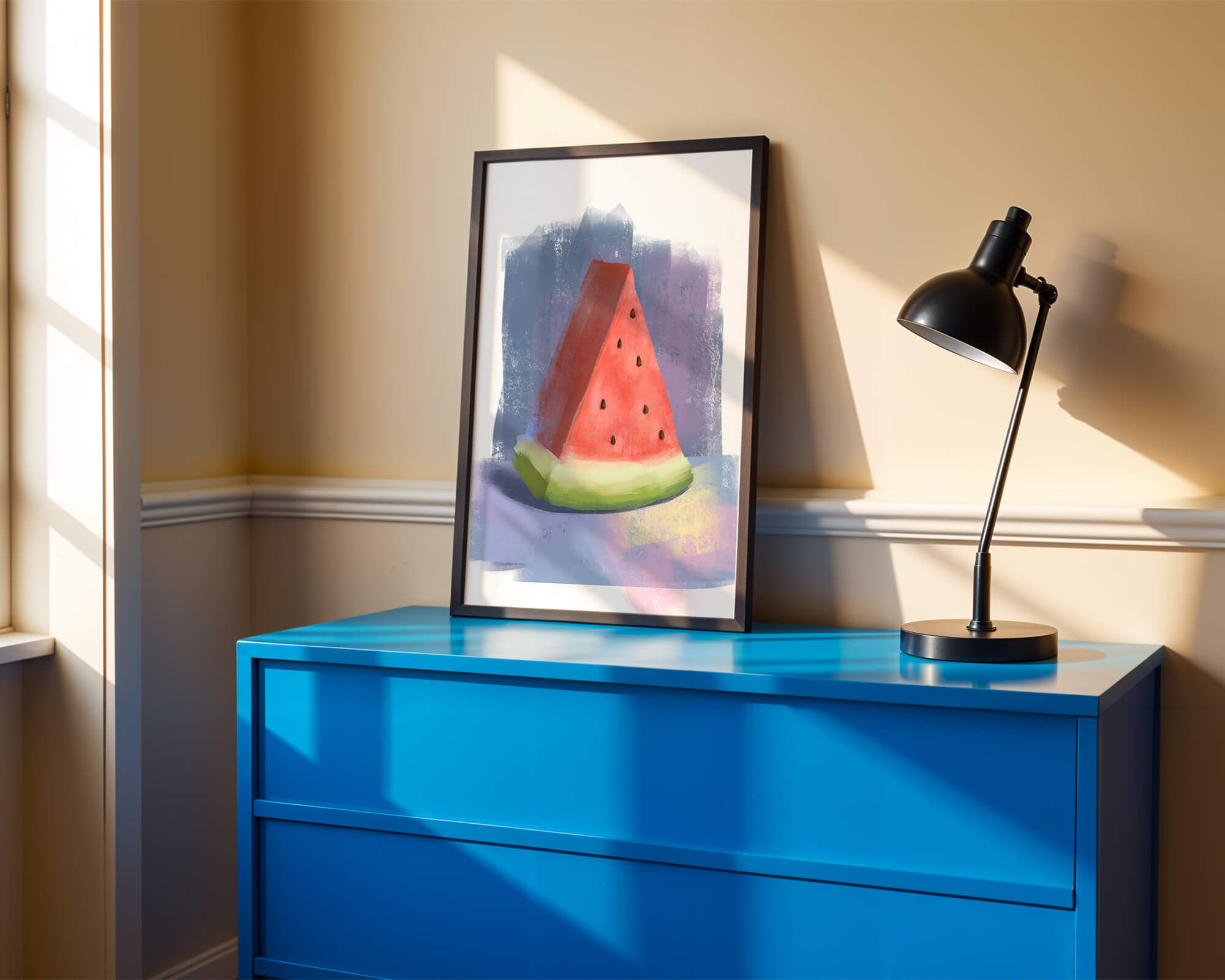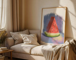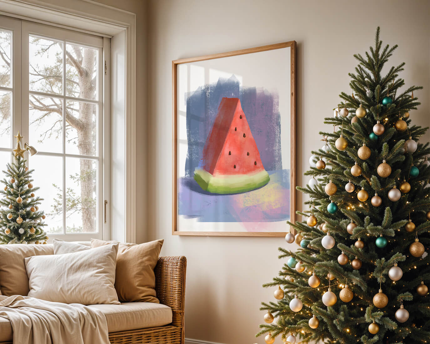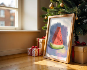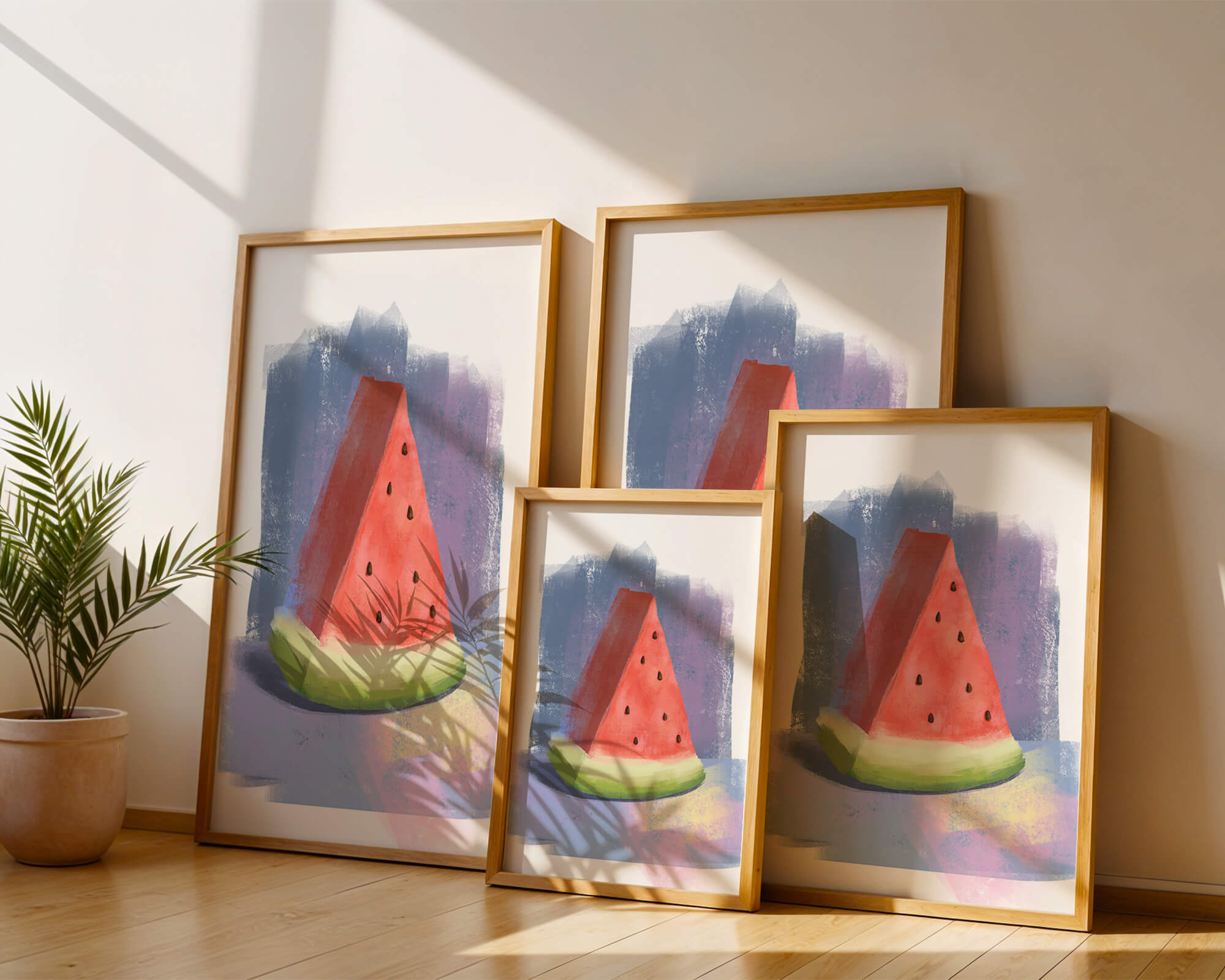 The illustration beautifully captures the essence of a fresh watermelon. The slice stands prominently against a backdrop of subtle hues and textured strokes, exhibiting a delightful play of color and form. The red flesh, dotted with dark seeds, and the contrasting green rind add a natural charm and vividness.This artwork can be an appealing addition to a variety of spaces. Its modern, abstract style paired with a classic fruit subject makes it versatile, suitable for a kitchen, dining area, or even a café setting. This piece not only embodies the freshness of summer but also offers an artistic flair to any room.