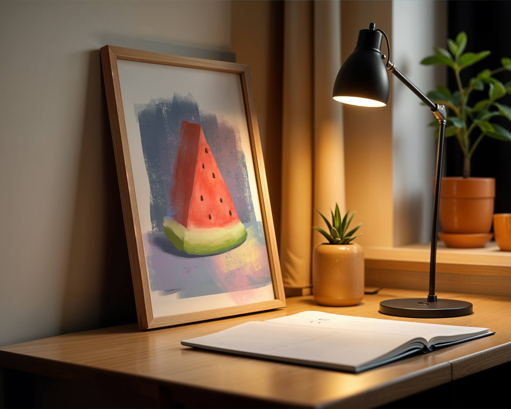 This image showcases a watercolor illustration of a watermelon slice with a textured and abstract background. The vibrant colors and artistic style make the scene lively and appealing.