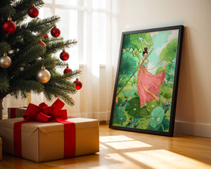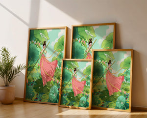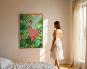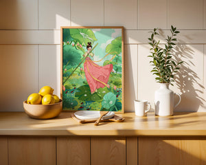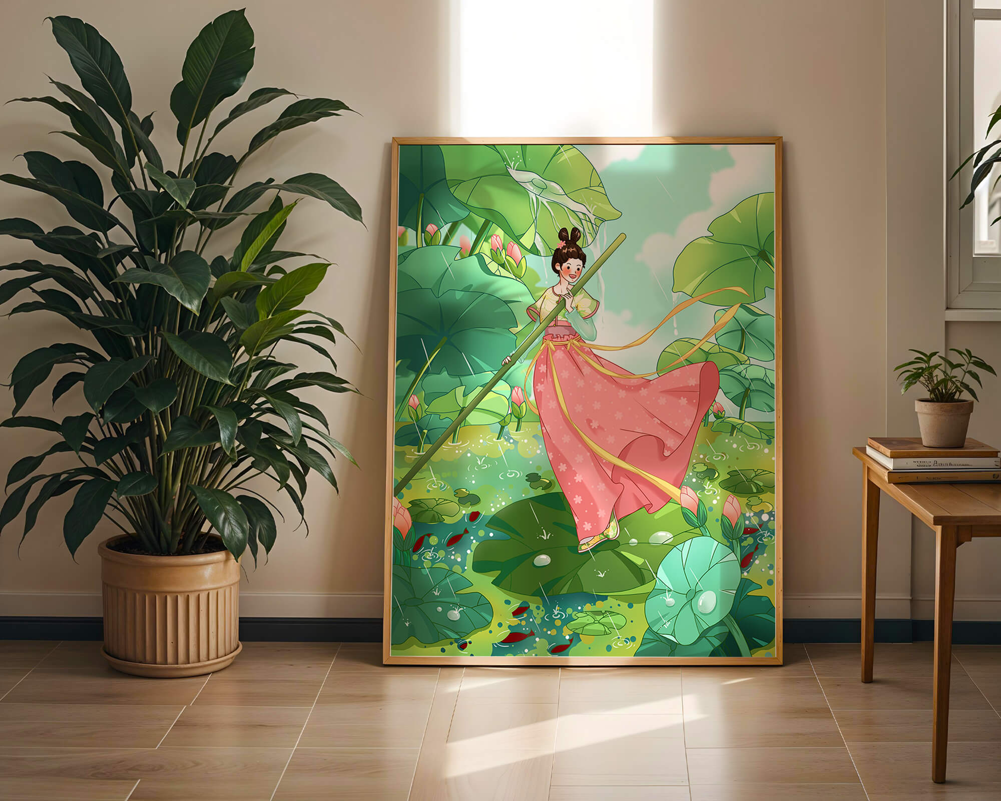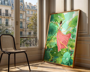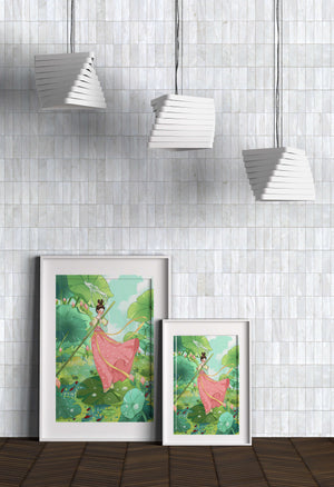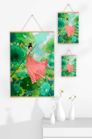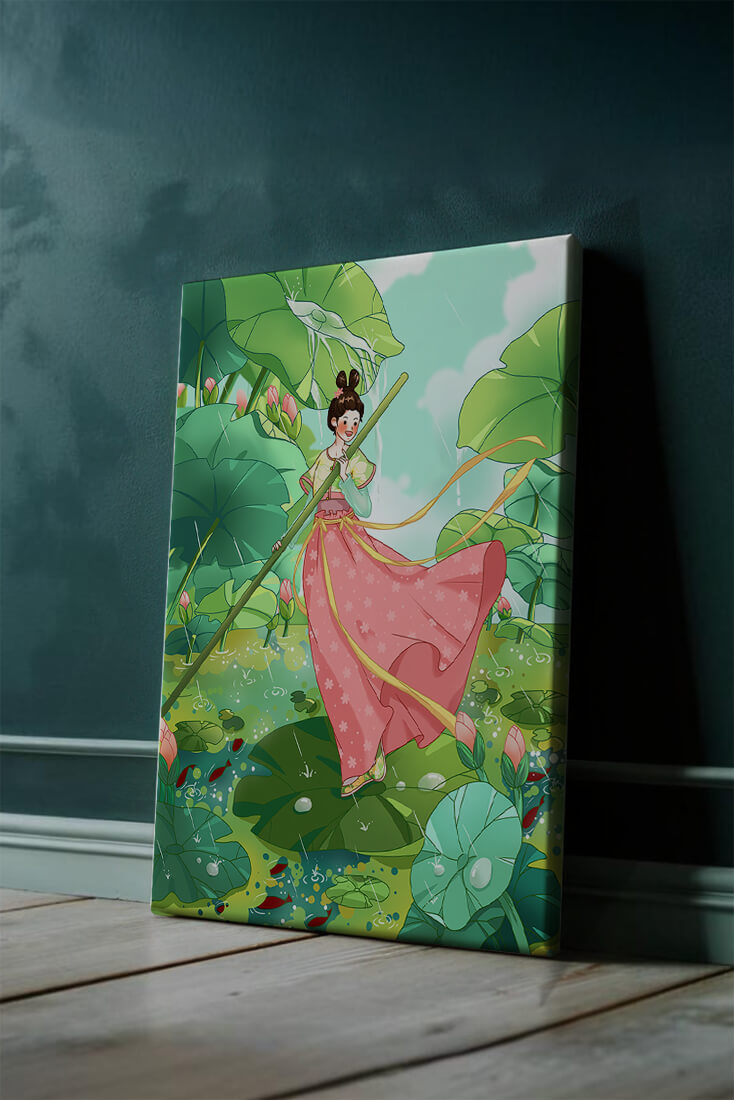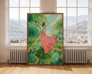 The scene is alive with color and vitality. The bright green leaves and the soft pink flowers create a stunning contrast against the clear blue sky. The young girl’s traditional dress adds an element of elegance and cultural richness to the setting, as she carefully steps along the gigantic leaves, her expression full of joy and curiosity.Water droplets gently cascade from the leaves, creating ripples in the water below where vibrant fish dart playfully between stems. This illustration evokes a sense of peace and wonder, inviting viewers to immerse themselves in its magical, serene environment.| Type |