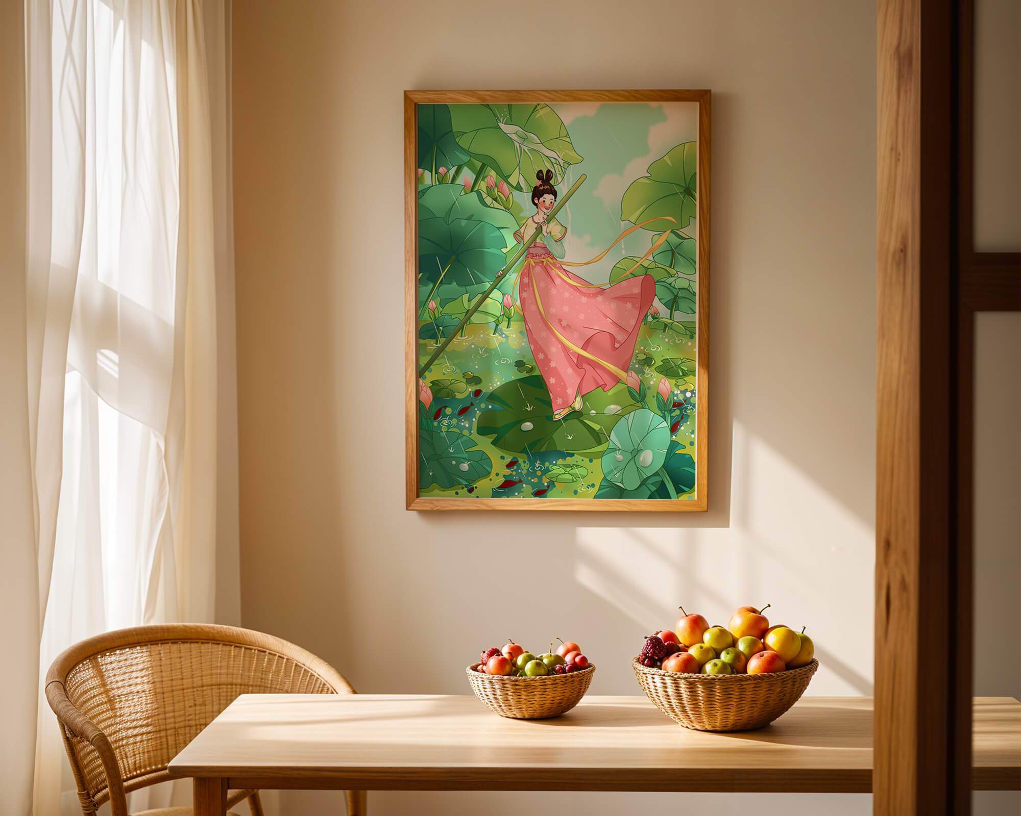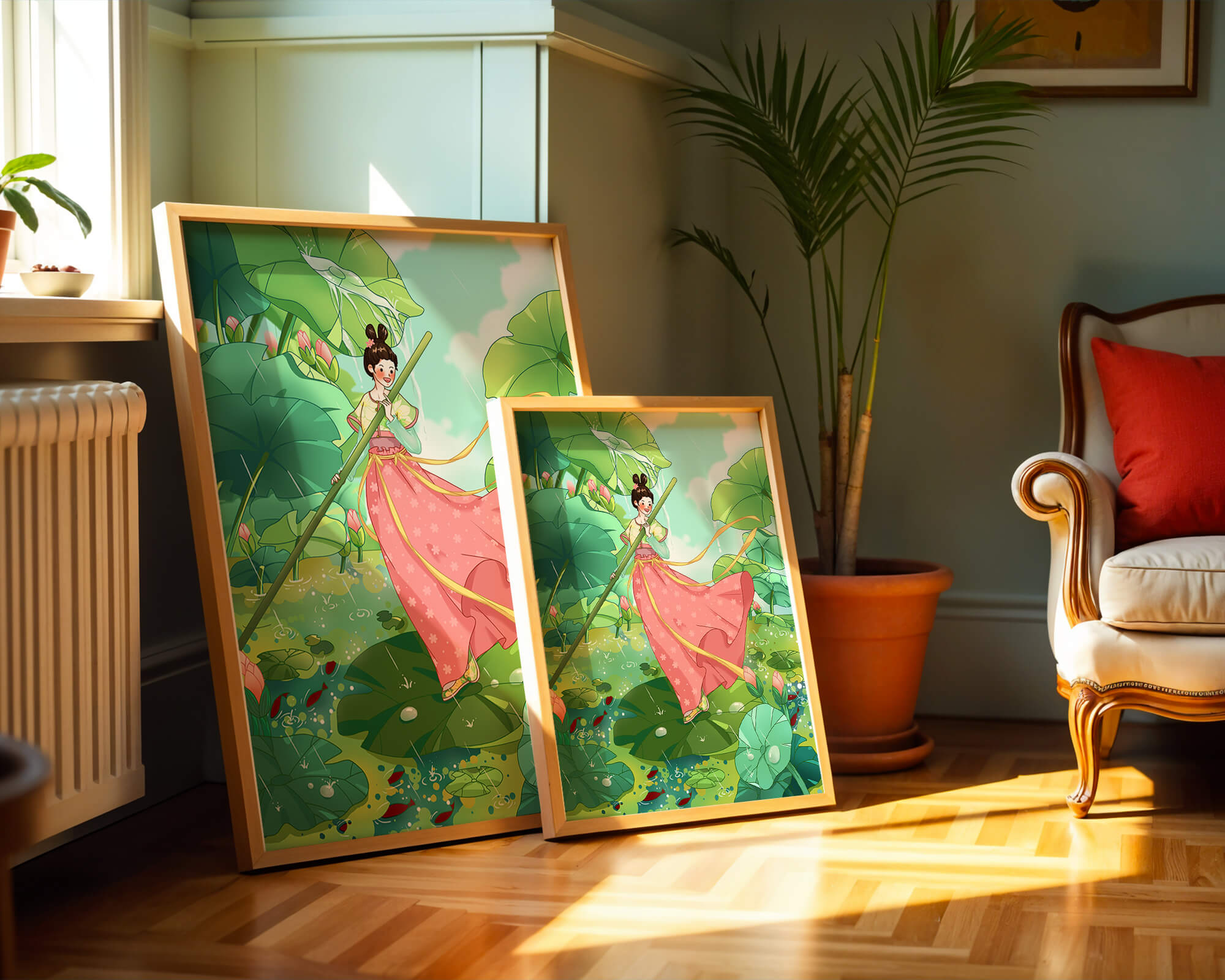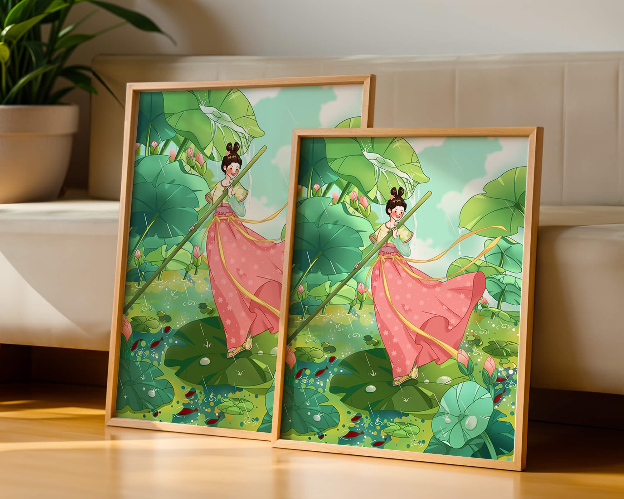 The scene is alive with color and vitality. The bright green leaves and the soft pink flowers create a stunning contrast against the clear blue sky. The young girl’s traditional dress adds an element of elegance and cultural richness to the setting, as she carefully steps along the gigantic leaves, her expression full of joy and curiosity.Water droplets gently cascade from the leaves, creating ripples in the water below where vibrant fish dart playfully between stems. This illustration evokes a sense of peace and wonder, inviting viewers to immerse themselves in its magical, serene environment.| Type |