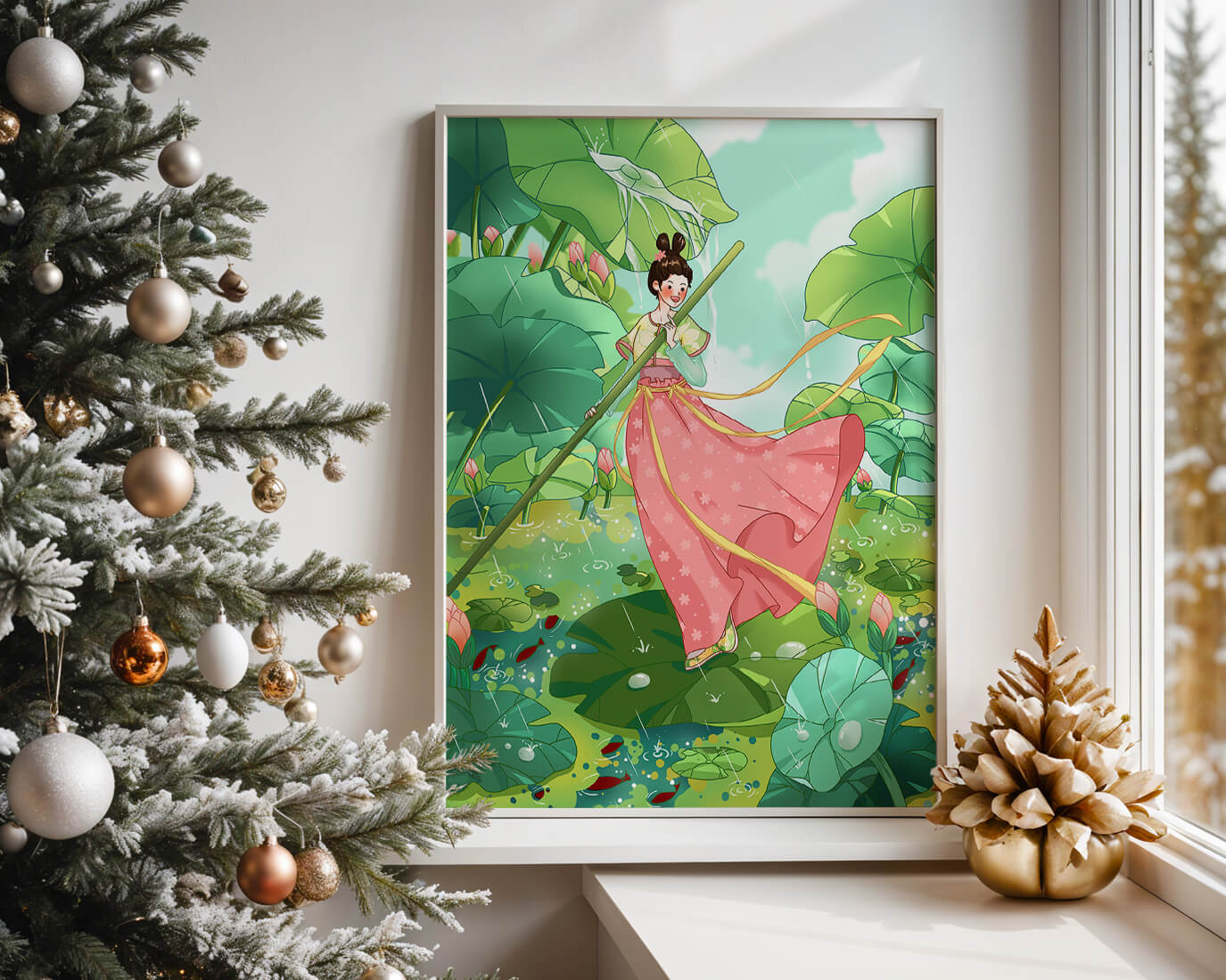 A whimsical scene of a girl in traditional dress among vibrant lotus leaves