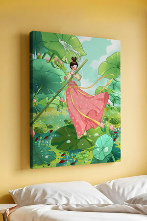 This enchanting artwork captures the essence of a vibrant, whimsical world where nature and fantasy intertwine. A young girl, dressed in traditional attire, gracefully navigates through a lush pond filled with large lotus leaves and delicate pink blossoms.