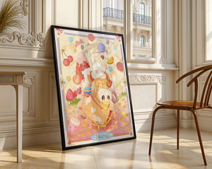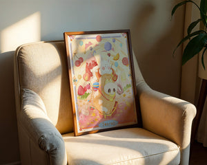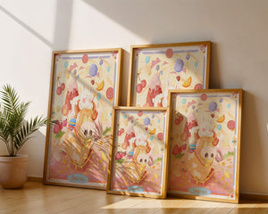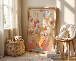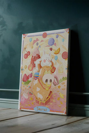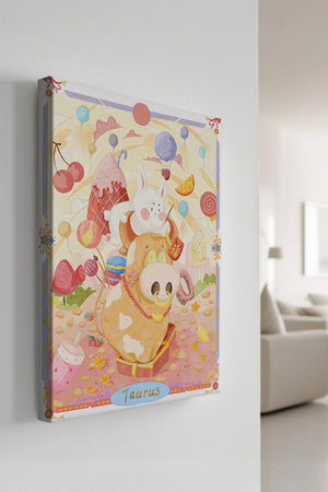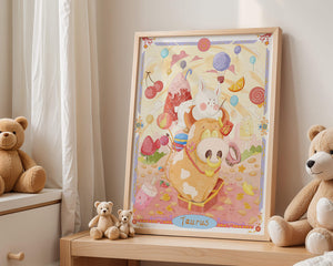 In this enchanting artwork, a happy rabbit enjoys a ride on the back of a friendly cow, setting the stage for a fantastical representation of the Taurus zodiac sign. Surrounding them are whimsical clouds and an array of sweet treats including ice cream, lollipops, and macarons, adding a sense of fun and imagination. Balloons and fruit elements float around, enhancing the dreamy and vibrant atmosphere.The illustration is styled with cheerful colors, predominantly pinks and yellows, creating a playful and endearing visual experience. This art piece is perfect for a nursery or childrens room, providing a lively and charming addition to any decor. Its fantasy elements and imaginative detail make it a captivating choice for those who appreciate zodiac-themed art and playful designs.| Type |