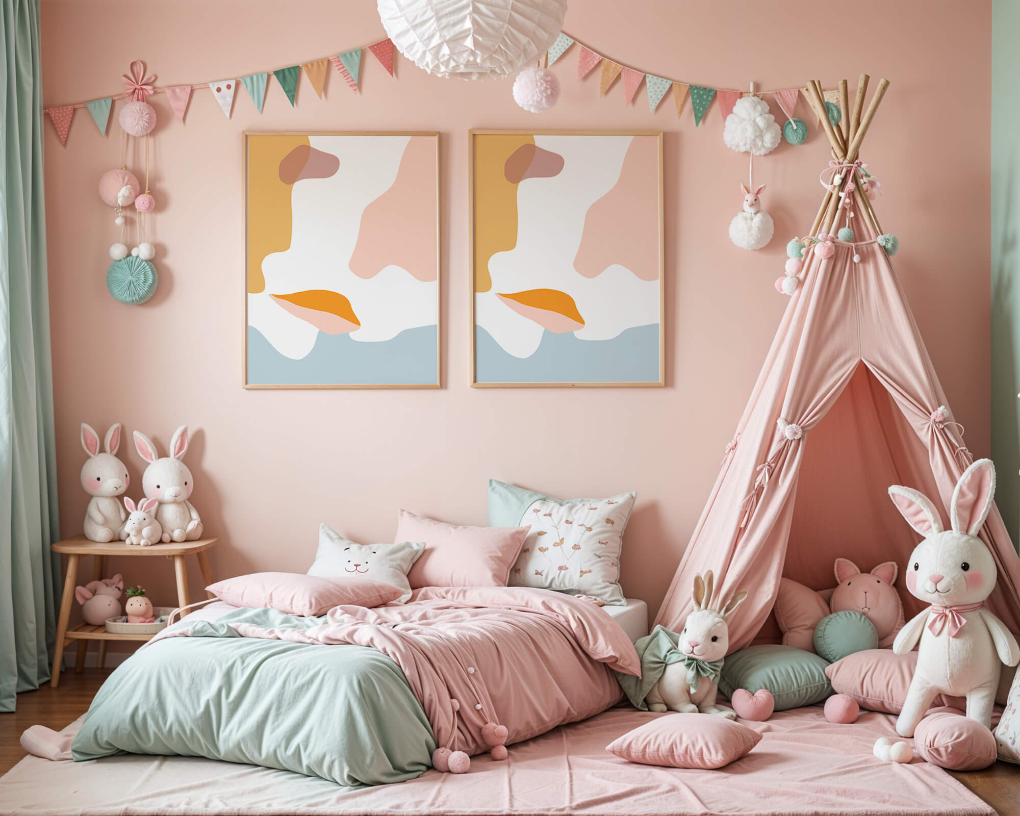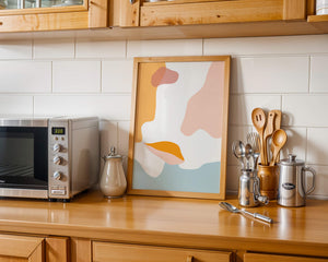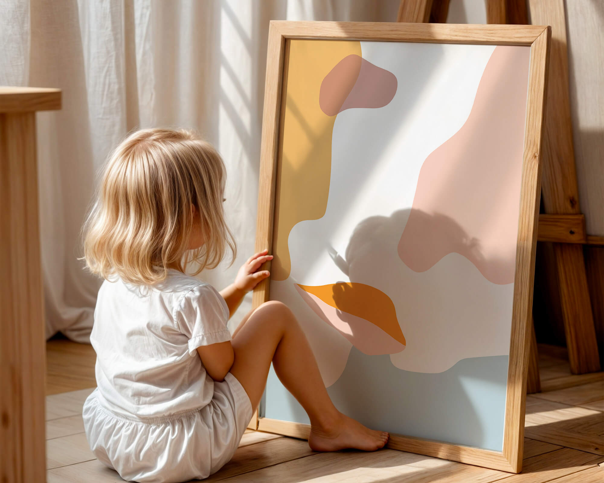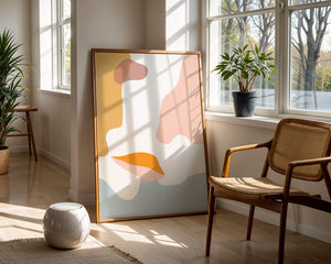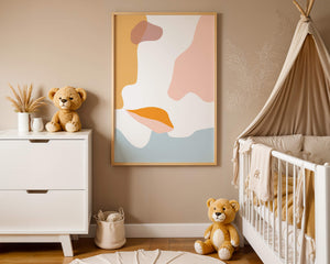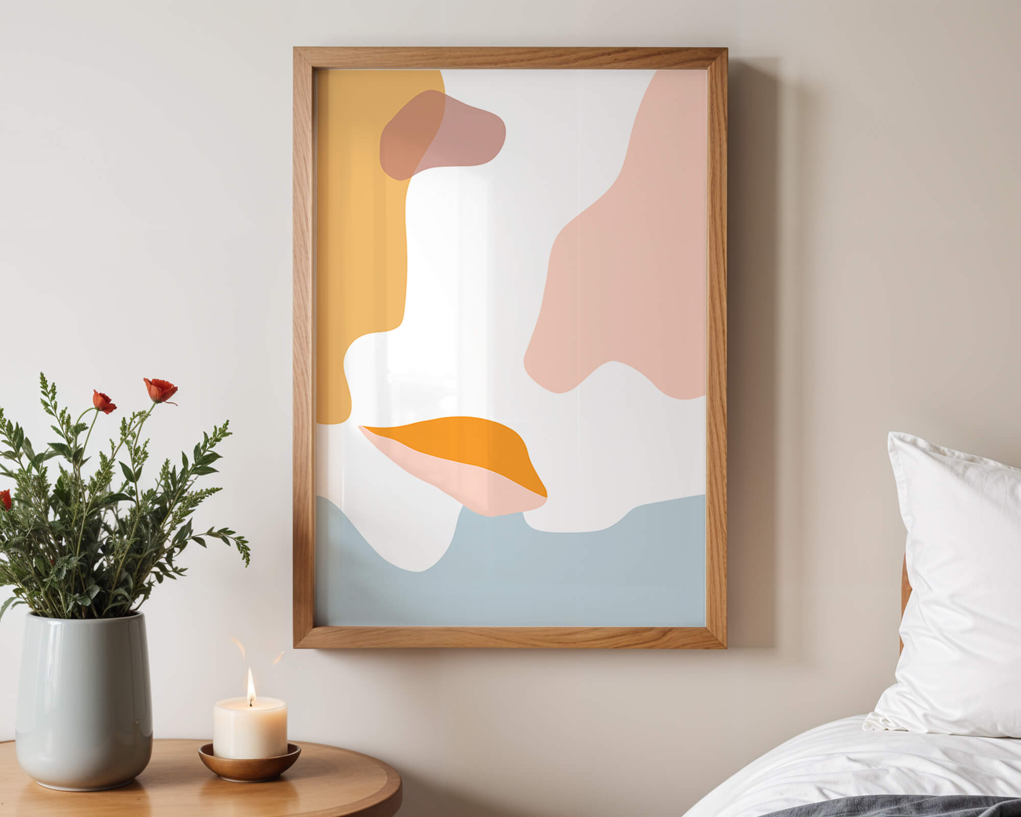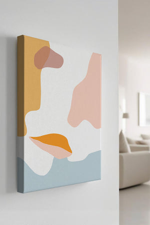 This image showcases an abstract art piece composed of various pastel color shapes on a white background. The fluid forms and soft hues create a calming and modern aesthetic, perfect for adding a touch of elegance to any space.
