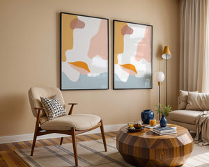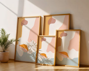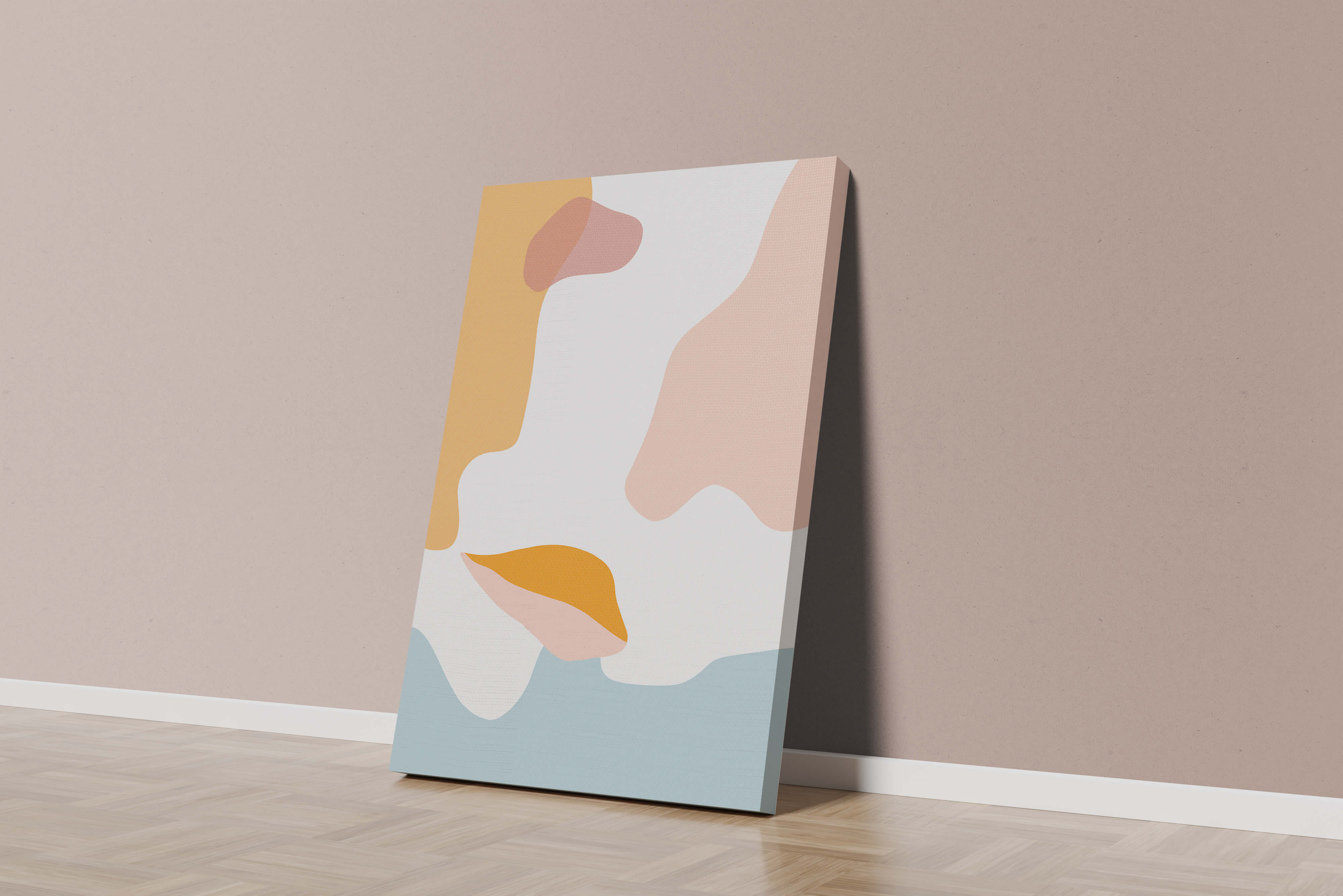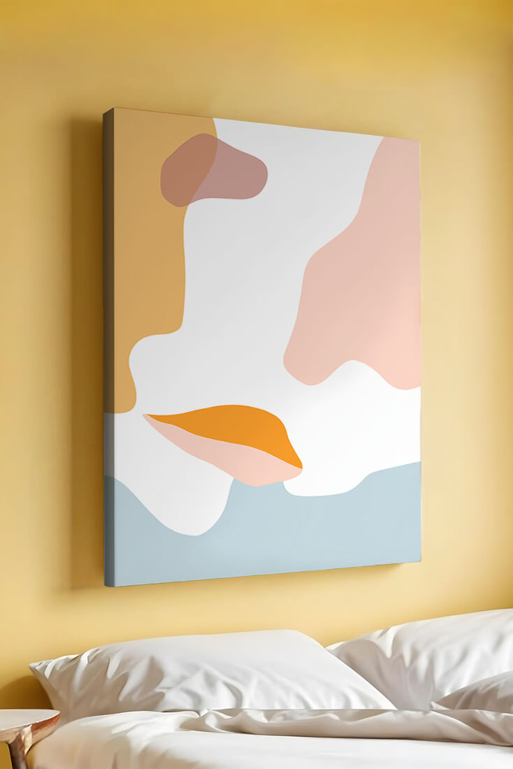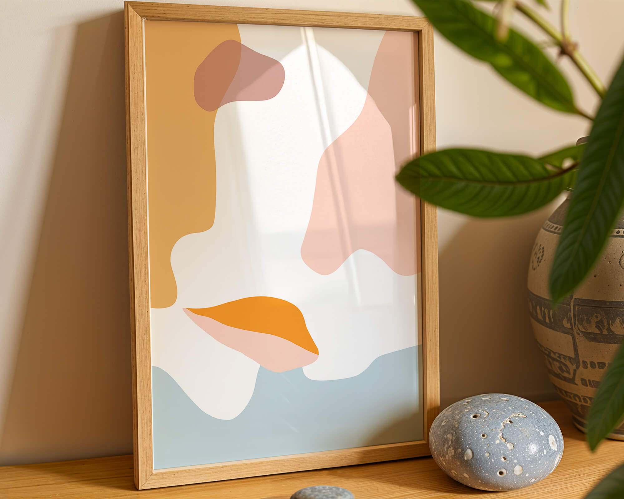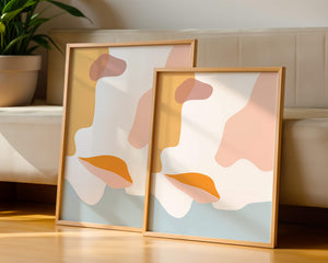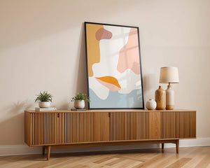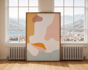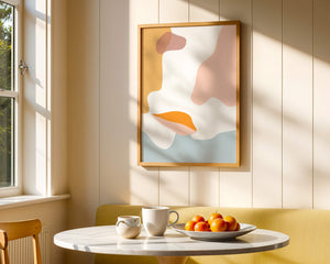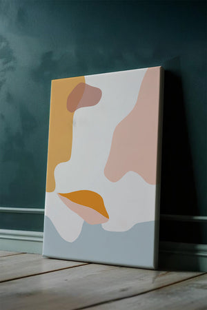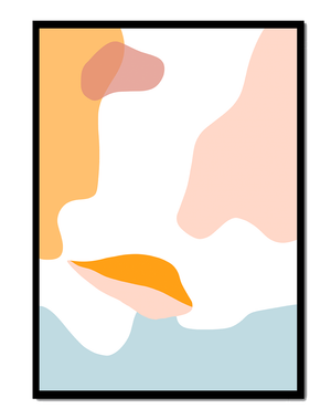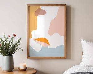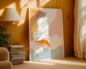 In this artwork, the interplay of various shapes and colors forms a visually harmonious composition. The use of pastel tones such as peach, orange, and beige against a white canvas delivers a sense of tranquility and simplicity. These colors and forms flow together, invoking a feeling of quiet elegance that draws in the viewers eye.Ideal for modern and minimalist spaces, this abstract art piece can enhance a variety of environments, from living rooms to offices. The balance of soft colors and shapes creates a soothing atmosphere, making it a perfect choice for anyone looking to introduce a subtle yet distinct artistic flair into their décor.