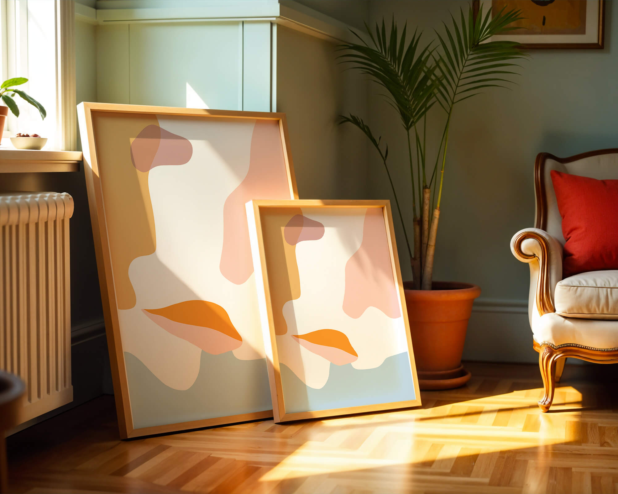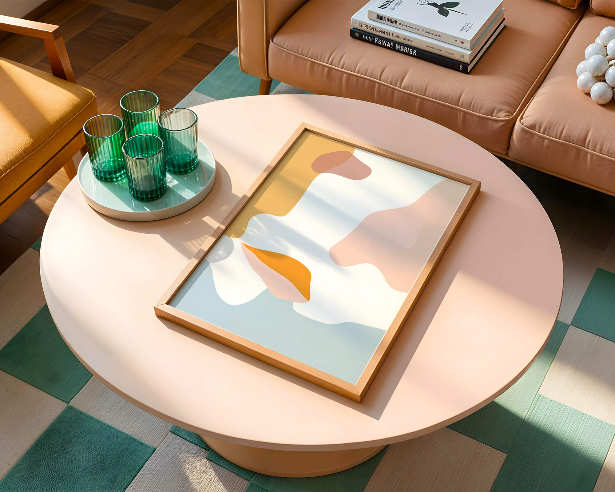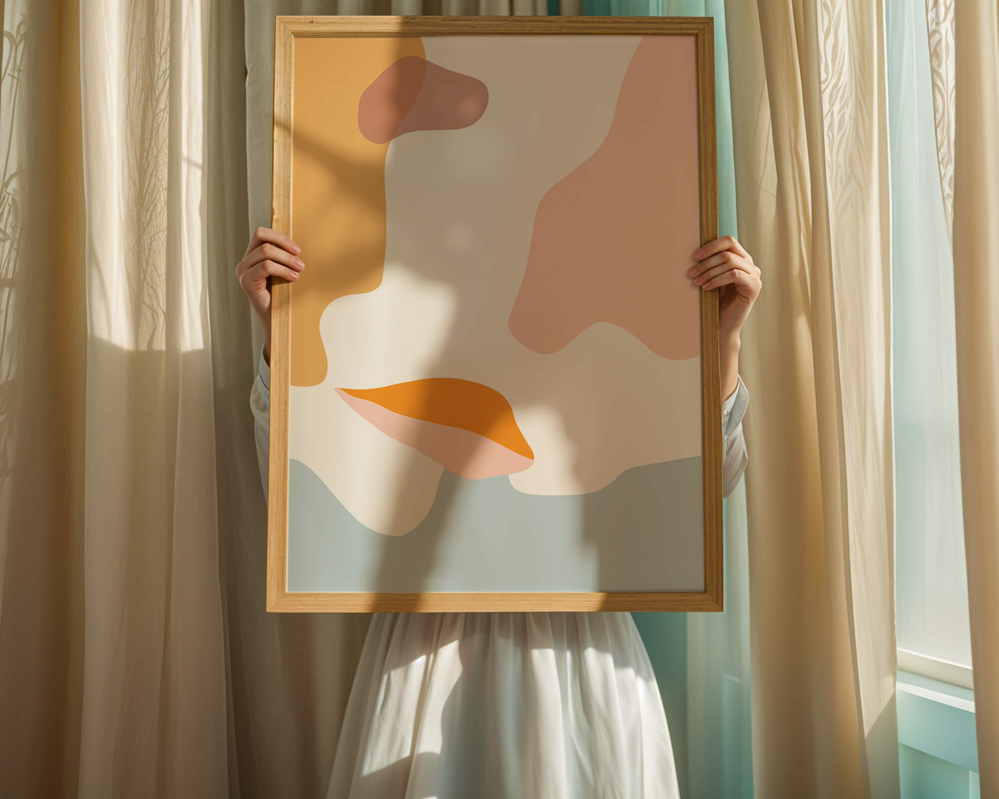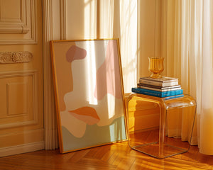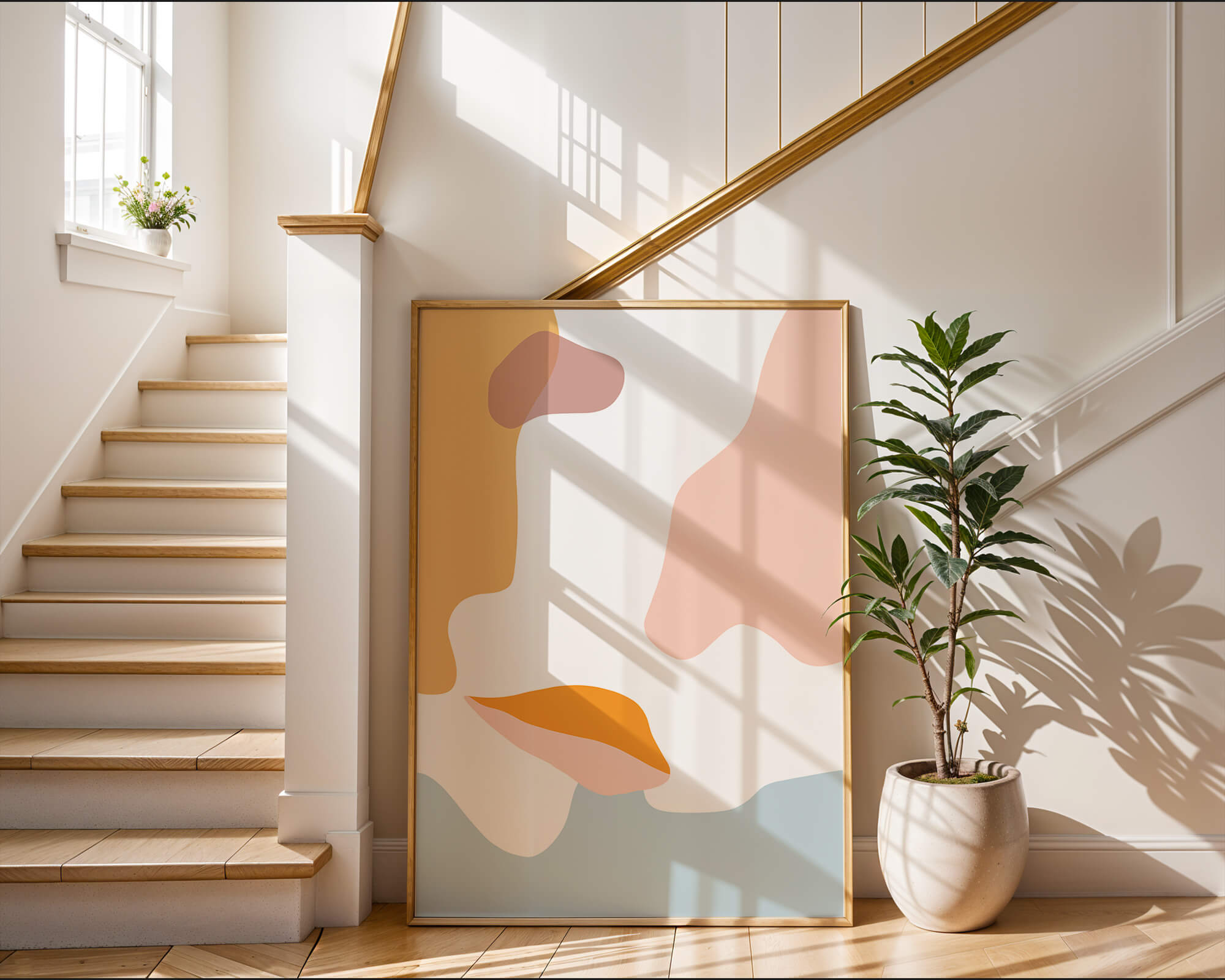 In this artwork, the interplay of various shapes and colors forms a visually harmonious composition. The use of pastel tones such as peach, orange, and beige against a white canvas delivers a sense of tranquility and simplicity. These colors and forms flow together, invoking a feeling of quiet elegance that draws in the viewers eye.Ideal for modern and minimalist spaces, this abstract art piece can enhance a variety of environments, from living rooms to offices. The balance of soft colors and shapes creates a soothing atmosphere, making it a perfect choice for anyone looking to introduce a subtle yet distinct artistic flair into their décor.