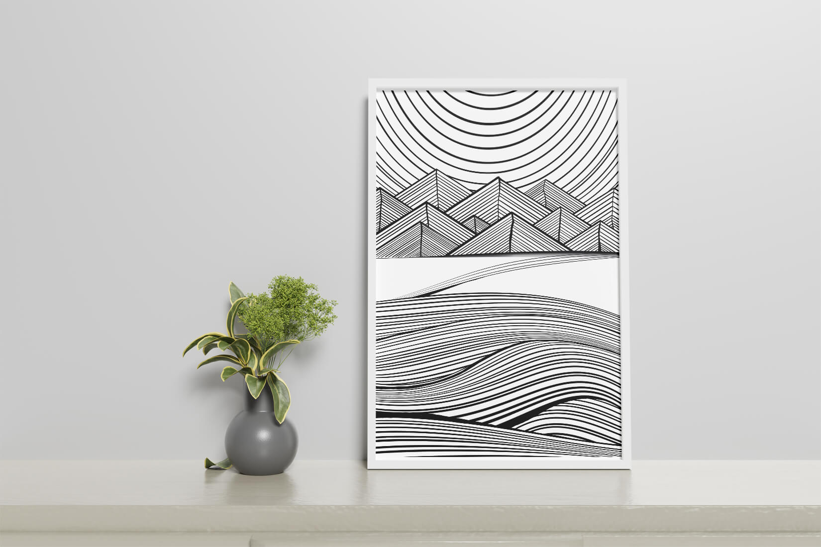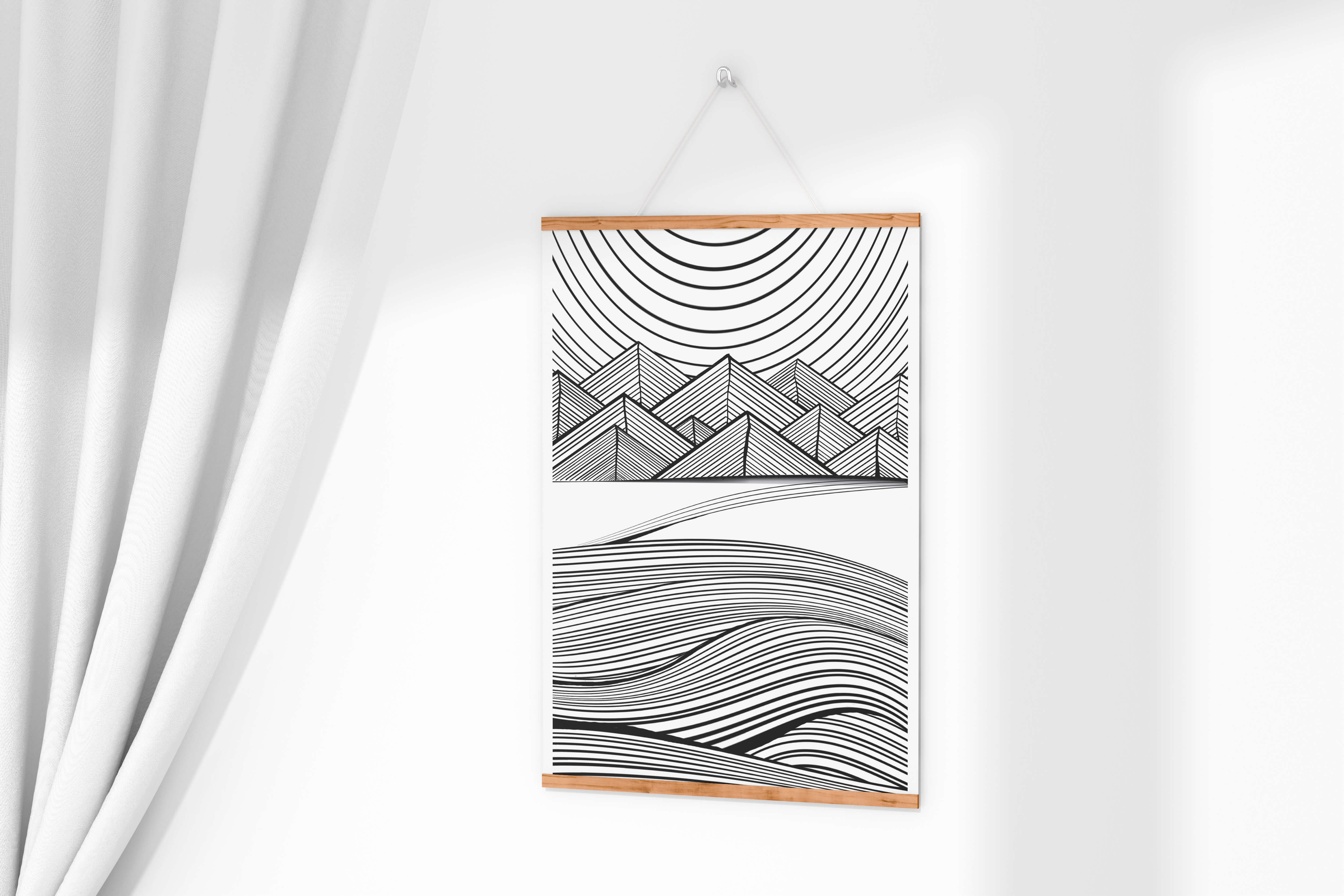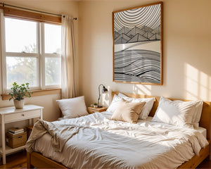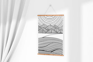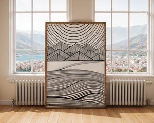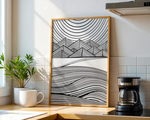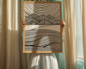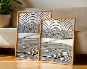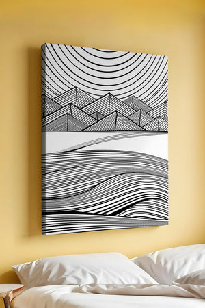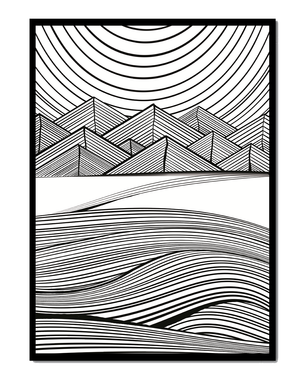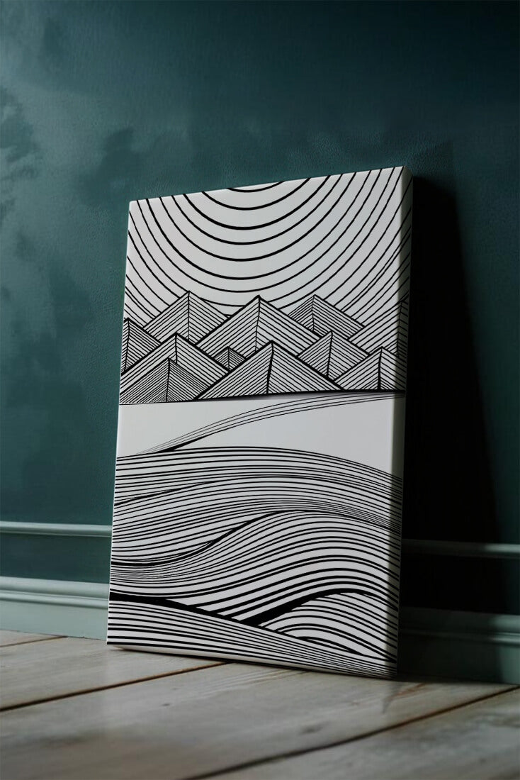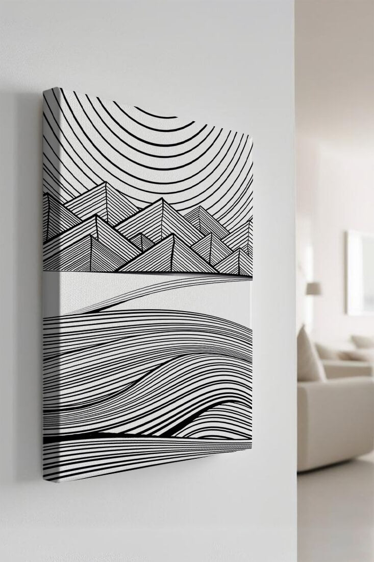 This artwork presents a striking interplay of lines and geometric shapes, creating a landscape that is both dynamic and harmonious. The use of black and white enhances the contrast and boldness of the design, drawing the viewer into its intricate patterns. The top section features triangular and angular shapes, forming a mountain-like silhouette, while the bottom half displays flowing curved lines, reminiscent of a serene landscape. The design appeals to those who appreciate modern minimalism, with its clean lines and sophisticated structure. Its abstract nature invites multiple interpretations, offering a versatile element for contemporary interior decor. The artwork serves as a powerful visual statement, perfect for adding a touch of elegance and creativity to any space.
