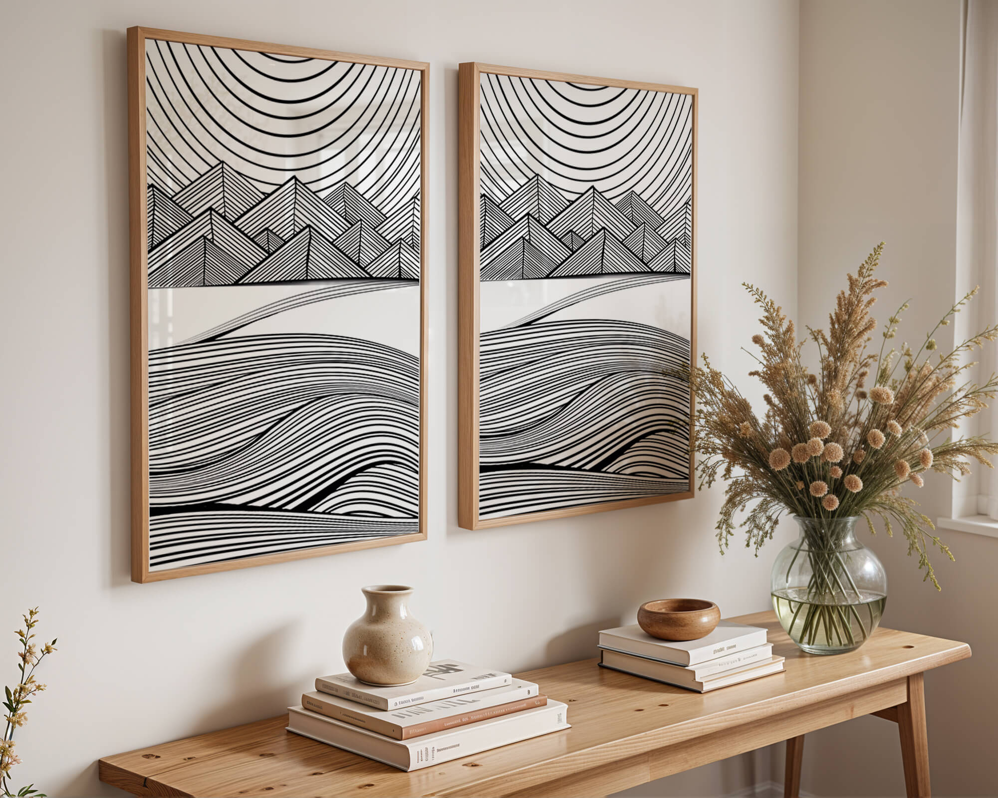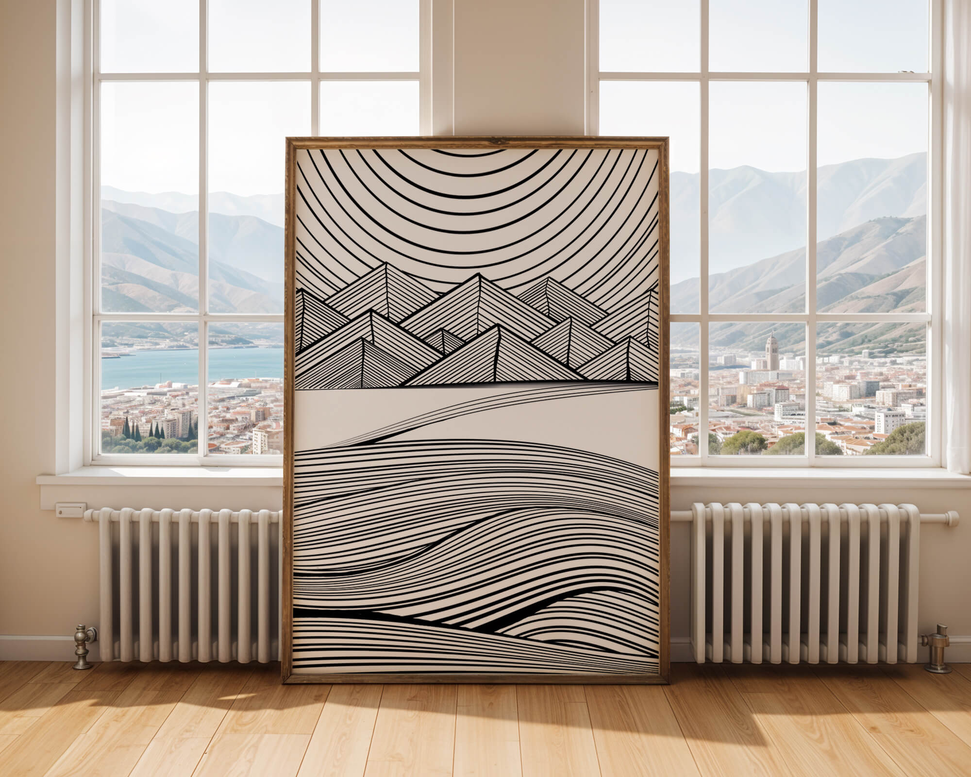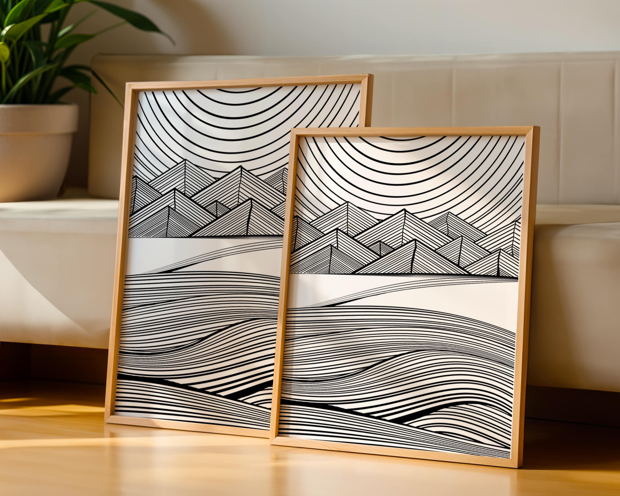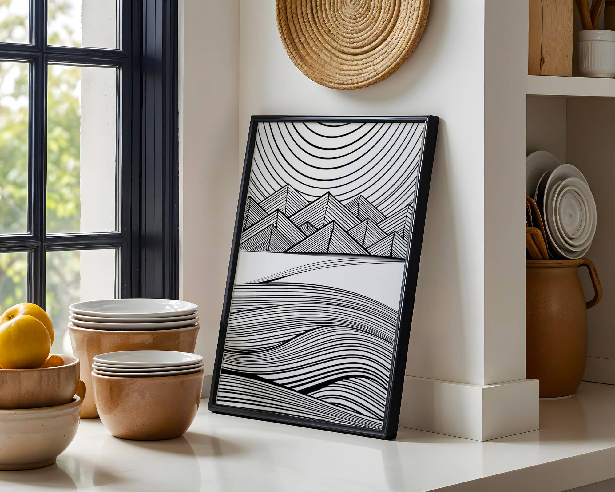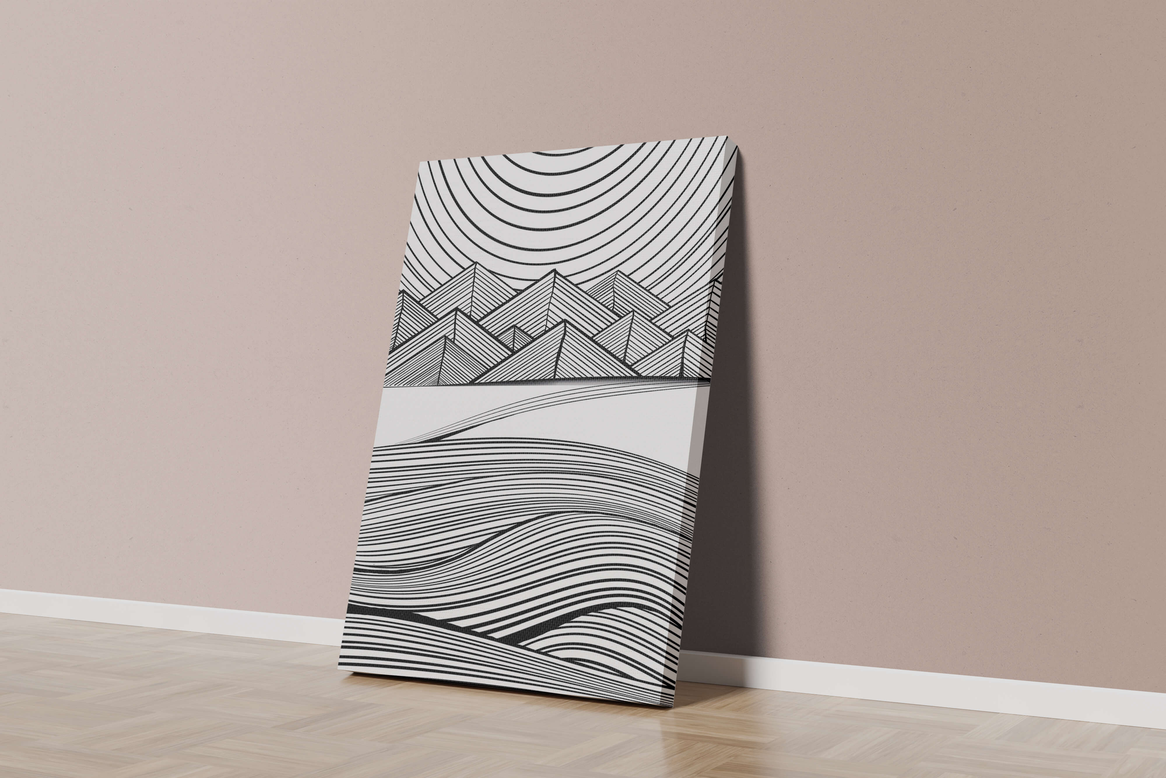 This artwork presents a striking interplay of lines and geometric shapes, creating a landscape that is both dynamic and harmonious. The use of black and white enhances the contrast and boldness of the design, drawing the viewer into its intricate patterns. The top section features triangular and angular shapes, forming a mountain-like silhouette, while the bottom half displays flowing curved lines, reminiscent of a serene landscape. The design appeals to those who appreciate modern minimalism, with its clean lines and sophisticated structure. Its abstract nature invites multiple interpretations, offering a versatile element for contemporary interior decor. The artwork serves as a powerful visual statement, perfect for adding a touch of elegance and creativity to any space.