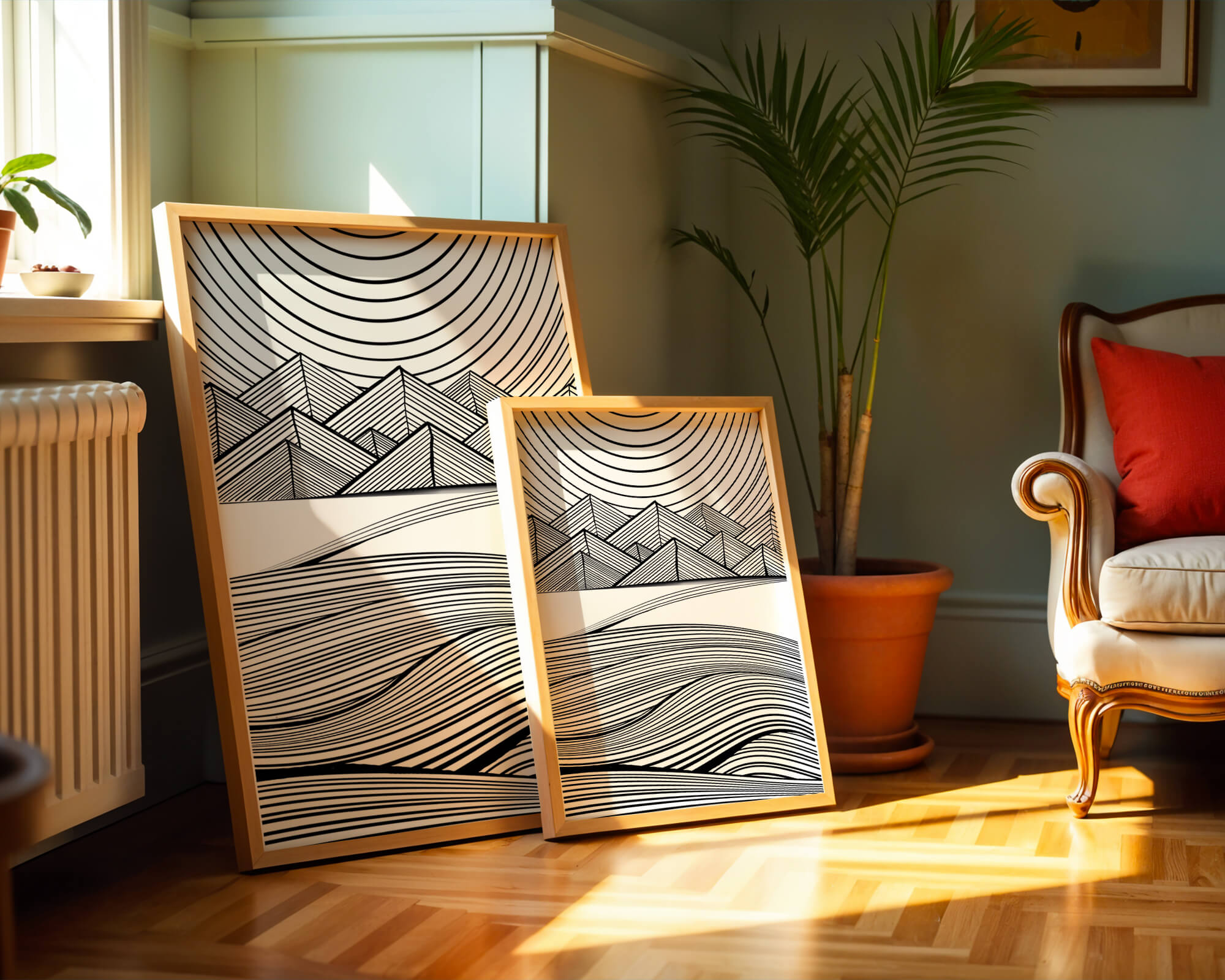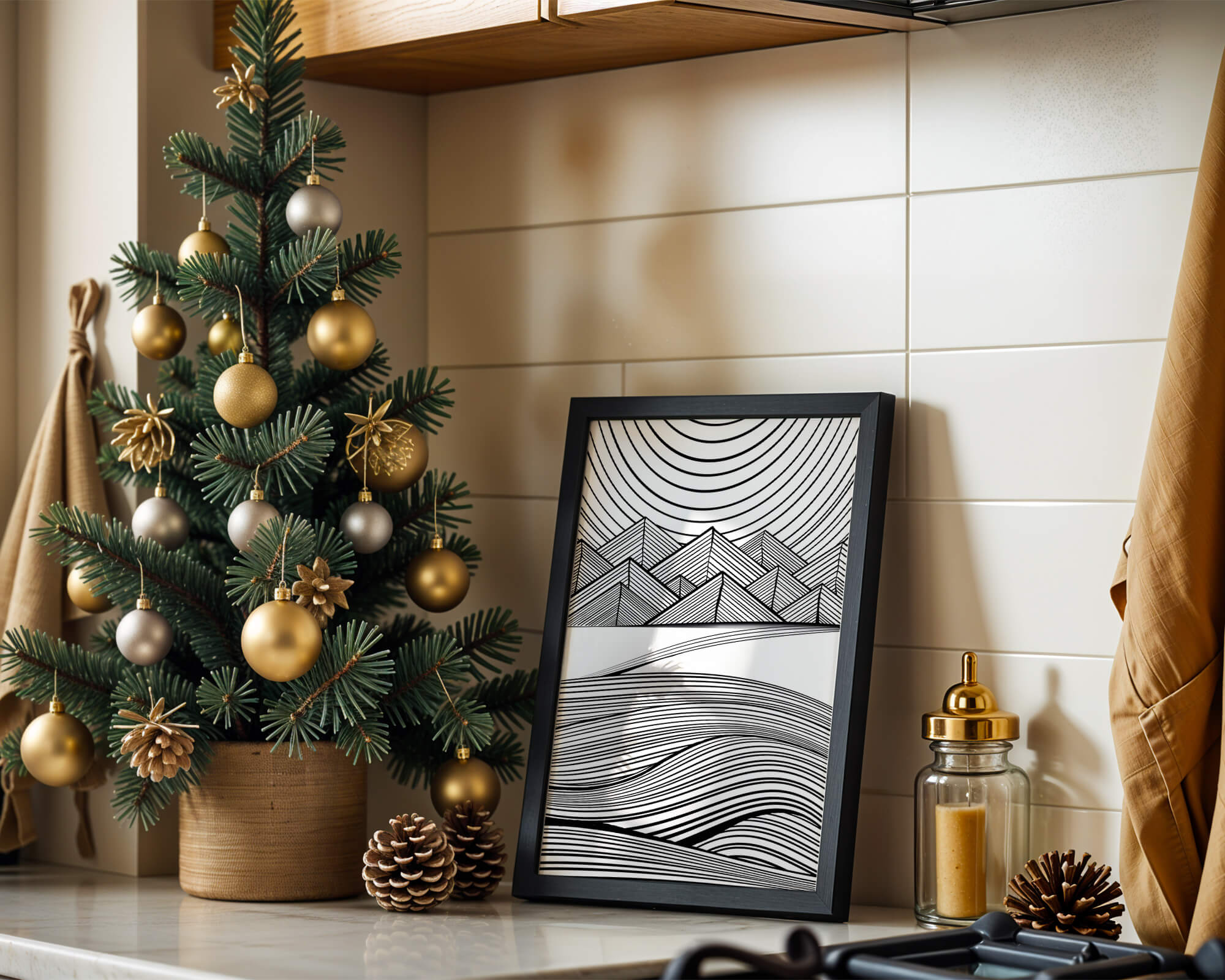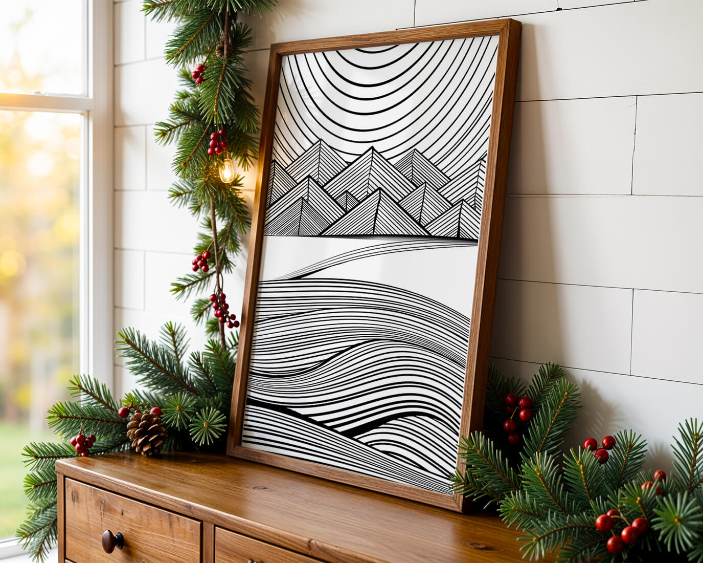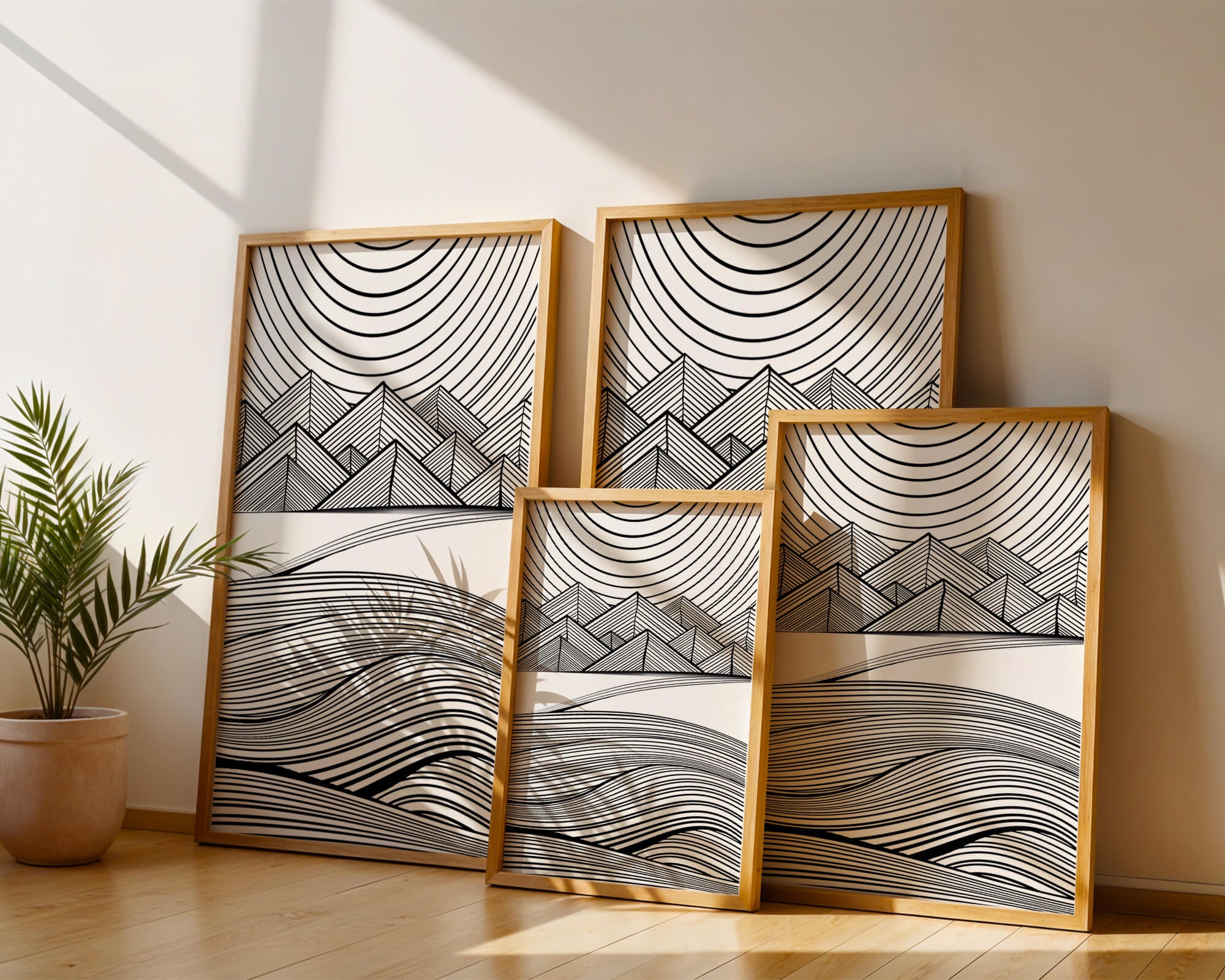 This artwork presents a striking interplay of lines and geometric shapes, creating a landscape that is both dynamic and harmonious. The use of black and white enhances the contrast and boldness of the design, drawing the viewer into its intricate patterns. The top section features triangular and angular shapes, forming a mountain-like silhouette, while the bottom half displays flowing curved lines, reminiscent of a serene landscape. The design appeals to those who appreciate modern minimalism, with its clean lines and sophisticated structure. Its abstract nature invites multiple interpretations, offering a versatile element for contemporary interior decor. The artwork serves as a powerful visual statement, perfect for adding a touch of elegance and creativity to any space.