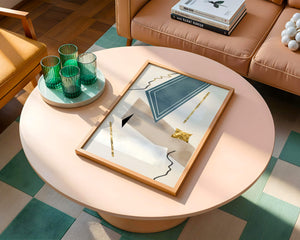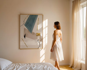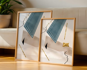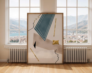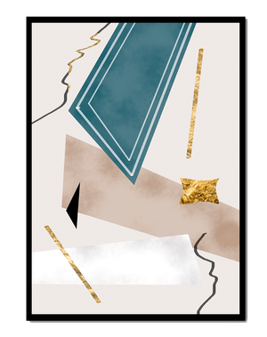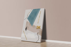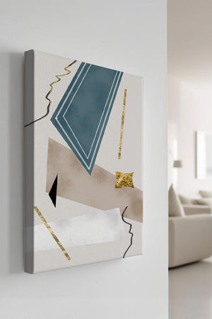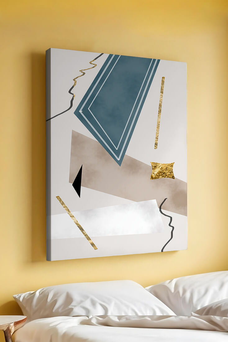 The design reflects a contemporary style, where sharp angles and smooth curves interlace seamlessly on the canvas. The presence of gold details adds a touch of luxury and sophistication, making it an ideal piece for modern interior spaces like living rooms or offices.Incorporating this artwork into a space can elevate the decor, introduce a sense of creativity, and offer a focal point that draws attention. Adaptable and versatile, it complements both minimalist and eclectic styles.