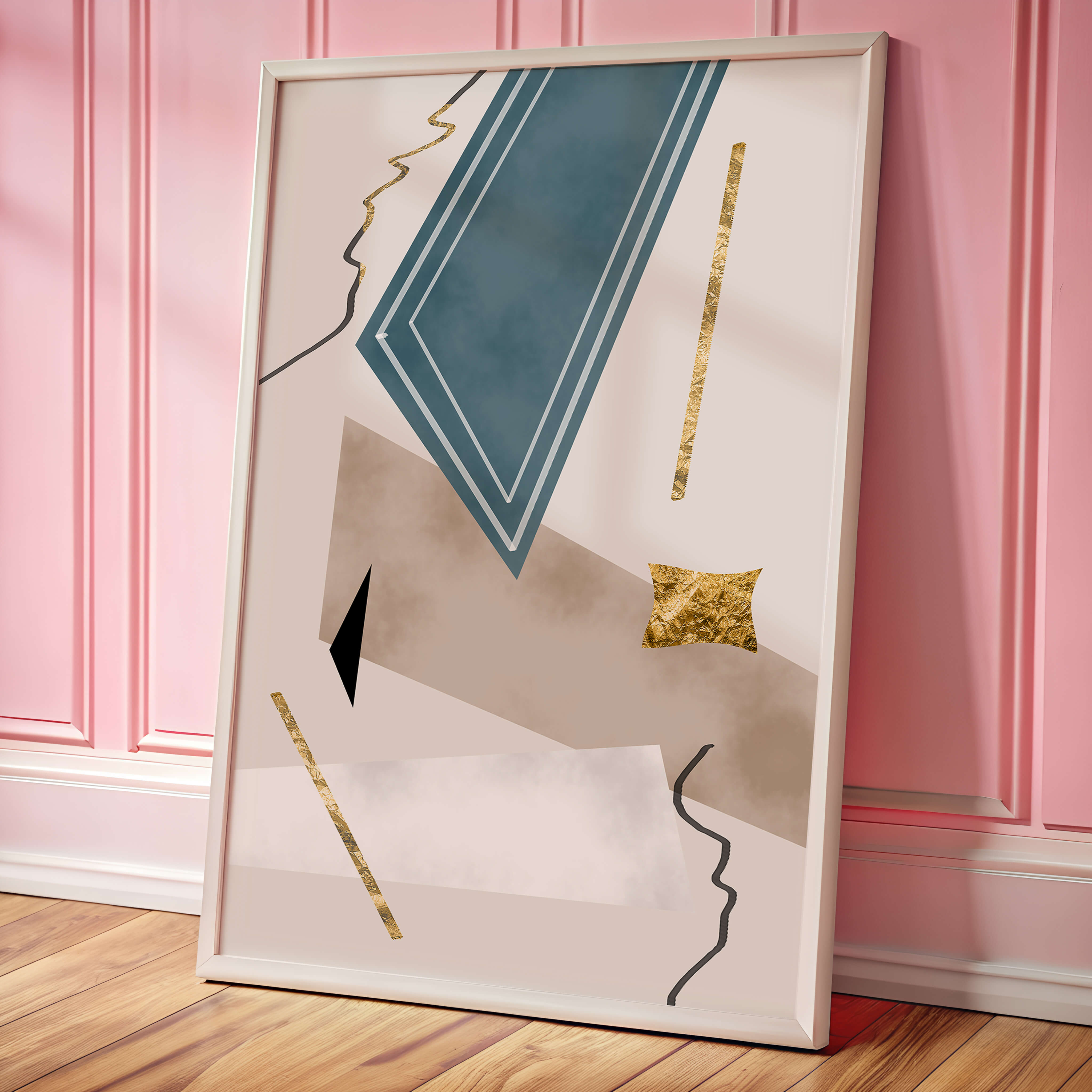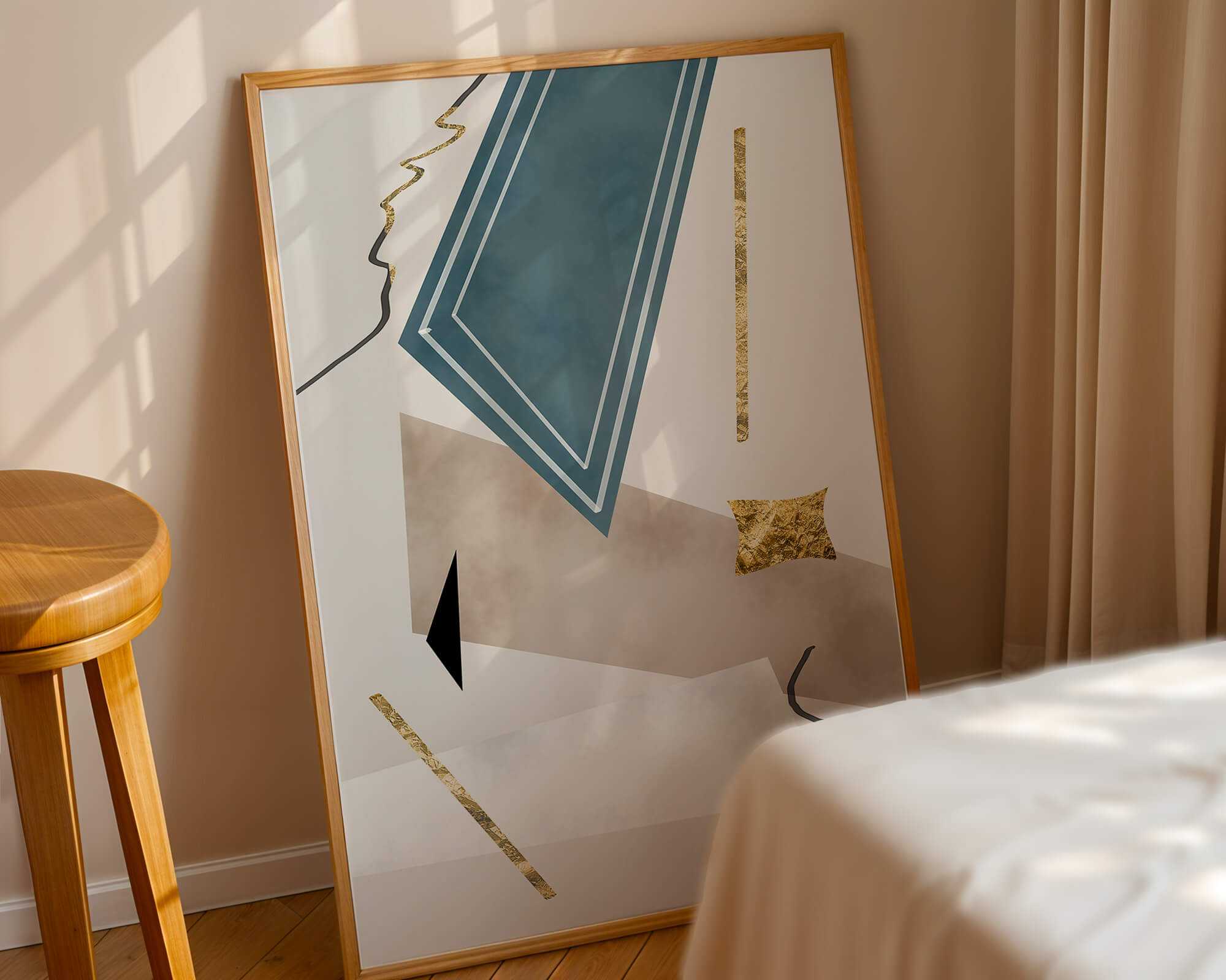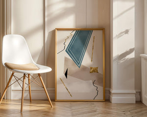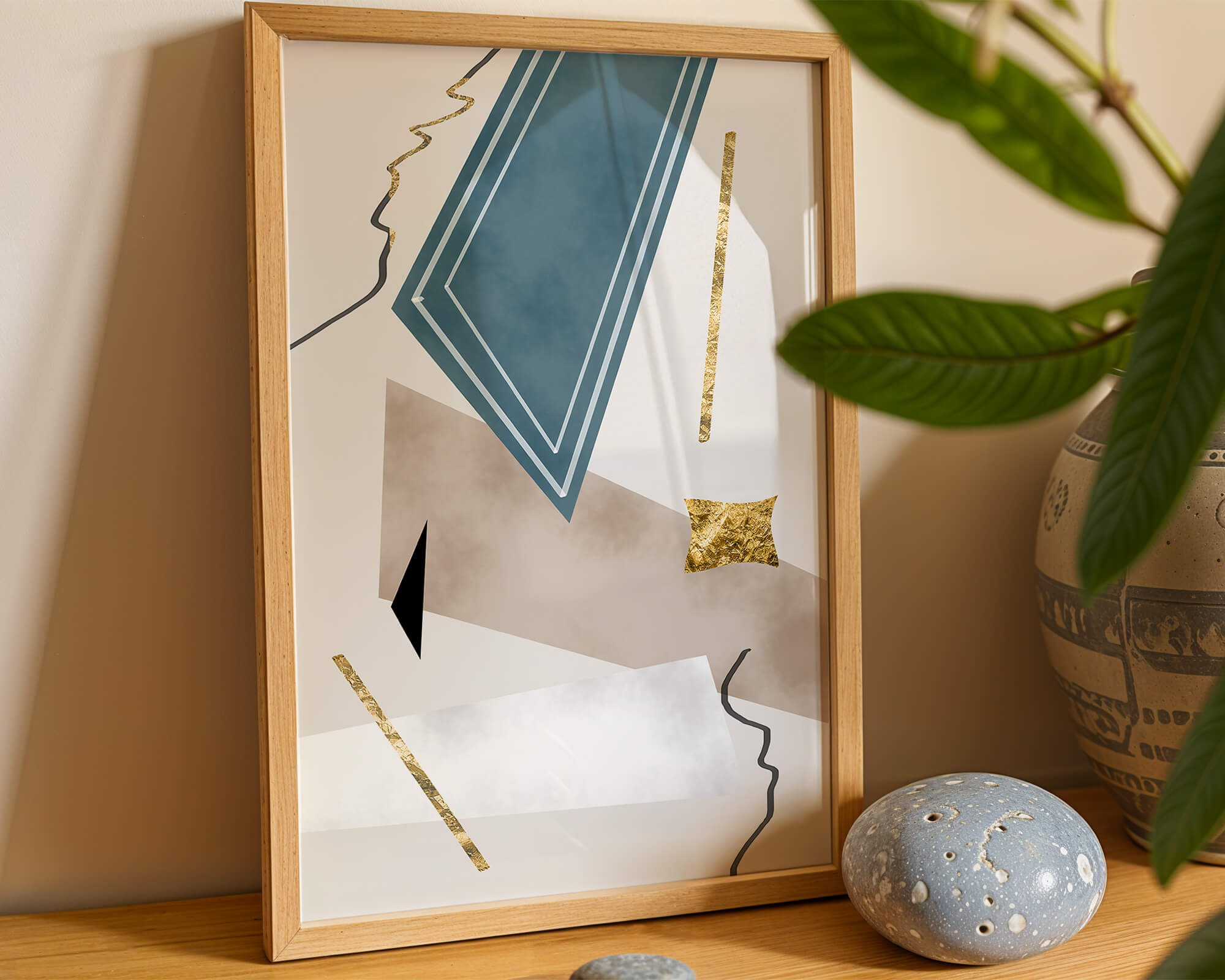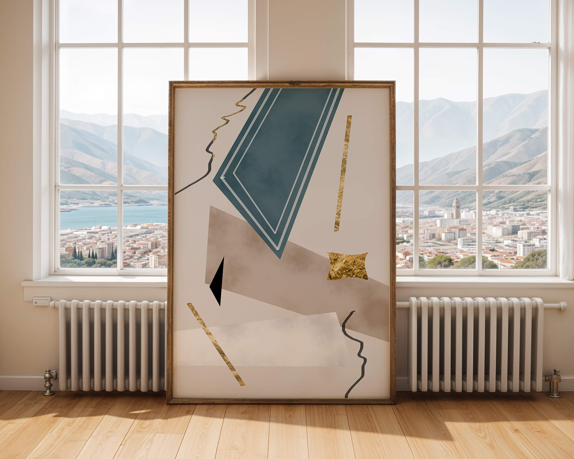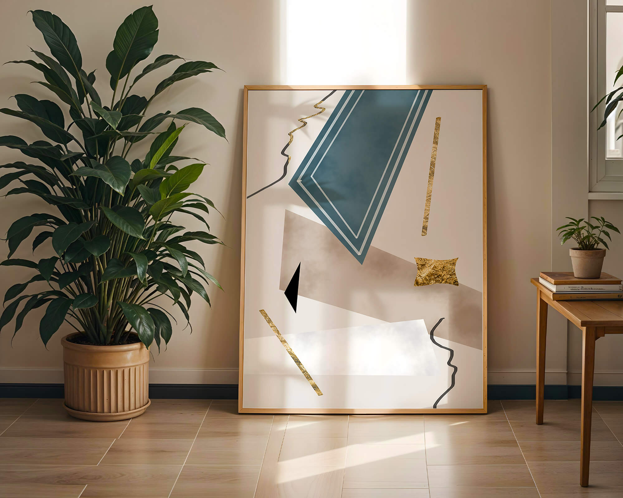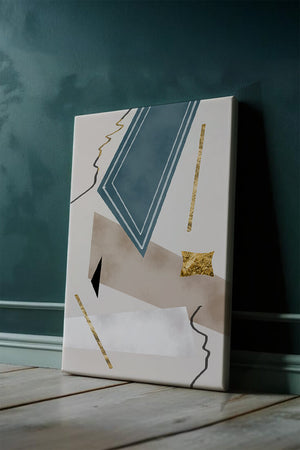 This abstract image is a striking artwork featuring a dynamic composition of geometric shapes and gold accents. The arrangement utilizes a color palette dominated by blues, beiges, and whites, creating a harmonious and elegant visual experience.