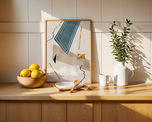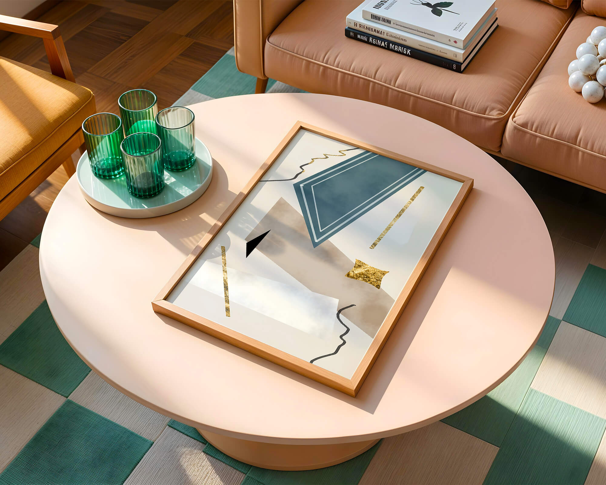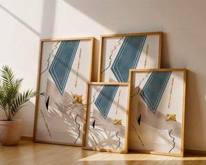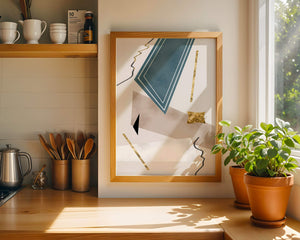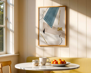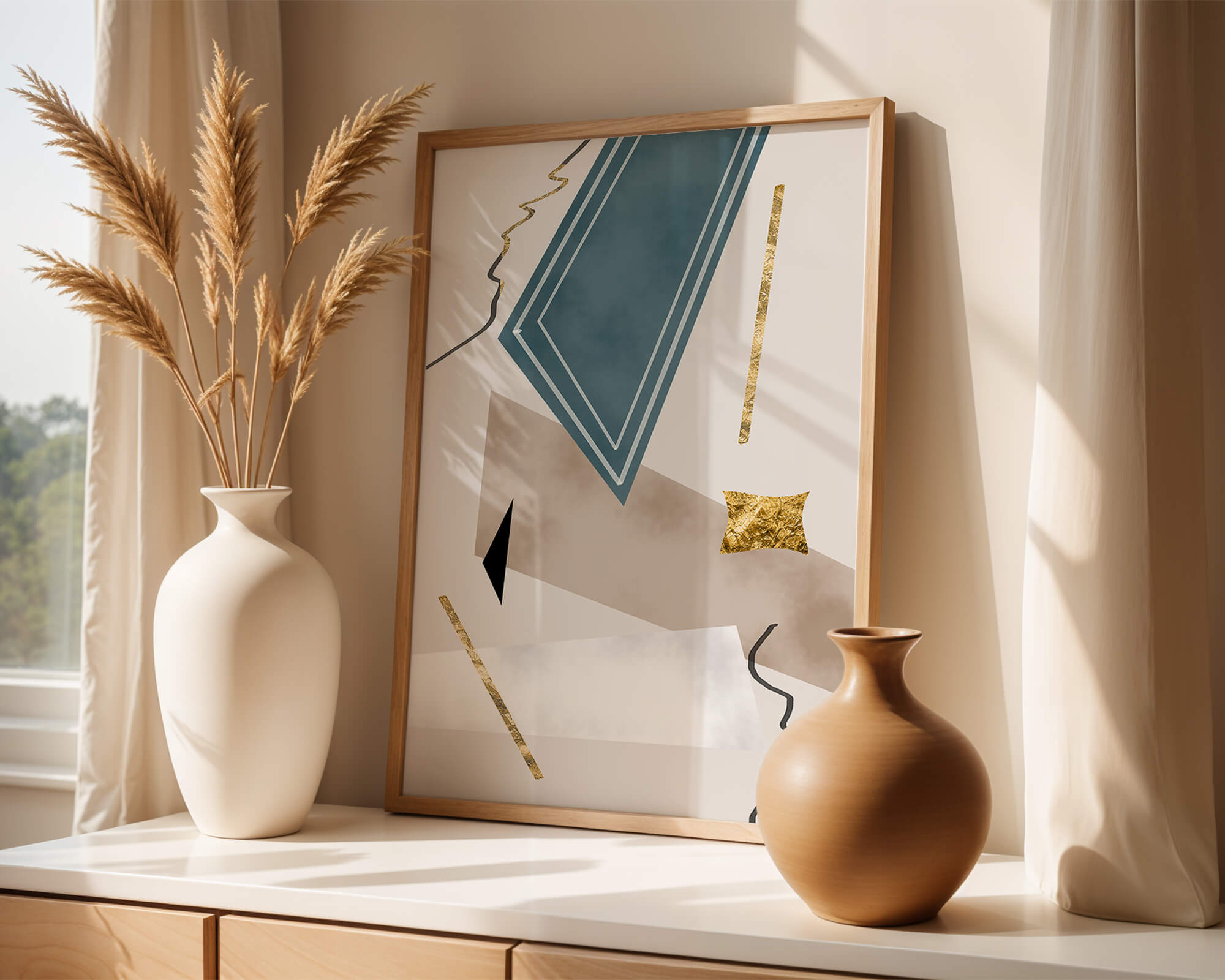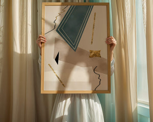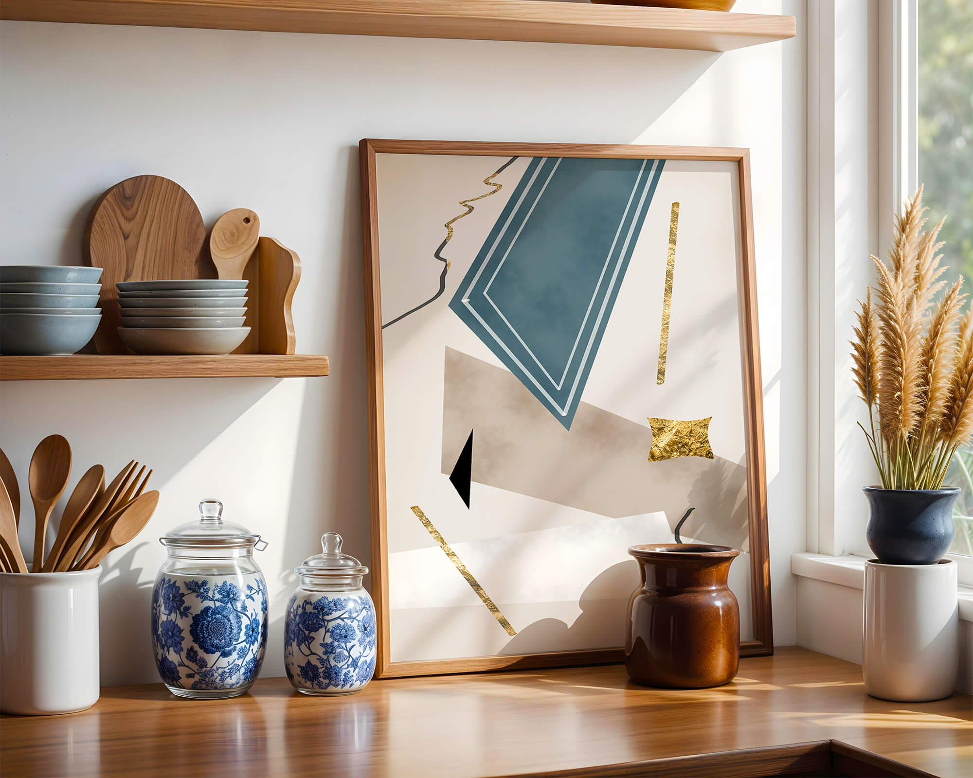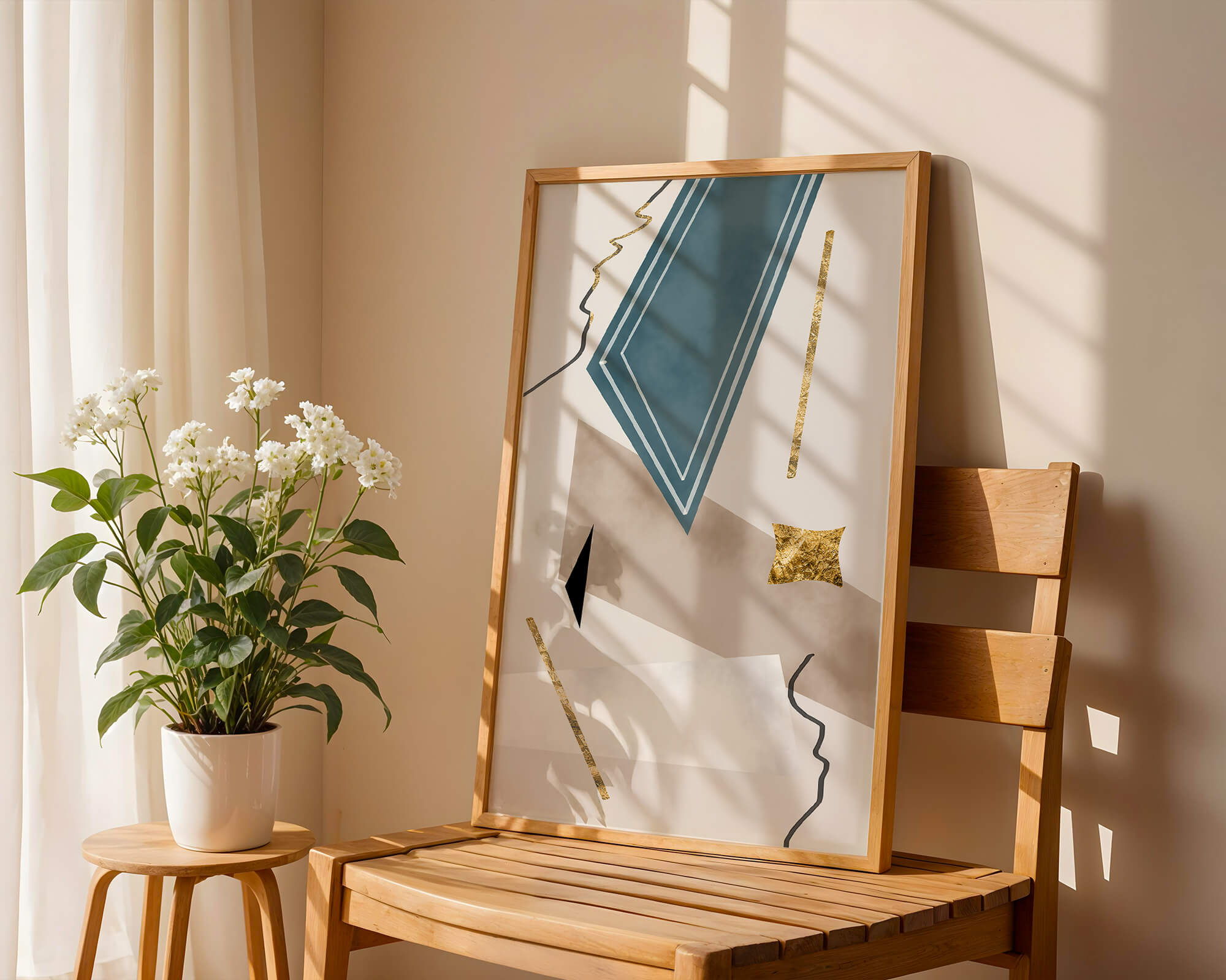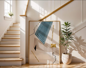 This abstract image is a striking artwork featuring a dynamic composition of geometric shapes and gold accents. The arrangement utilizes a color palette dominated by blues, beiges, and whites, creating a harmonious and elegant visual experience.