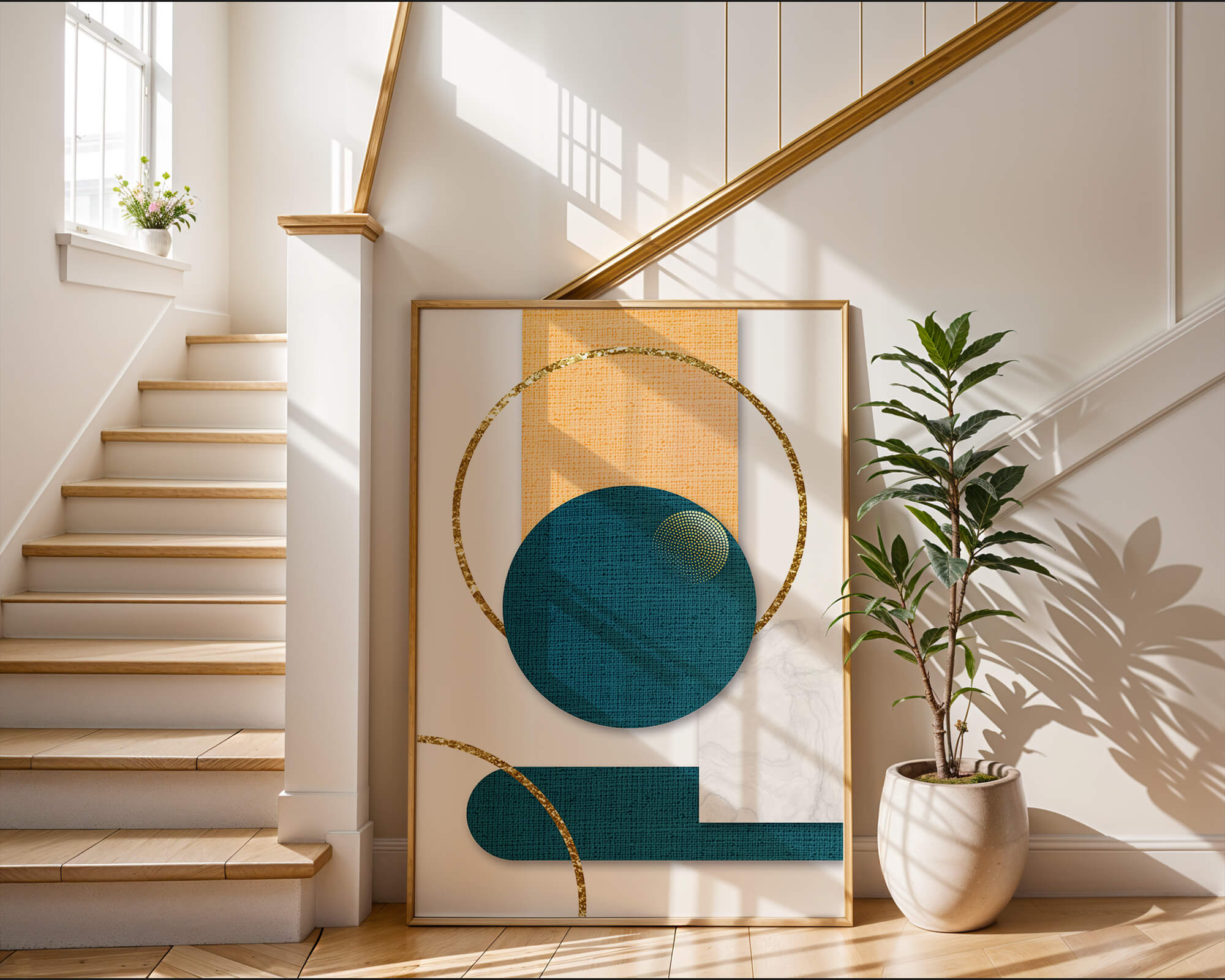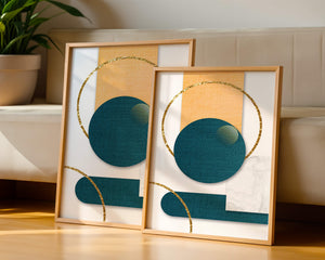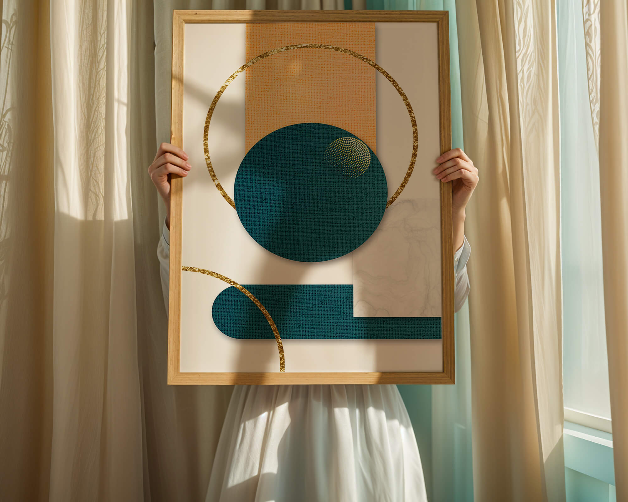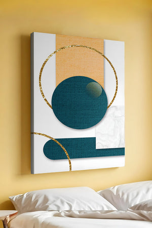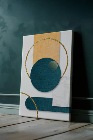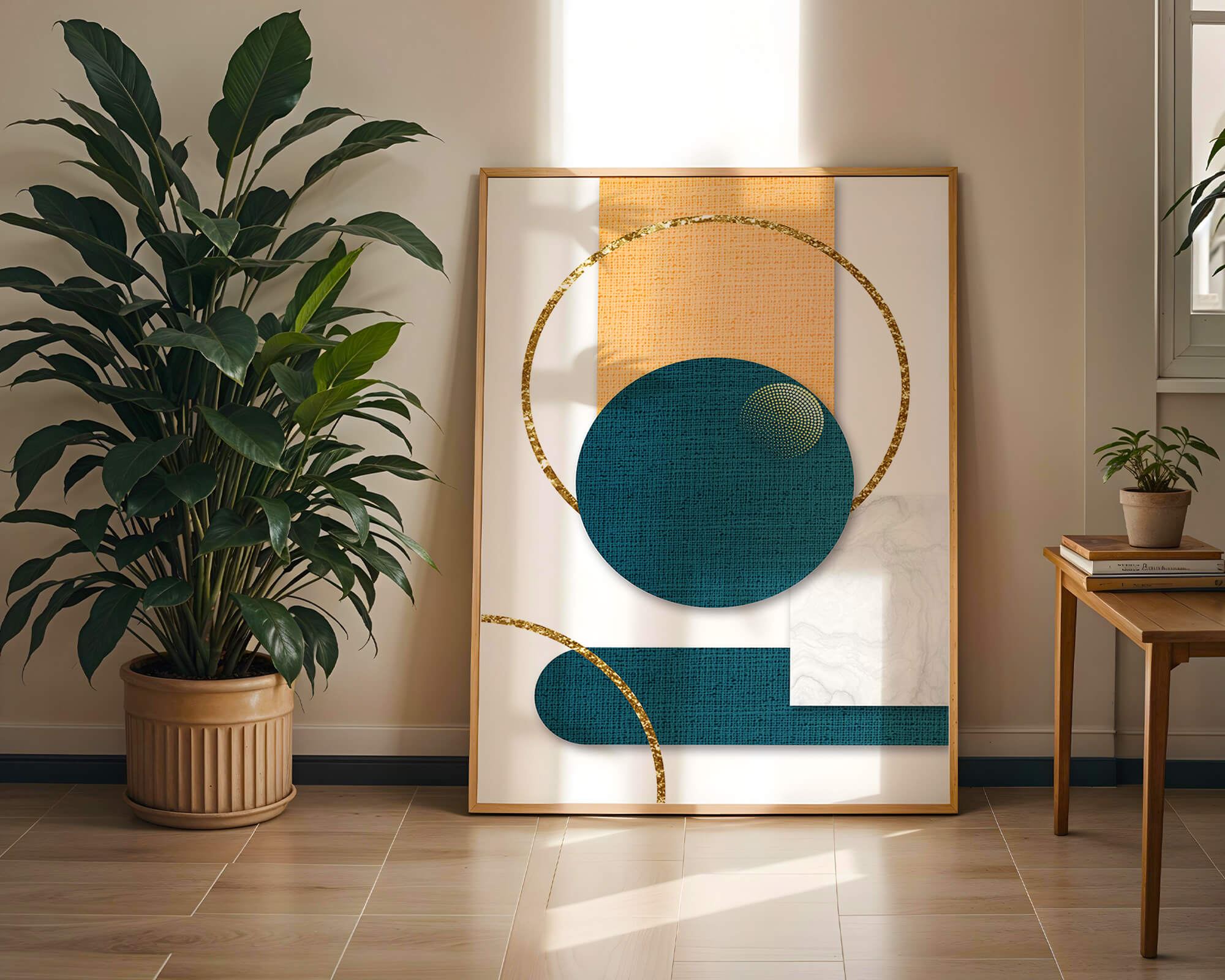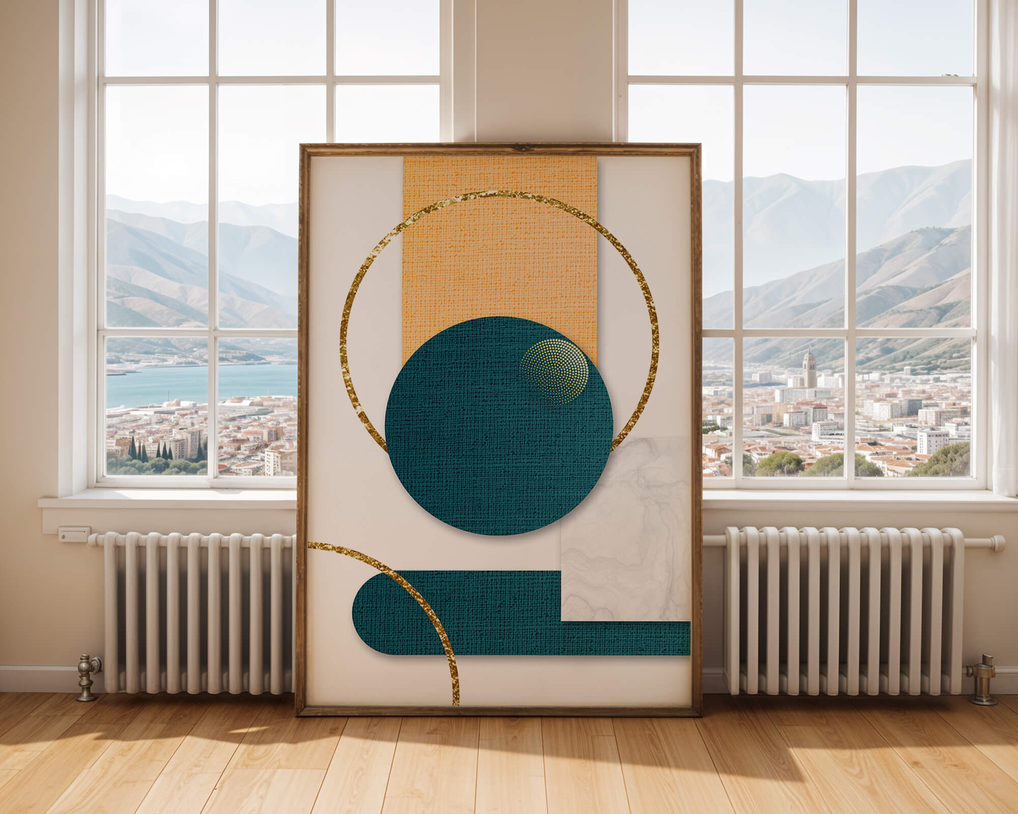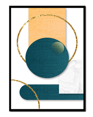 This image showcases an abstract geometric composition that blends various textures and colors to create a visually striking art piece. It combines rich gold accents with deep teal and marble textures, offering a luxurious and modern aesthetic. The use of geometric shapes like circles and rectangles, alongside textured patterns, adds depth and intrigue. The gold elements add a touch of elegance and sophistication, making this artwork suitable for enhancing the ambiance in both home and office settings. Whether displayed in a living room, bedroom, or study, it adds a contemporary and stylish flair to any space.
