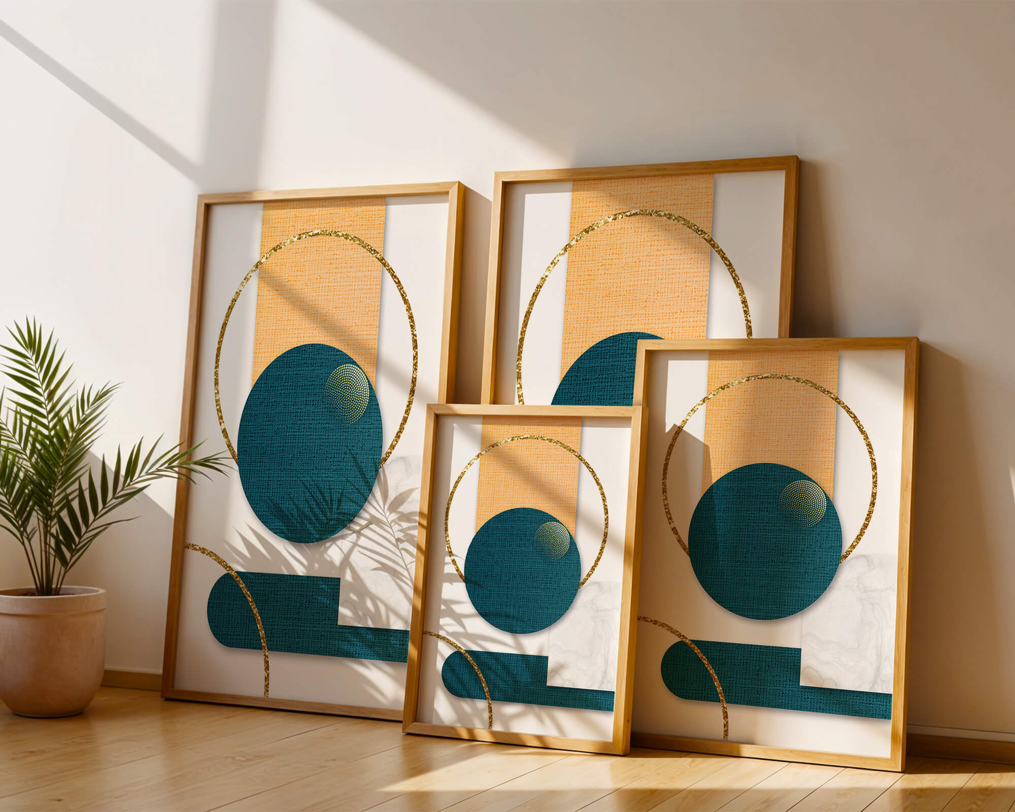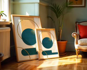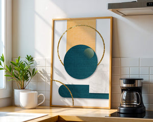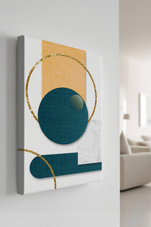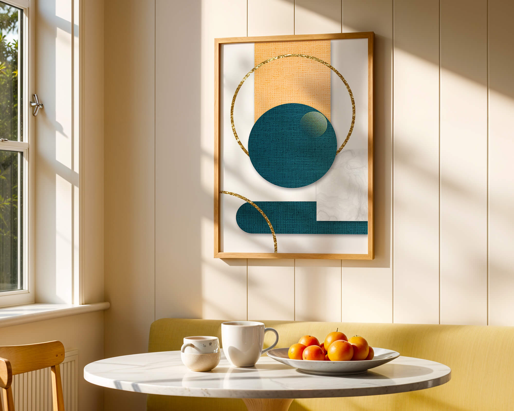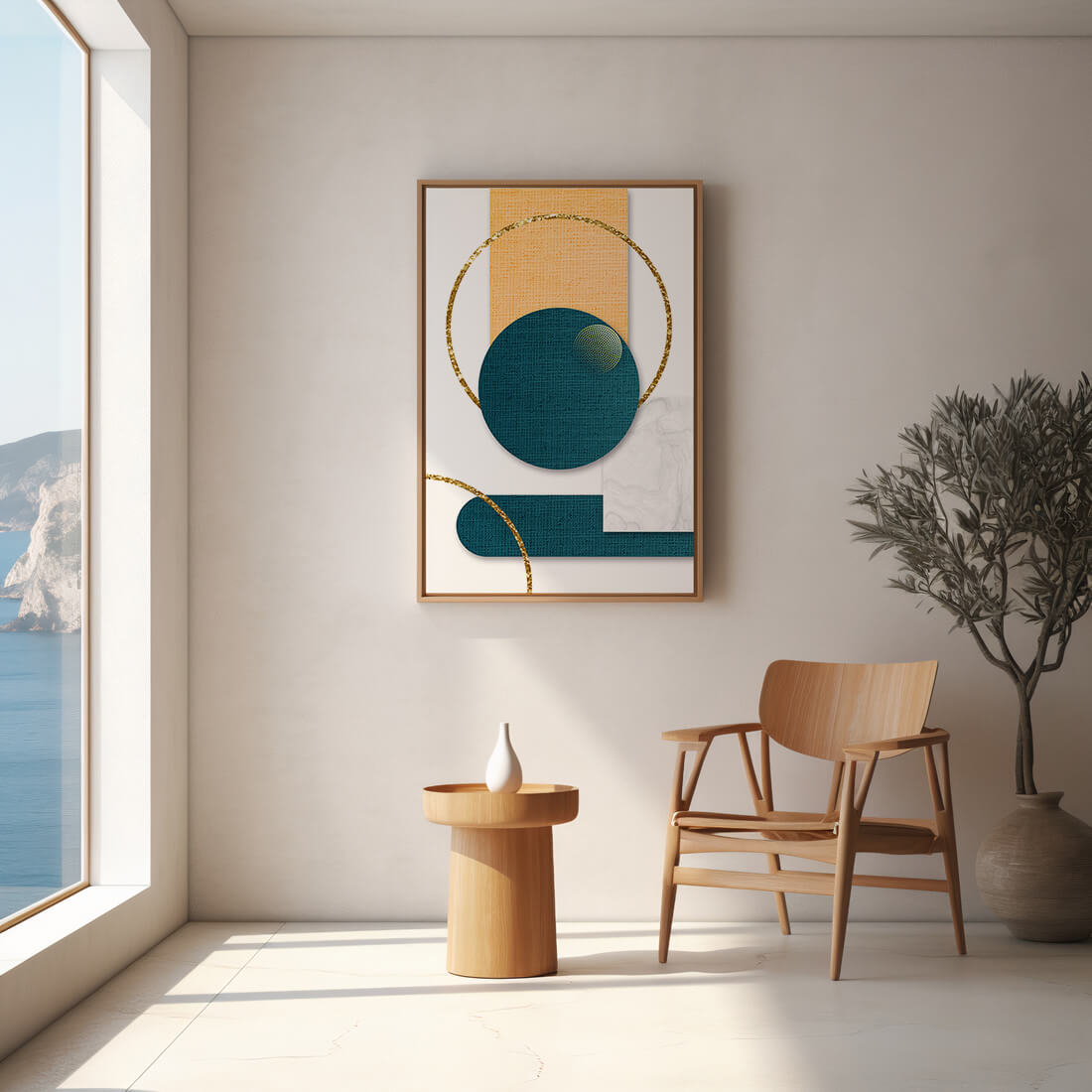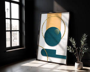 This image showcases an abstract geometric composition that blends various textures and colors to create a visually striking art piece. It combines rich gold accents with deep teal and marble textures, offering a luxurious and modern aesthetic. The use of geometric shapes like circles and rectangles, alongside textured patterns, adds depth and intrigue. The gold elements add a touch of elegance and sophistication, making this artwork suitable for enhancing the ambiance in both home and office settings. Whether displayed in a living room, bedroom, or study, it adds a contemporary and stylish flair to any space.