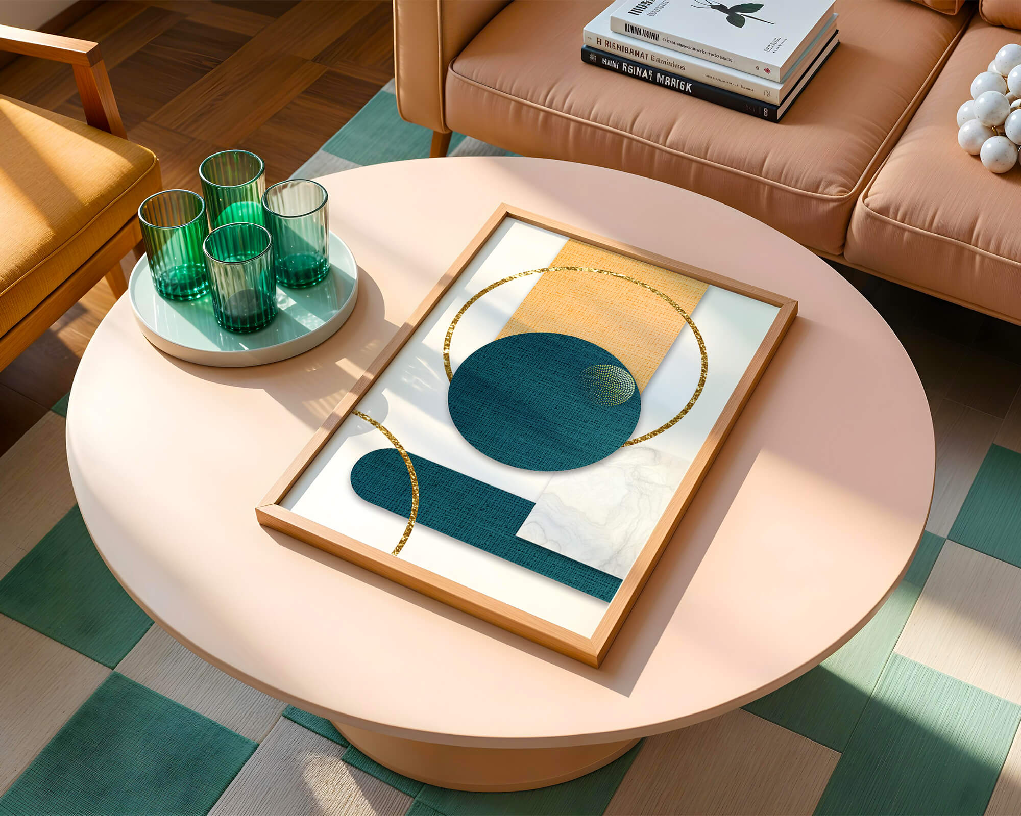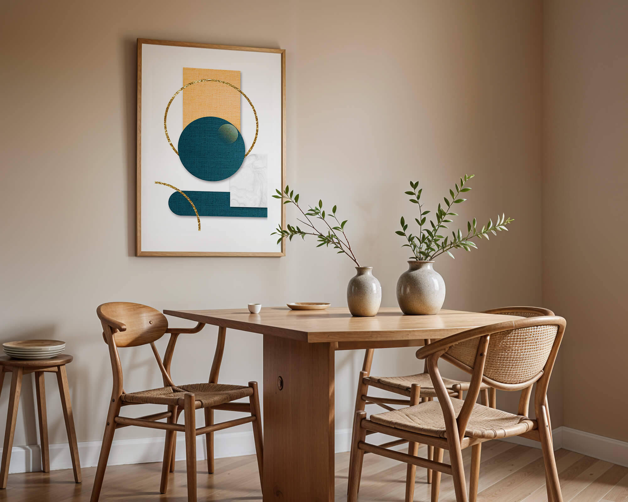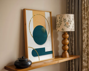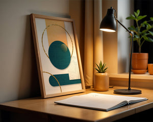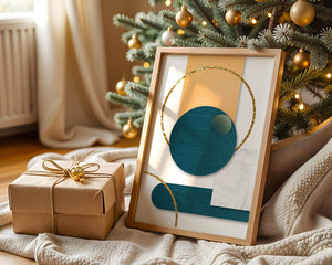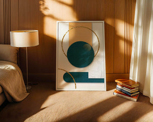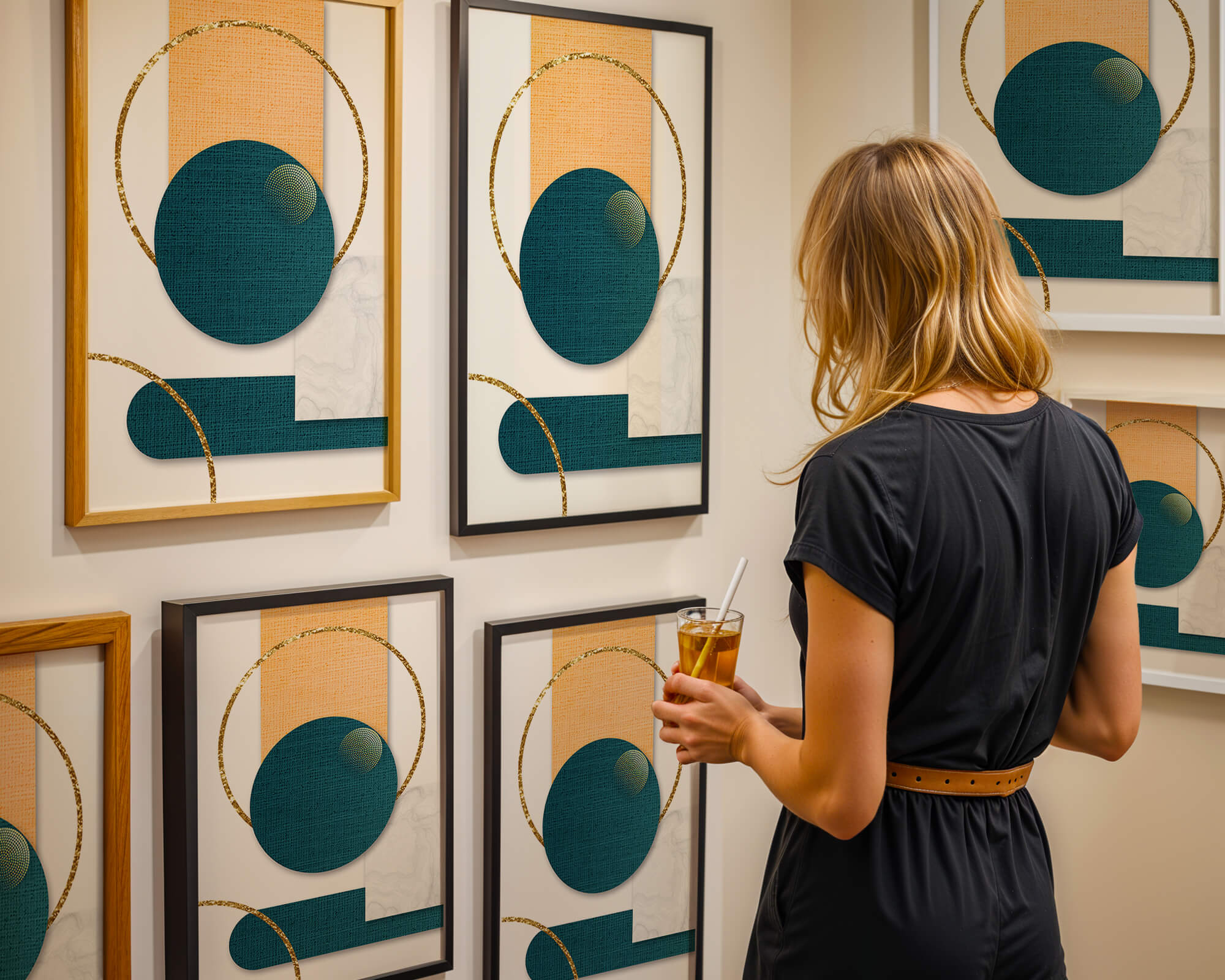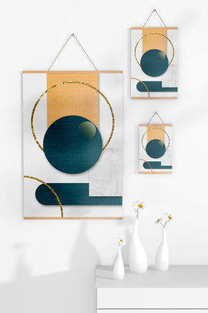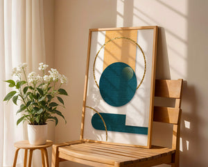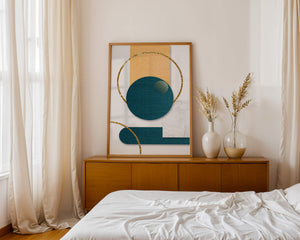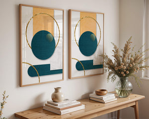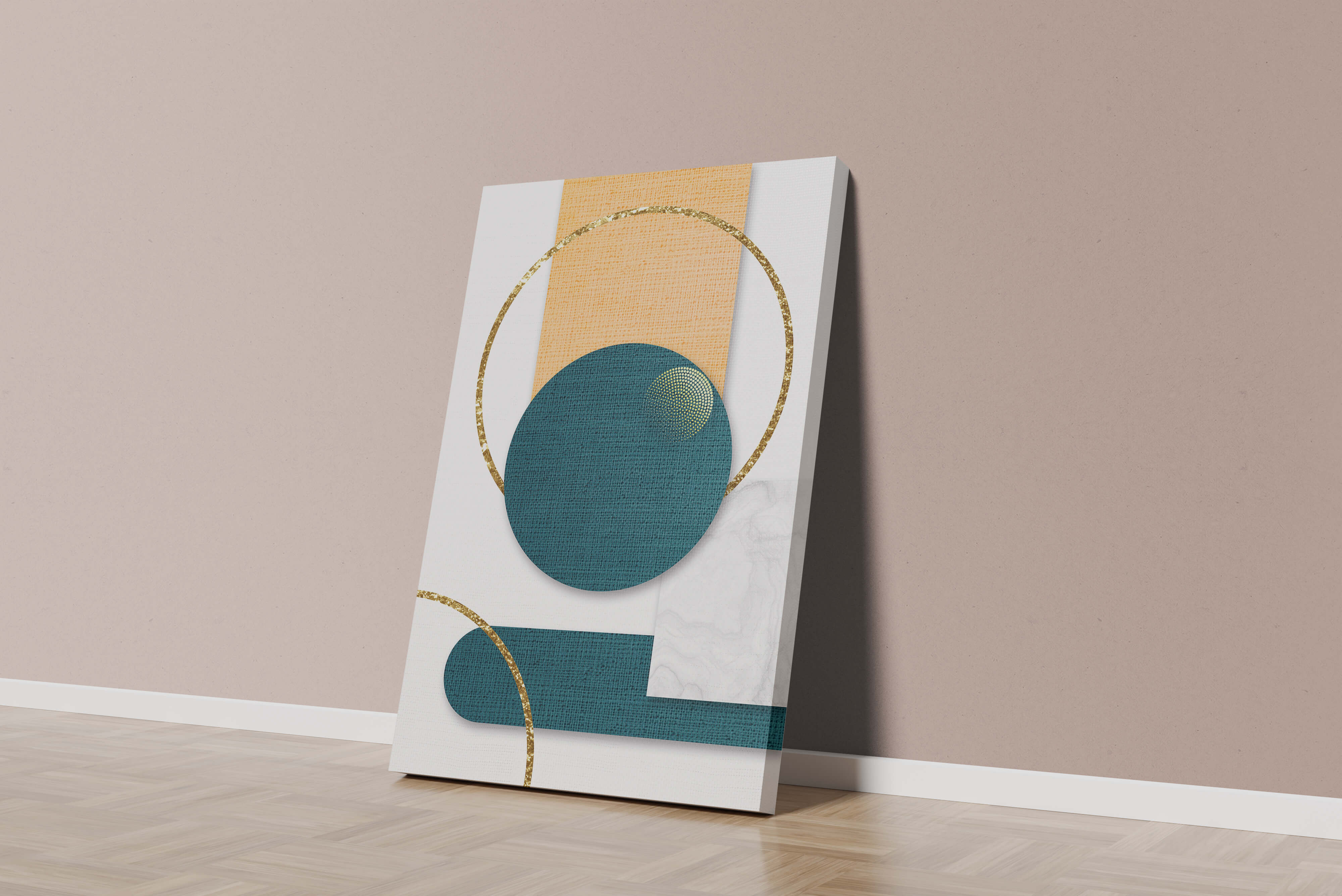 This image showcases an abstract geometric composition that blends various textures and colors to create a visually striking art piece. It combines rich gold accents with deep teal and marble textures, offering a luxurious and modern aesthetic. The use of geometric shapes like circles and rectangles, alongside textured patterns, adds depth and intrigue. The gold elements add a touch of elegance and sophistication, making this artwork suitable for enhancing the ambiance in both home and office settings. Whether displayed in a living room, bedroom, or study, it adds a contemporary and stylish flair to any space.