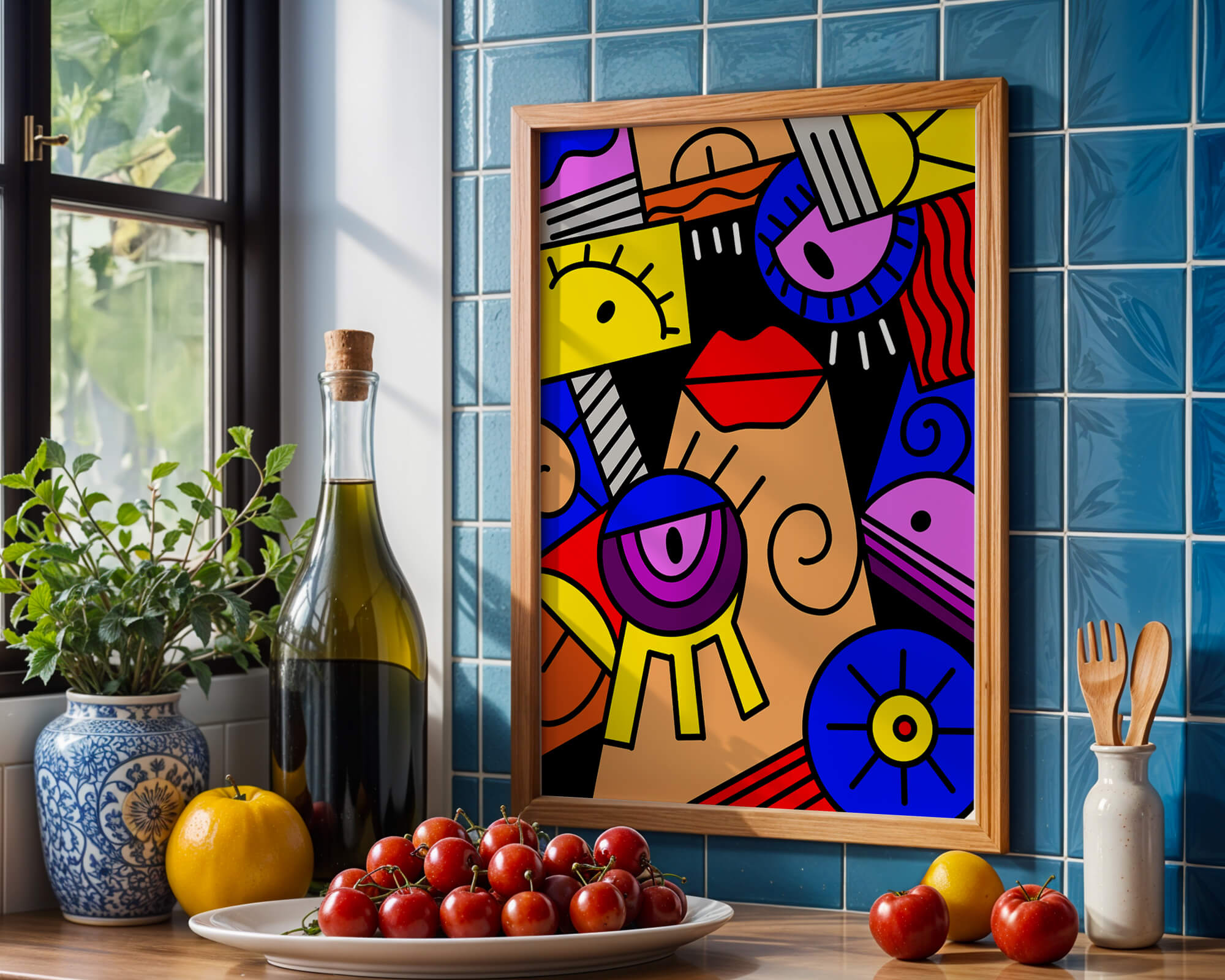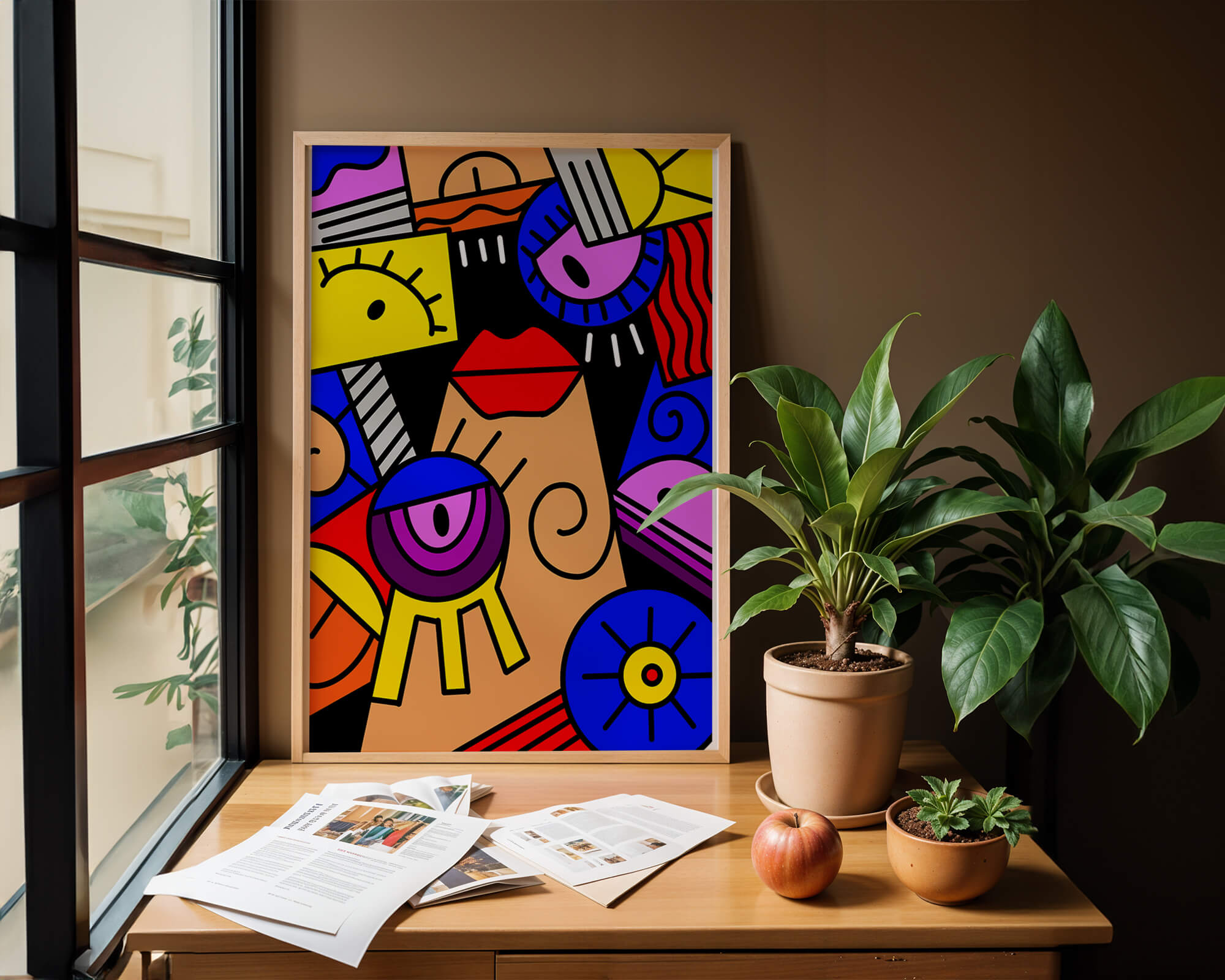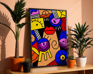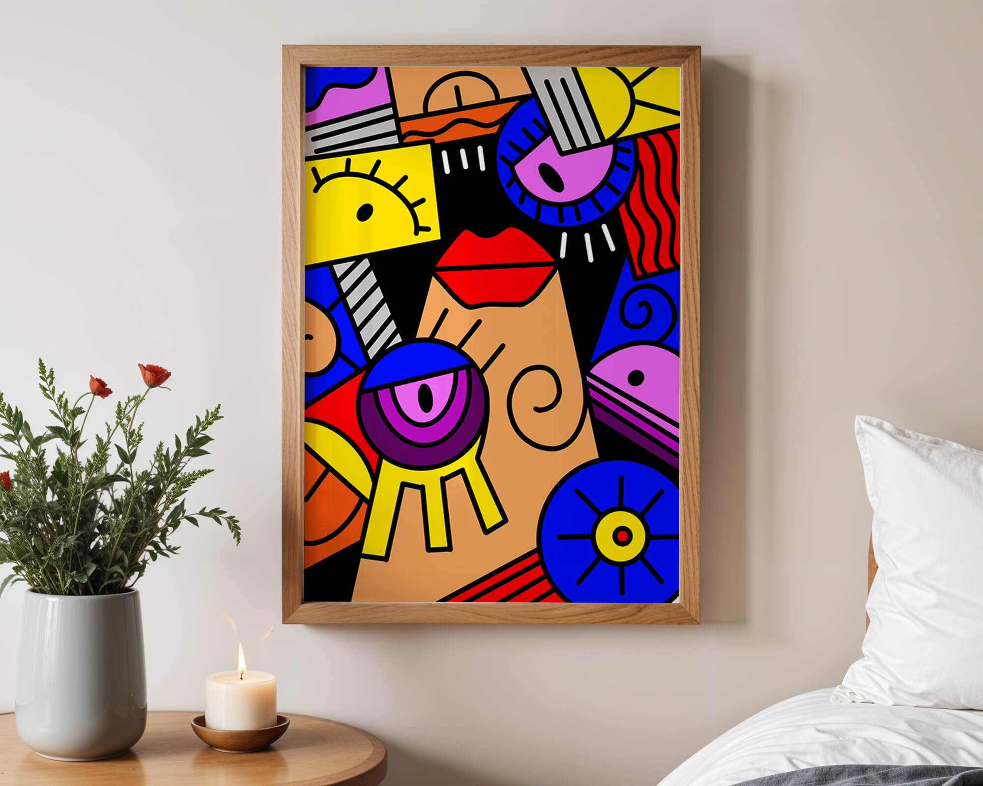 This artwork is a striking composition of abstract geometric shapes and vivid colors. It combines elements of pop art with bold outlines and dynamic patterns, creating an eye-catching visual experience.