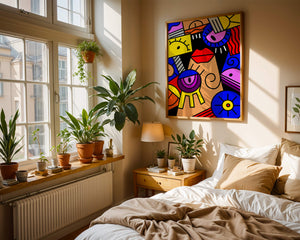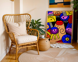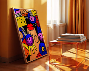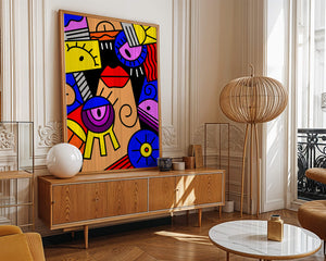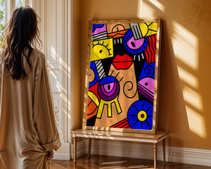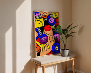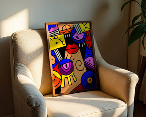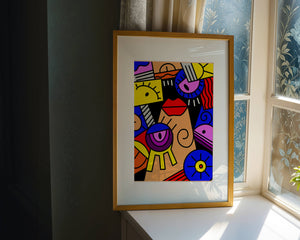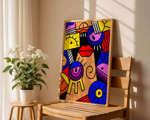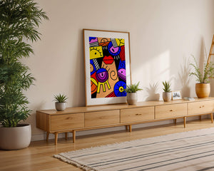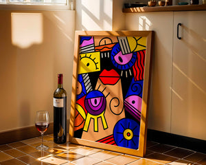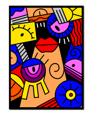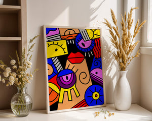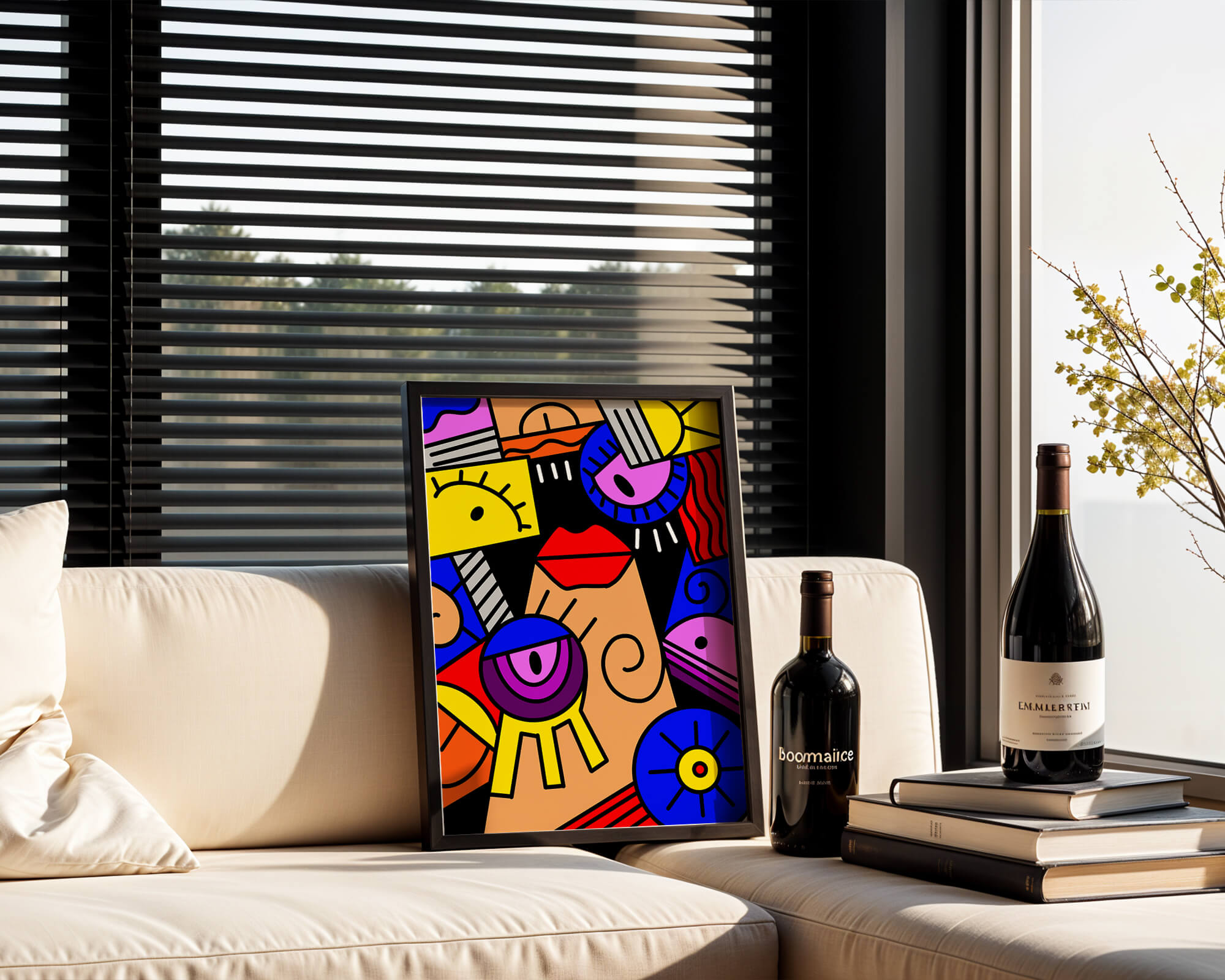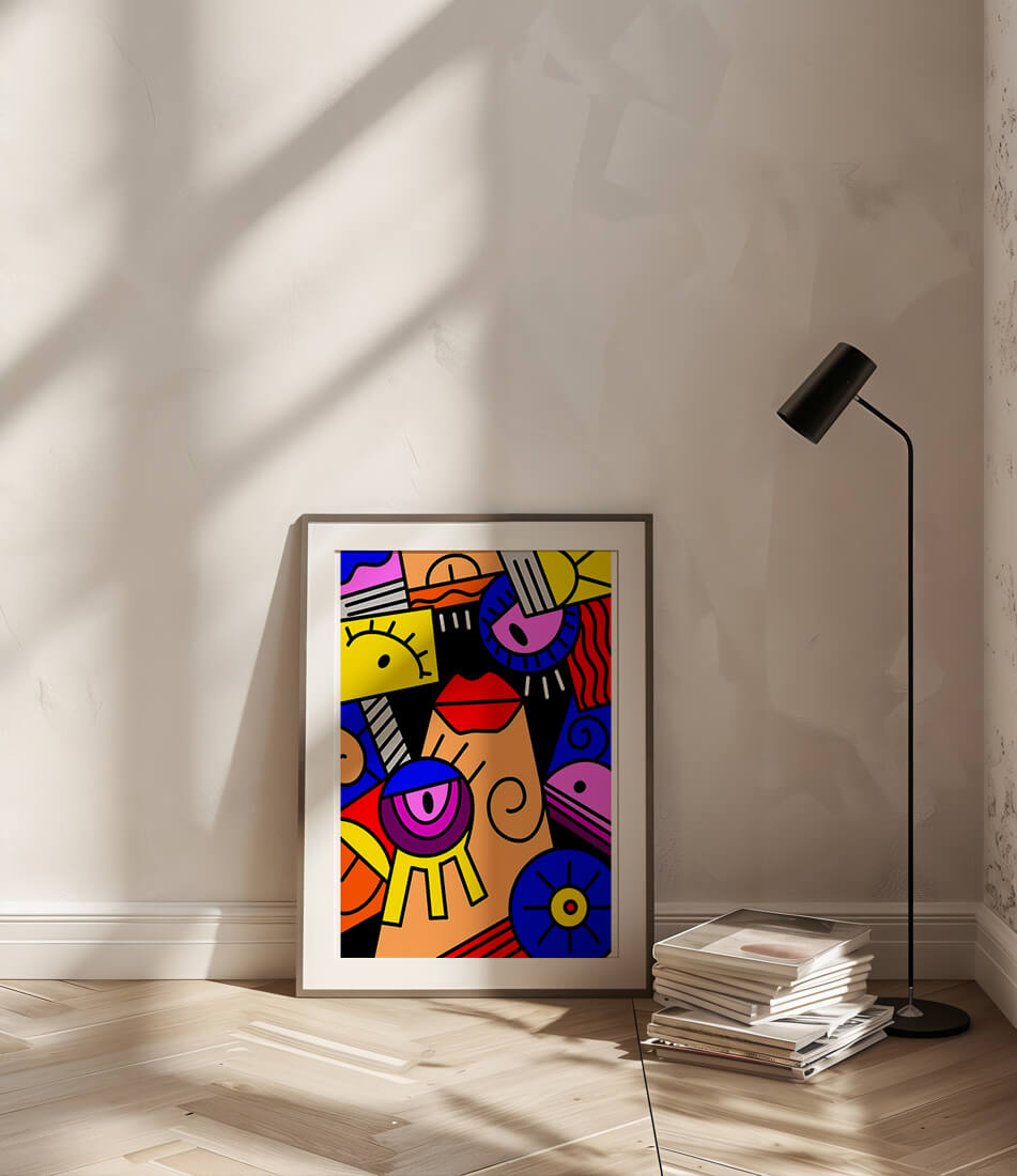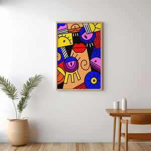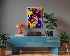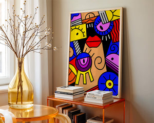 This artwork is a striking composition of abstract geometric shapes and vivid colors. It combines elements of pop art with bold outlines and dynamic patterns, creating an eye-catching visual experience.