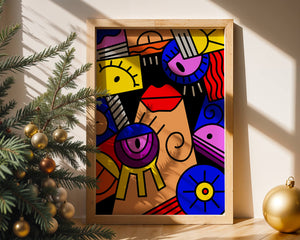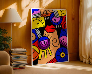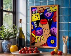 The piece is filled with a variety of geometric forms, including circles, squares, and spirals, each with its own vibrant color palette. The interplay of these shapes creates a sense of movement and energy, drawing the viewers eye across the canvas. In addition to its geometric complexity, the artwork incorporates elements such as eyes and lips, adding a humanistic touch to the abstract arrangement. This combination of organic and inorganic forms challenges the viewer to find meaning and order amidst the colorful chaos. The bright, contrasting colors enhance the overall expressiveness and modernity of the piece, making it perfect for contemporary art lovers.