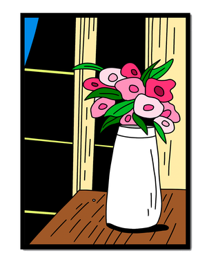 An abstract illustration displays a vibrant bouquet of pink flowers in a tall, white vase sitting on a wooden table. The image uses bold lines and vivid colors, creating a striking contrast against the neutral backdrop.