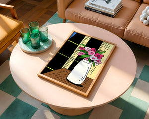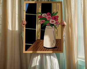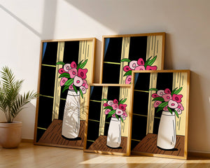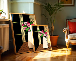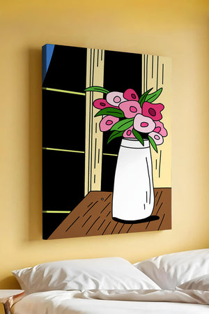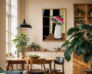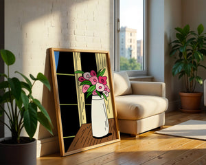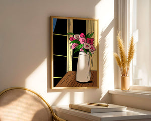 This artistic representation features a bouquet of stylized flowers, composed of various shades of pink paired with green leaves for a fresh and lively appearance. The vase holding the flowers is sleek and modern, exuding a minimalist charm that complements the energetic floral arrangement.The setting evokes a cozy and bright living space, illuminated by the soft light streaming through a nearby window. This illustration could easily become an eye-catching piece in a variety of room settings, from living rooms to kitchens, offering both a touch of nature and a playful artistic element to any interior.