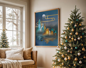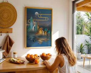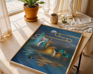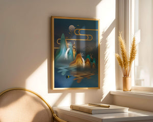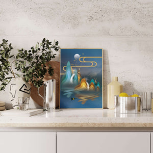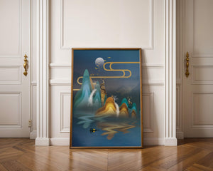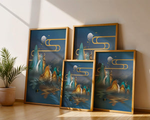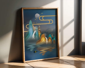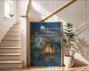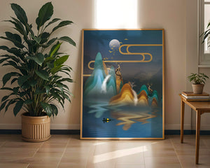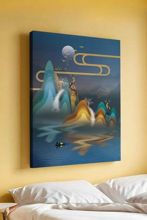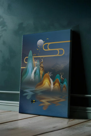 The scene is set under the calming glow of a full moon, casting a soft light over the vivid landscape. A group of birds fly gracefully across the sky, adding dynamic movement above the stillness of the layered hills. The mountains cascade in gentle waves of color, creating a grandiose backdrop that combines the tranquility of nature with abstract artistry.At the foot of these majestic hills, a lone figure navigates a small boat over reflective waters. The ethereal patterns in the water mirror the mountains’ colors, enhancing the dreamlike quality of the image. The golden deer stands gracefully atop one of the hills, embodying a sense of quiet majesty and linking the viewer to a world of mystical allure.