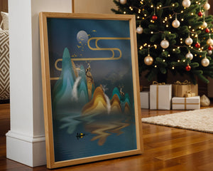 Abstract landscape with golden deer and layered mountains in serene night scene