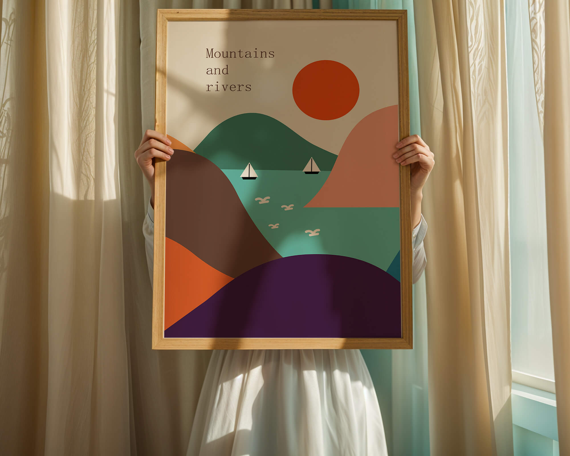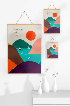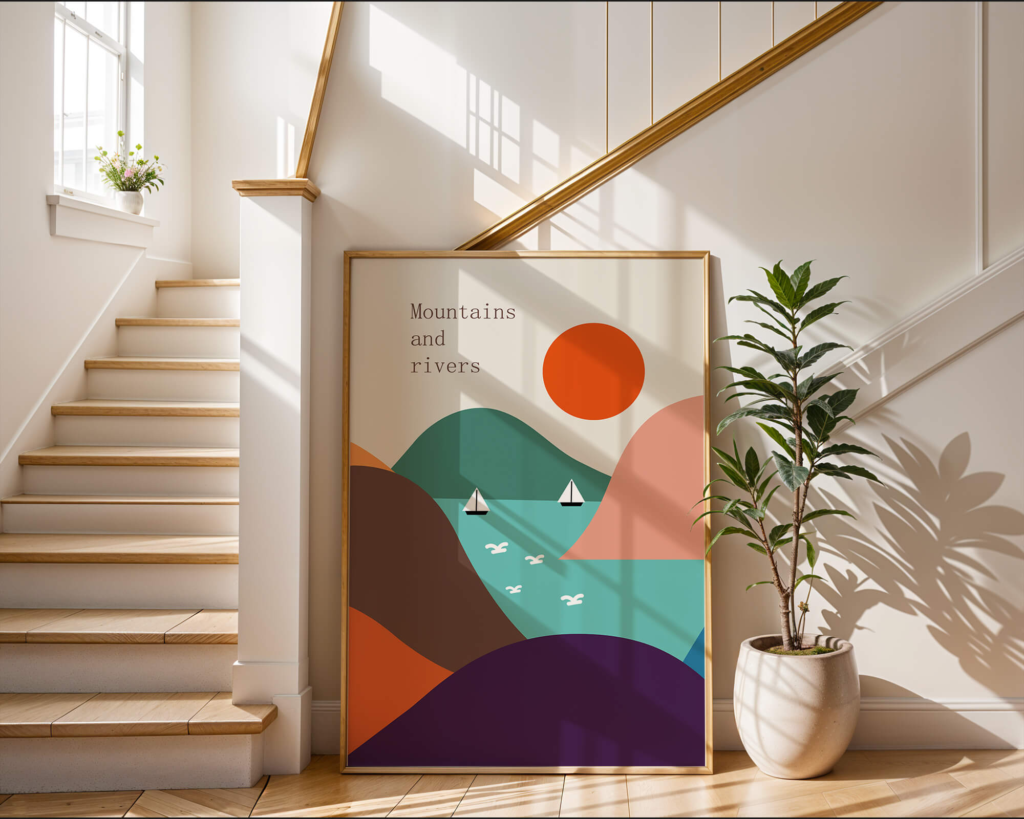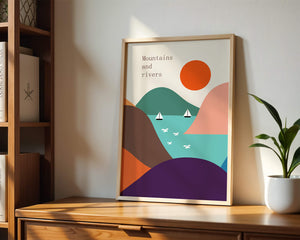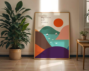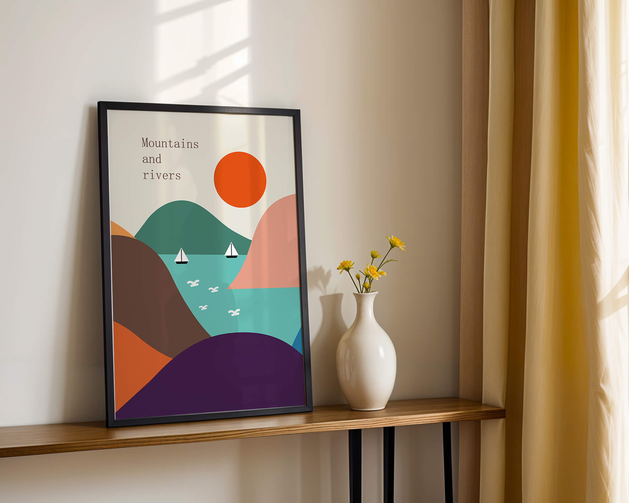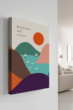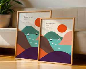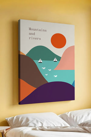 The artwork presents a series of hills in different shades, from muted earth tones to bright colors. These hills seemingly rise and fall, offering a sense of movement within the landscape. Set against a pale background, an intense orange circle suggests a sun setting or rising, contributing to the dynamic energy of the piece.In the foreground, the soft teal river provides a calm contrast, with small sailboats drifting across its surface. The minimalist design is completed by a few stylized birds mid-flight, adding a touch of life and motion. This modern art piece is perfect for spaces seeking to balance colorful boldness with serene simplicity.| Type |