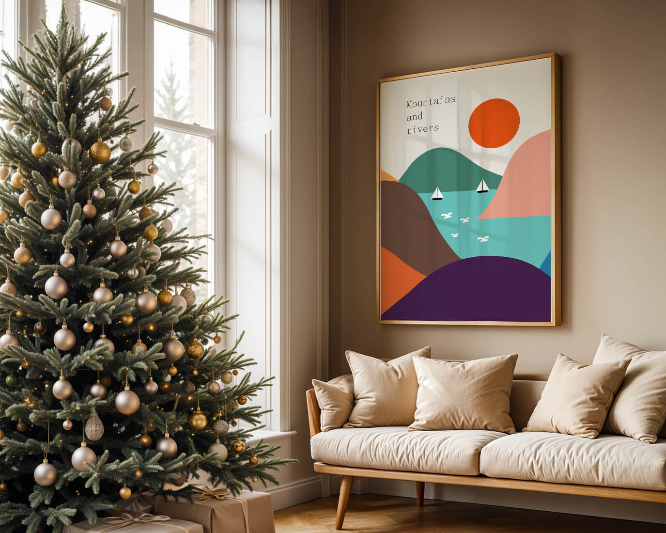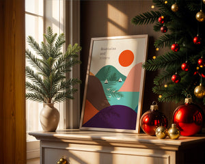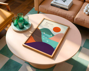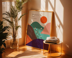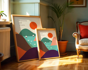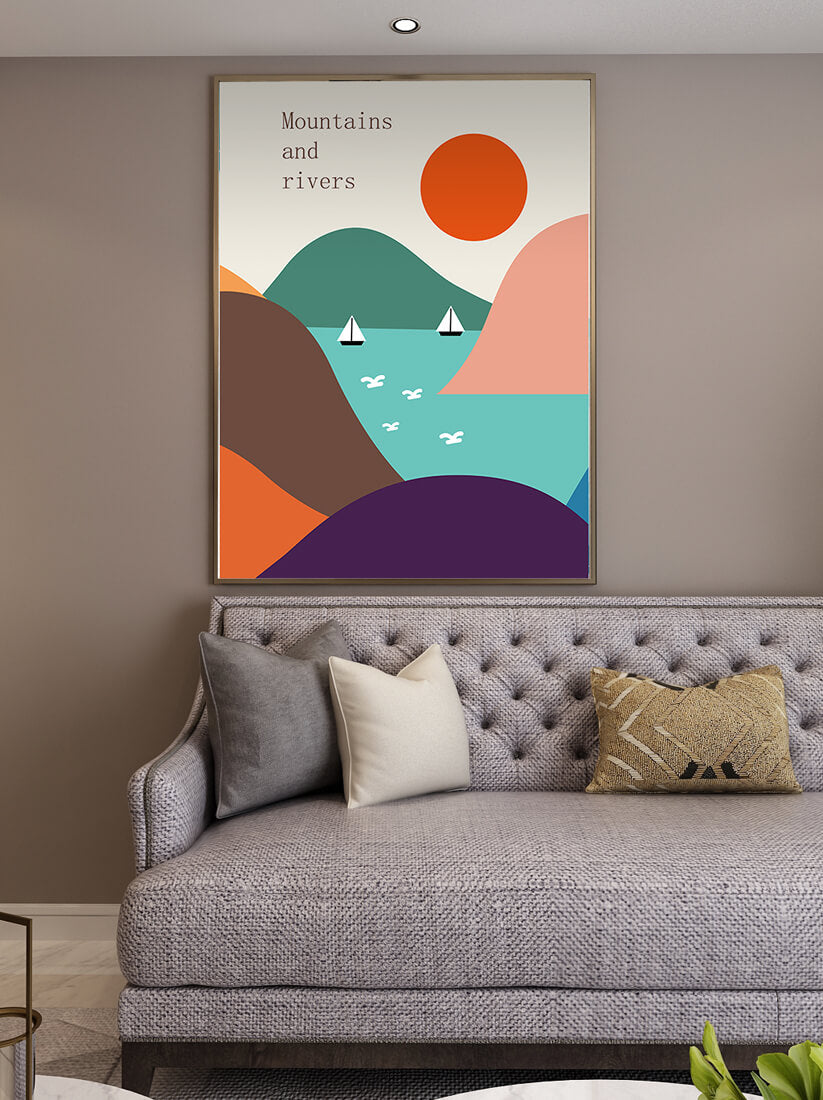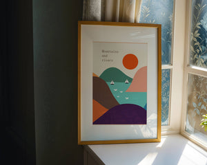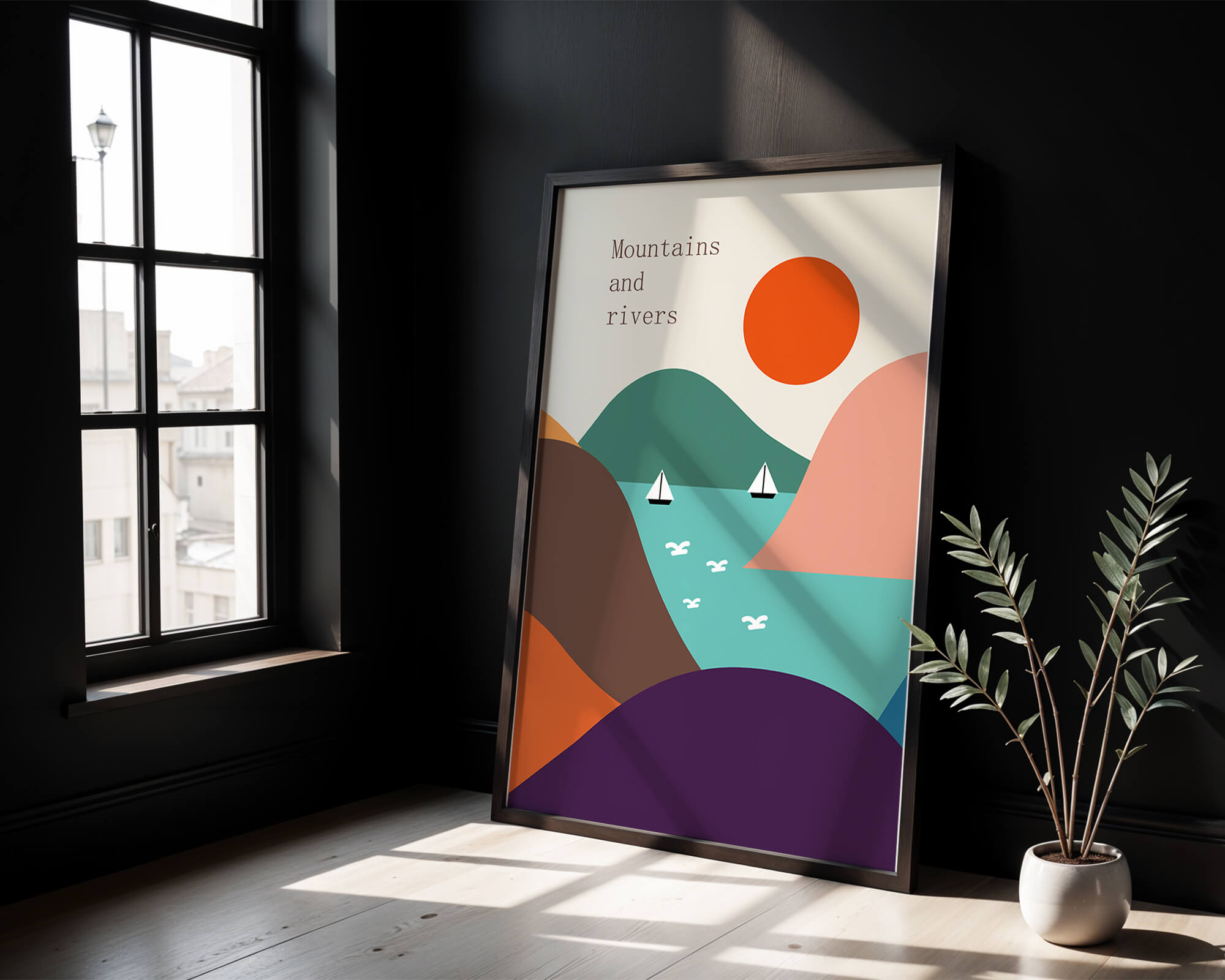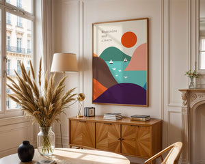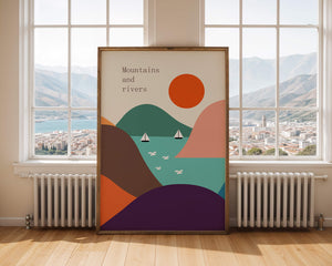 The artwork presents a series of hills in different shades, from muted earth tones to bright colors. These hills seemingly rise and fall, offering a sense of movement within the landscape. Set against a pale background, an intense orange circle suggests a sun setting or rising, contributing to the dynamic energy of the piece.In the foreground, the soft teal river provides a calm contrast, with small sailboats drifting across its surface. The minimalist design is completed by a few stylized birds mid-flight, adding a touch of life and motion. This modern art piece is perfect for spaces seeking to balance colorful boldness with serene simplicity.| Type |