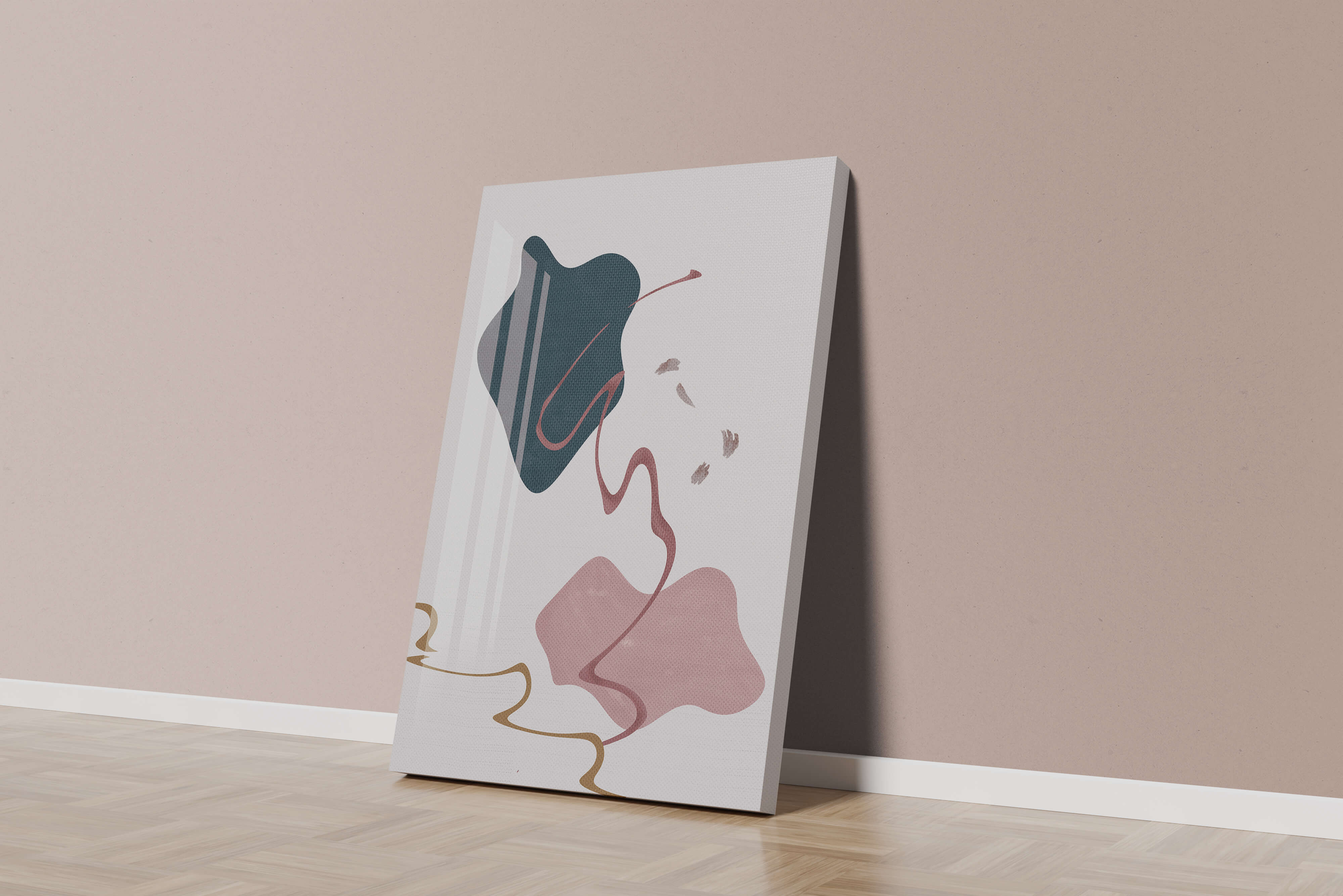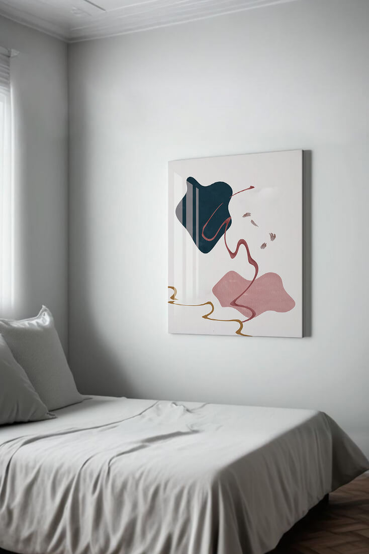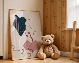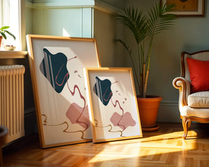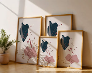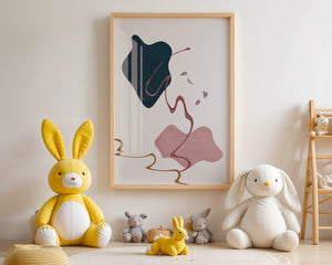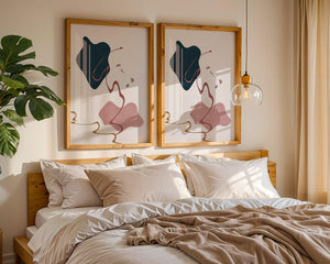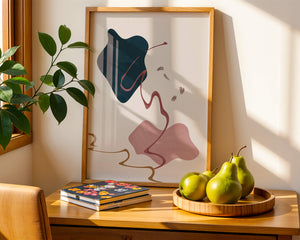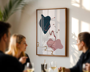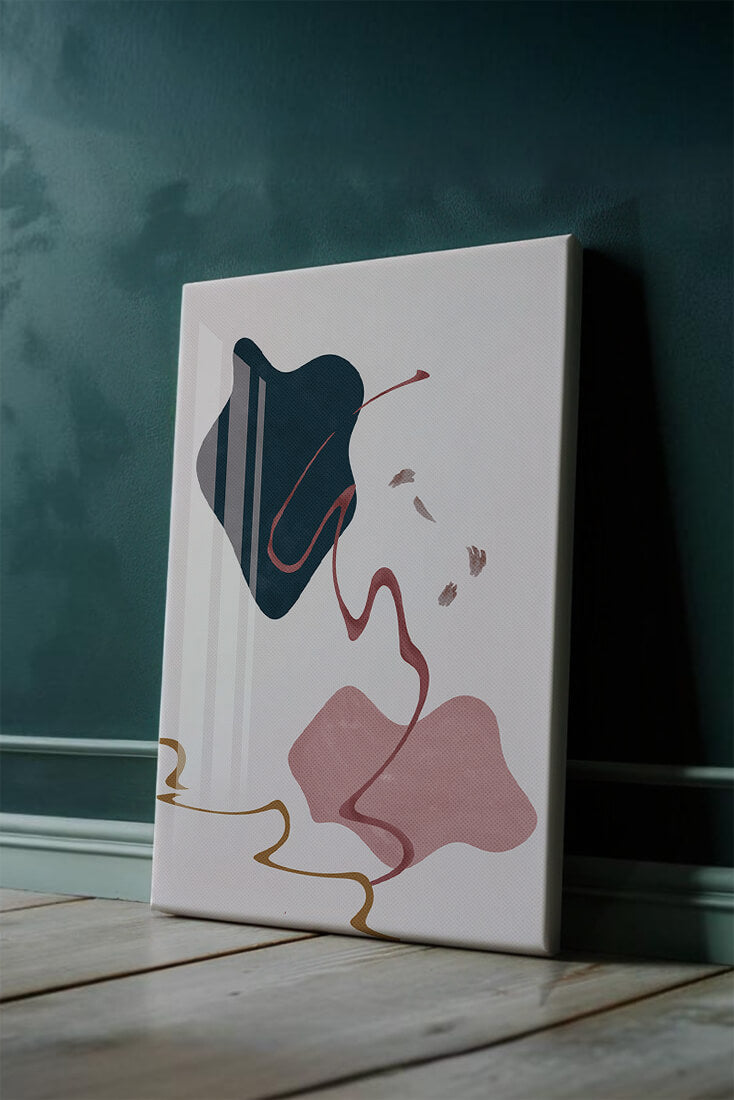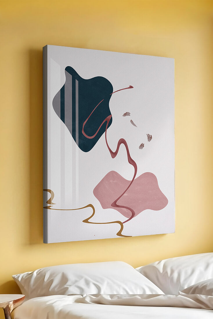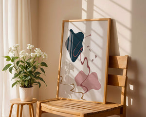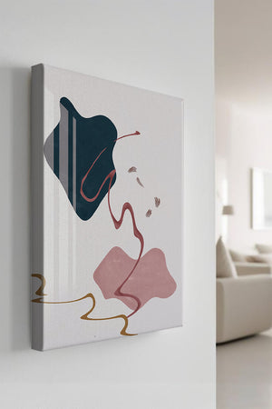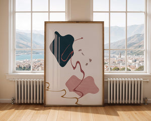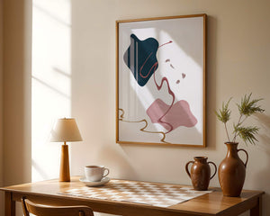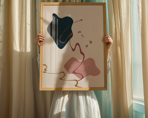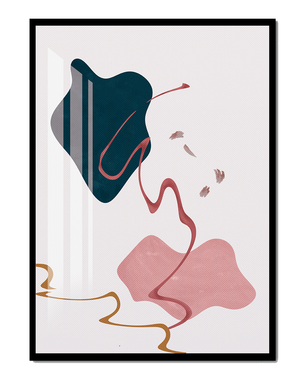 The composition showcases a dark blue and pink shape intertwined with graceful curves. The elegant use of lines and subtle golden accents adds a touch of luxurious charm. It offers a modern and artistic appeal, making it a perfect addition to any contemporary interior.This piece stands out with its simplicity and dynamic flow, embodying both creative expression and aesthetic sophistication. The combination of minimalistic elements creates a captivating visual experience that enhances any wall.