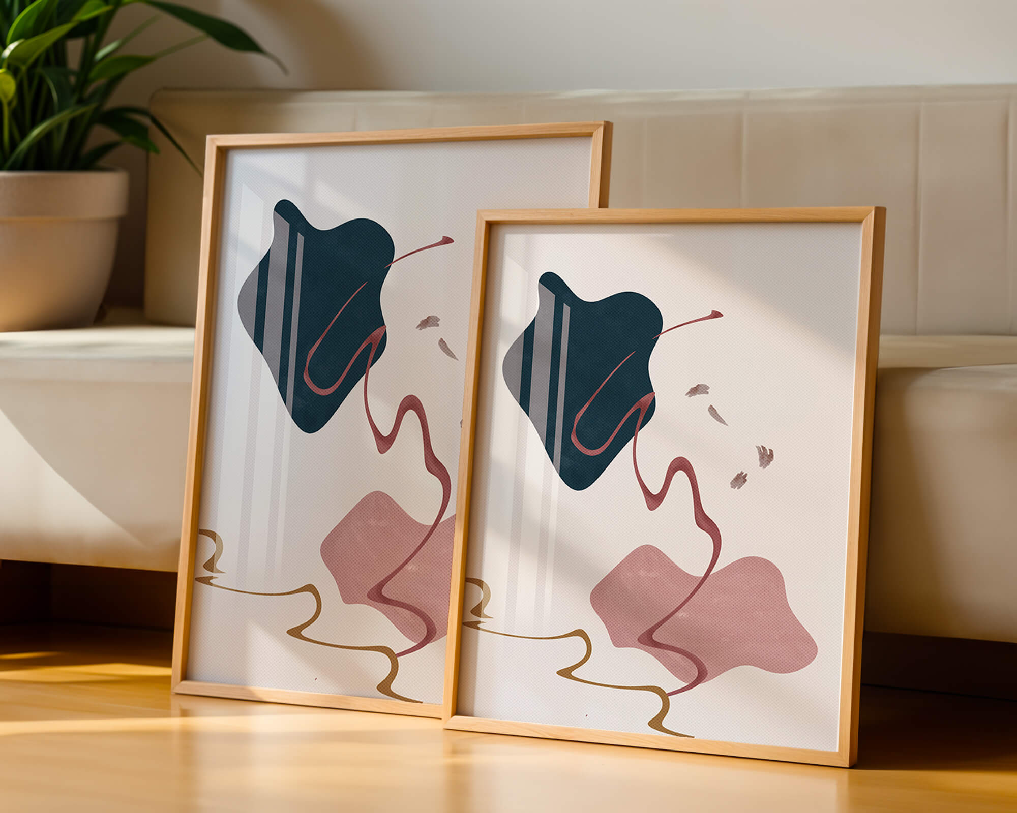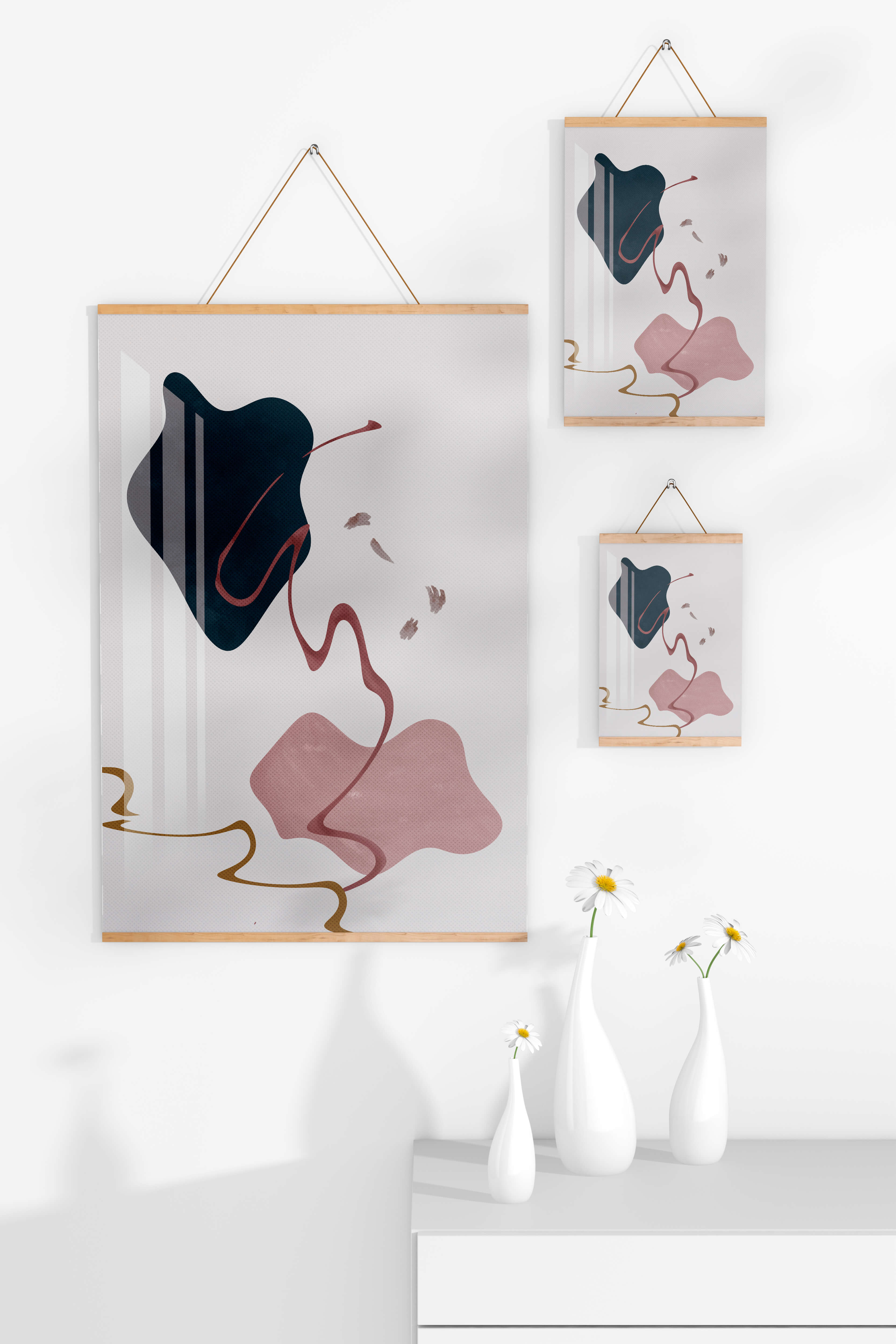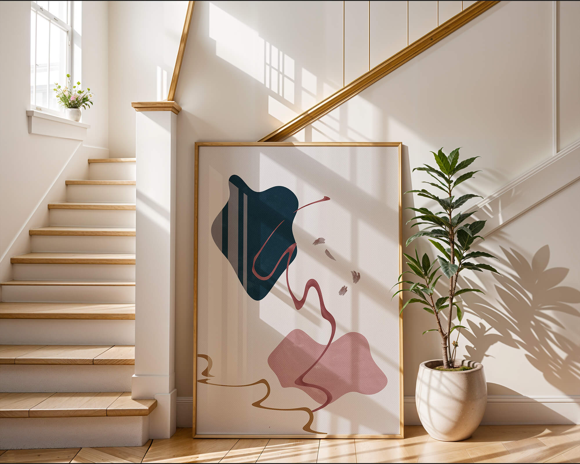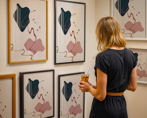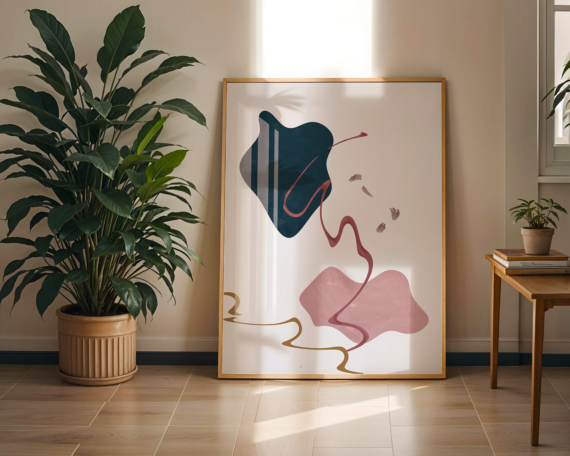 The composition showcases a dark blue and pink shape intertwined with graceful curves. The elegant use of lines and subtle golden accents adds a touch of luxurious charm. It offers a modern and artistic appeal, making it a perfect addition to any contemporary interior.This piece stands out with its simplicity and dynamic flow, embodying both creative expression and aesthetic sophistication. The combination of minimalistic elements creates a captivating visual experience that enhances any wall.