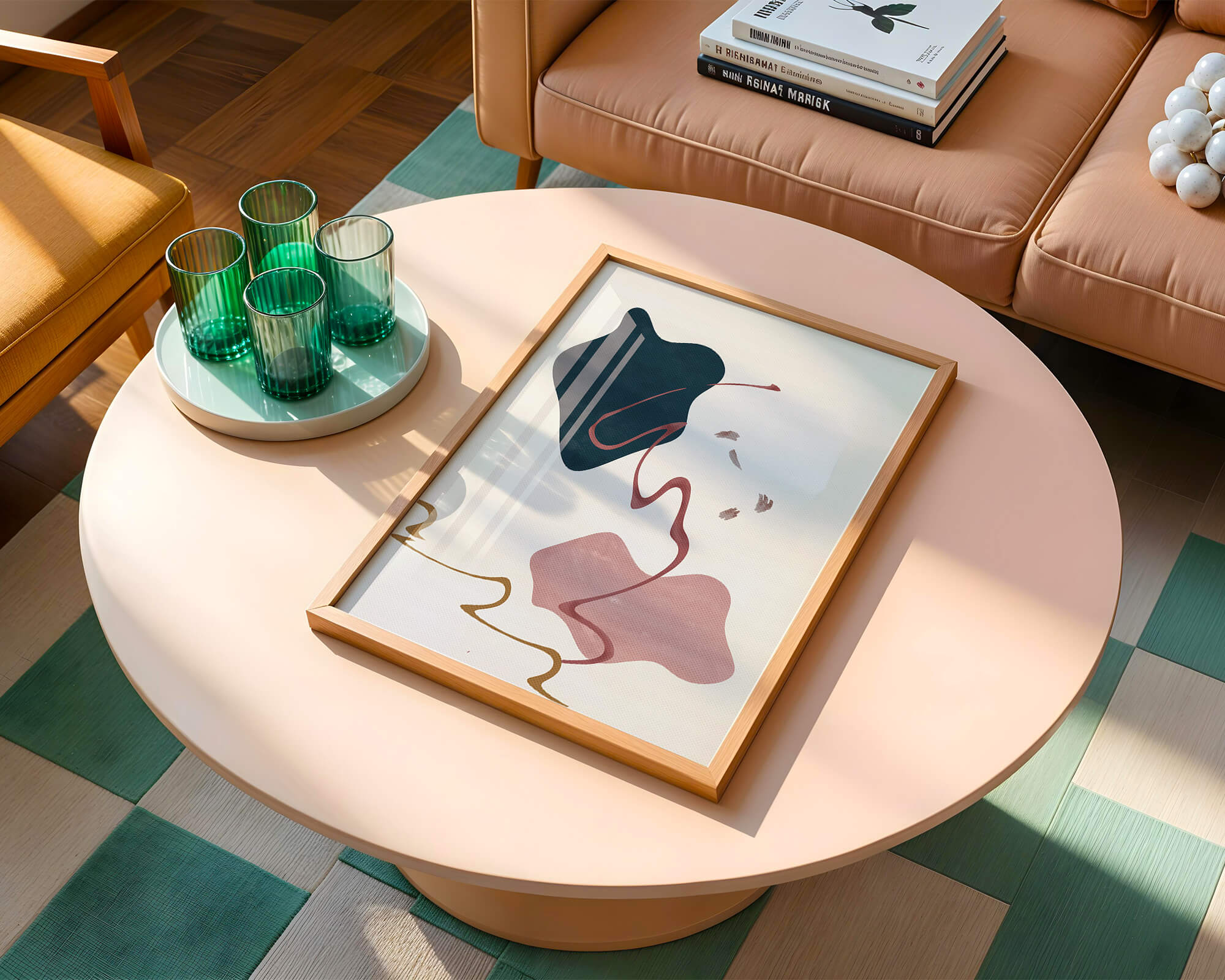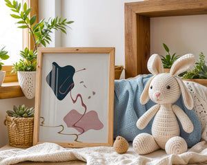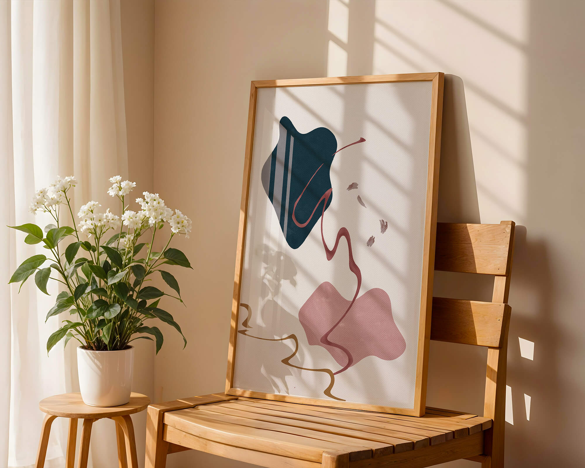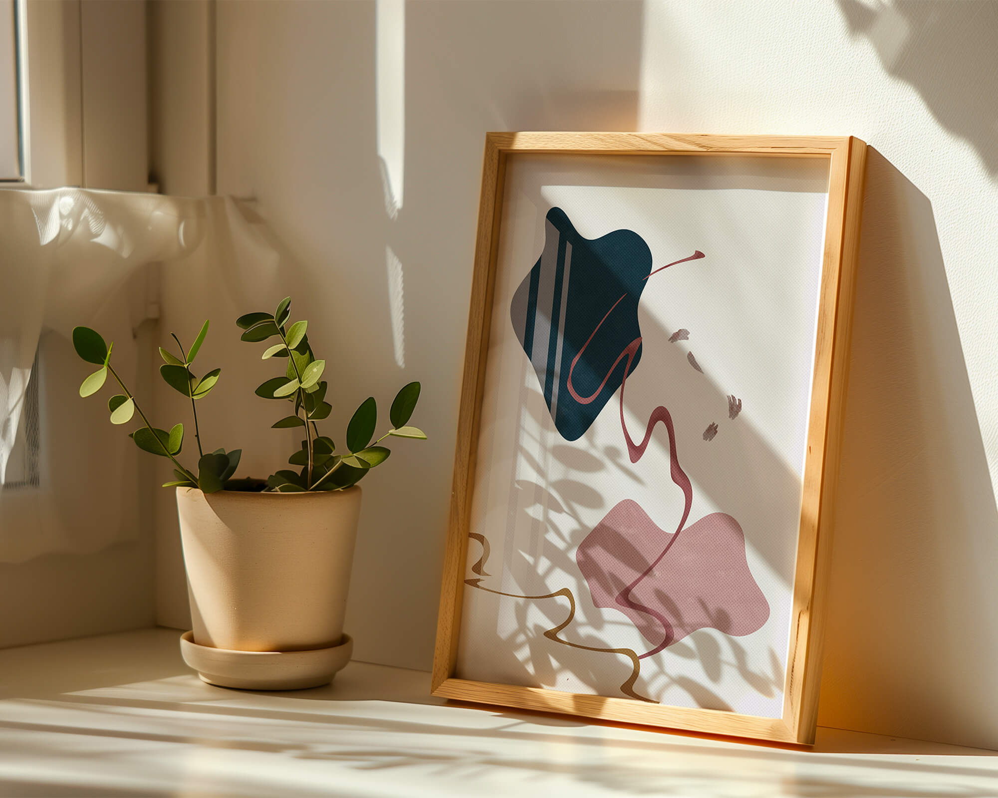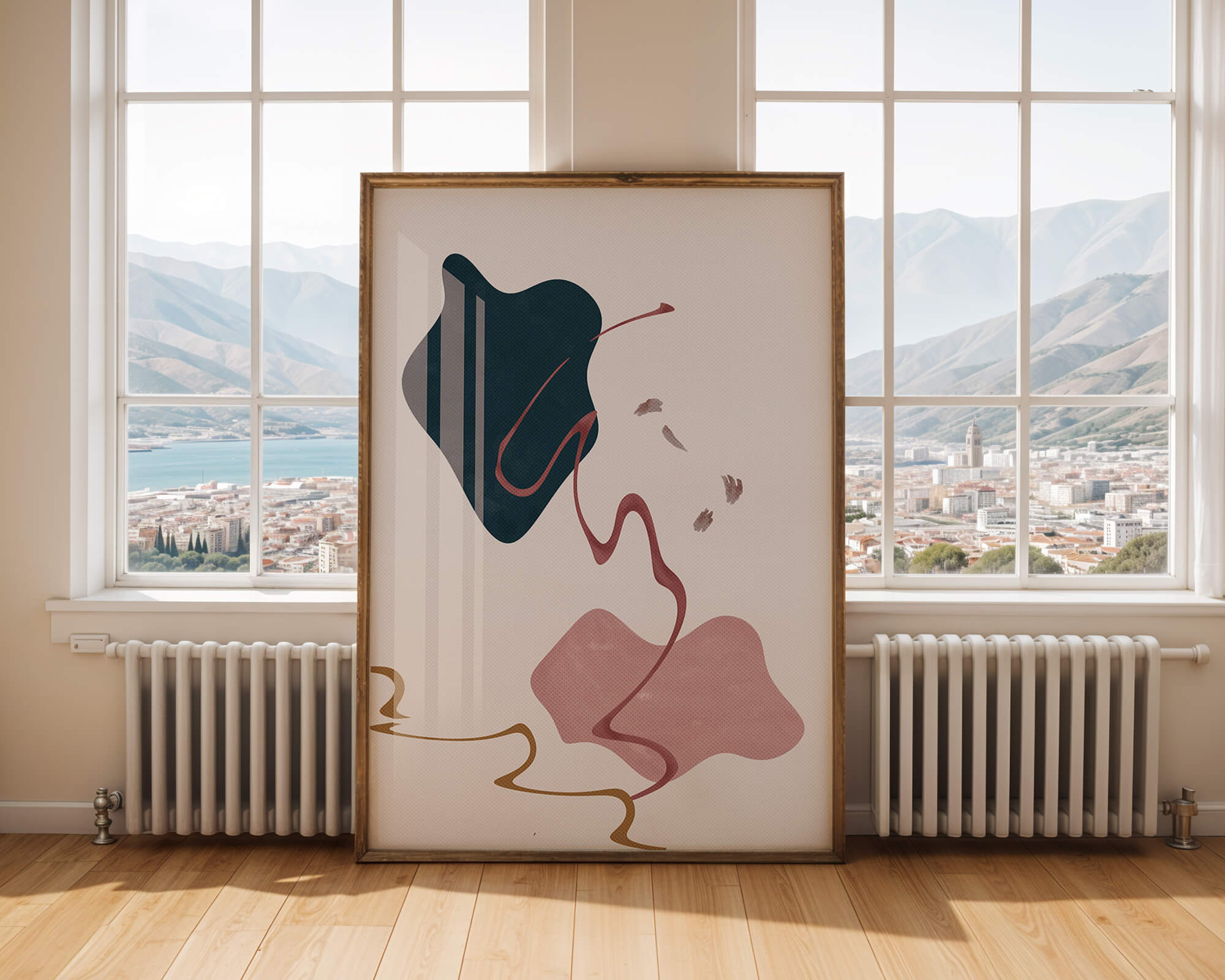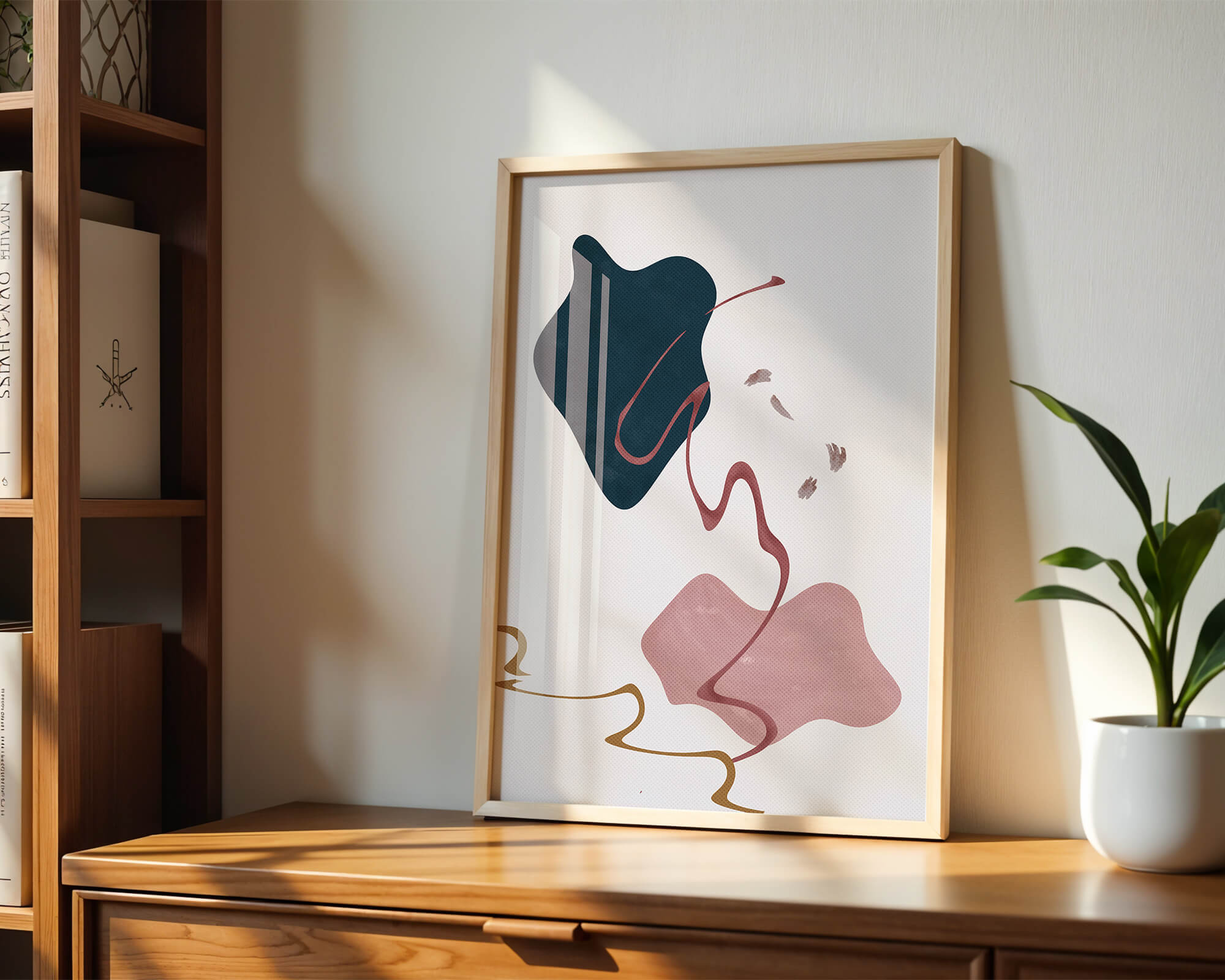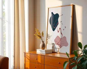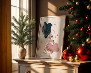 This artwork features a minimalist abstract design with flowing shapes and a sophisticated color palette.