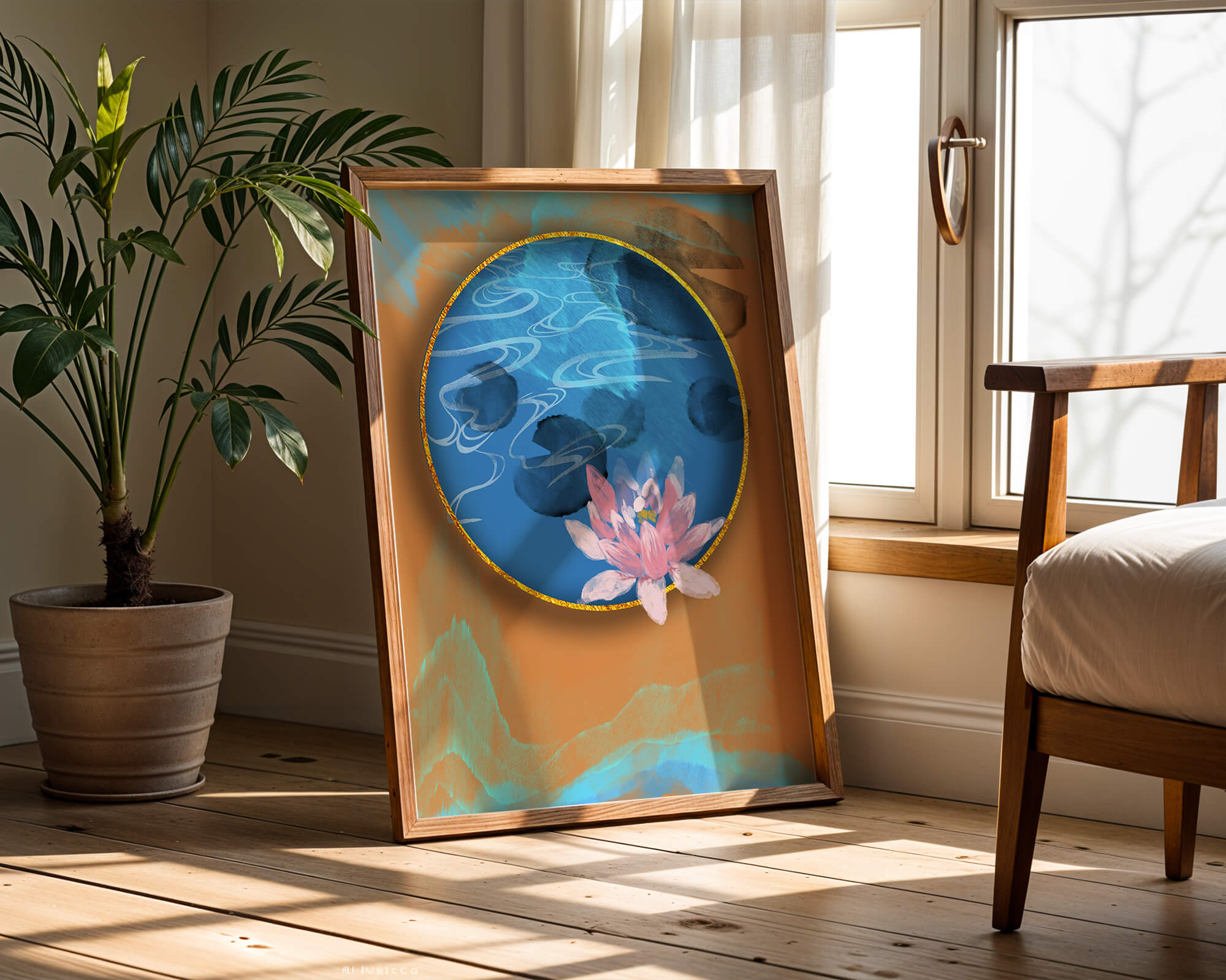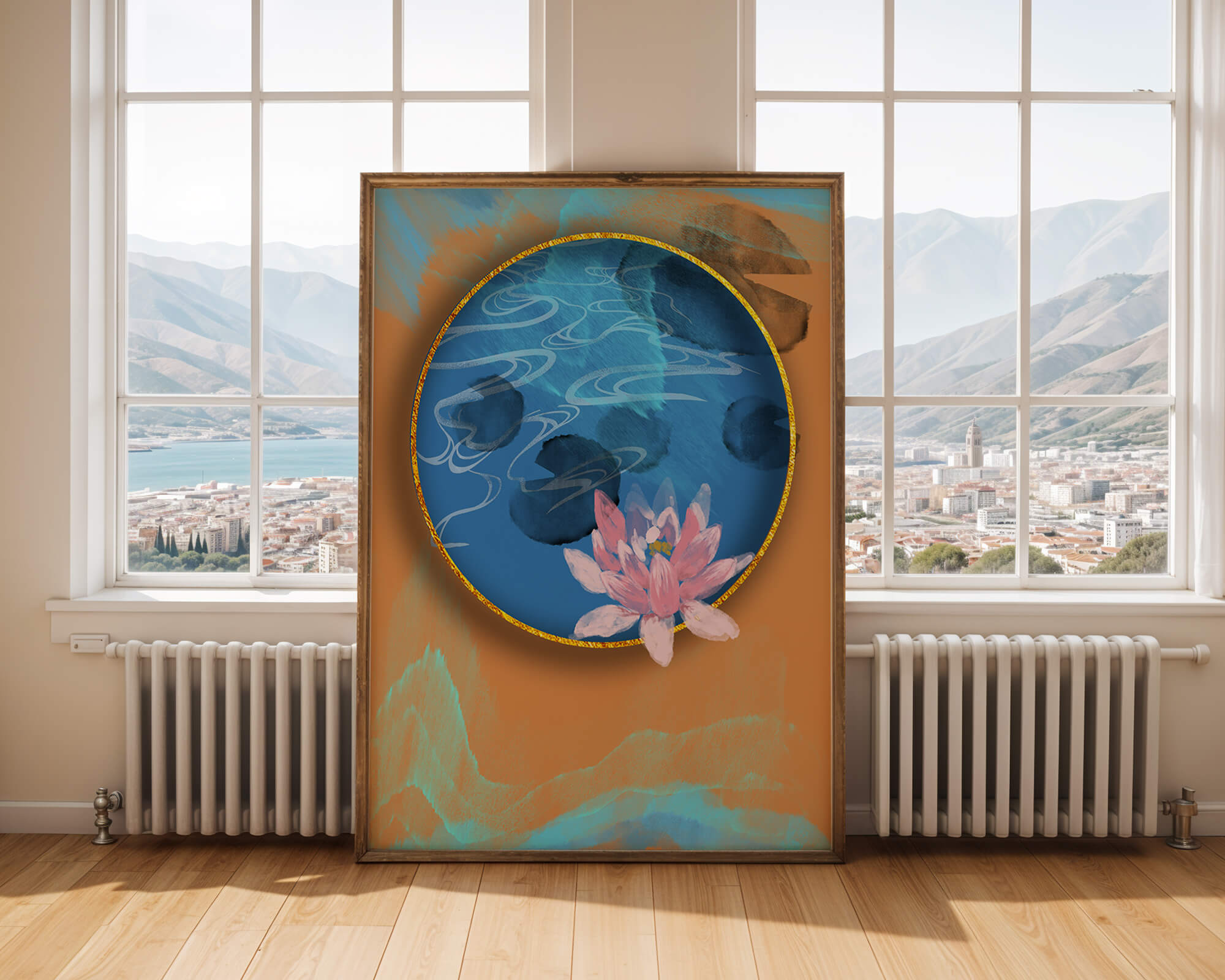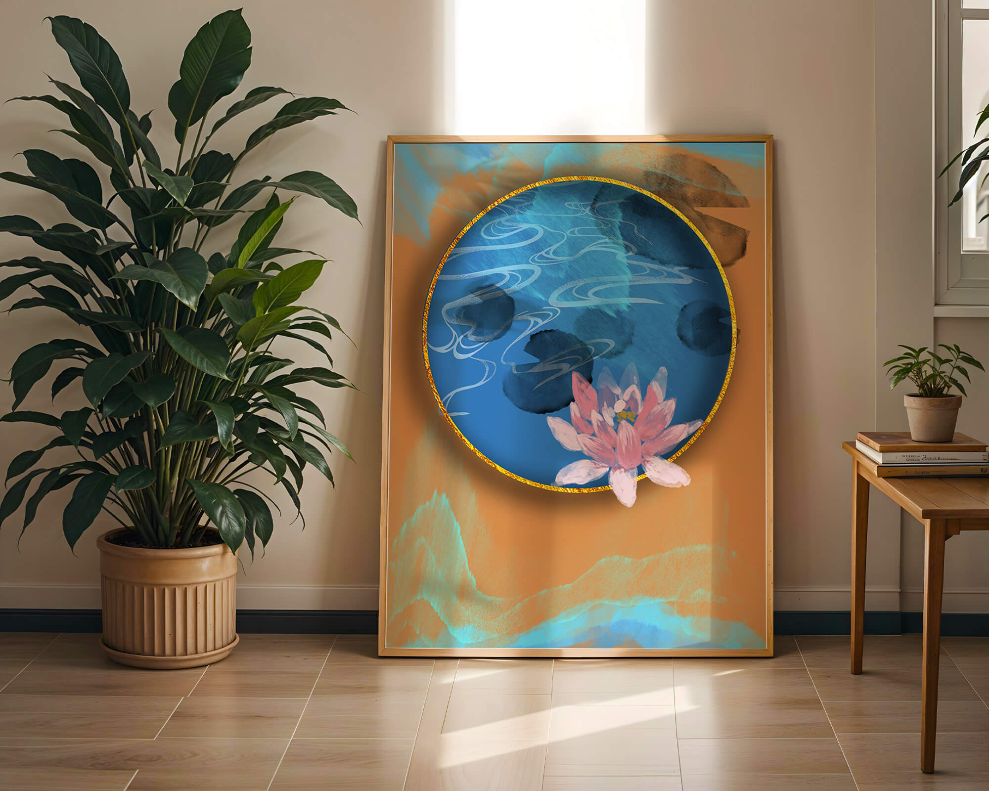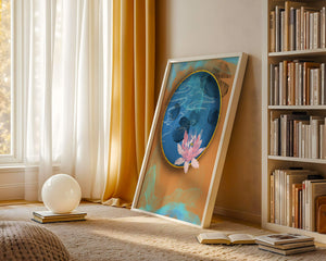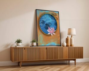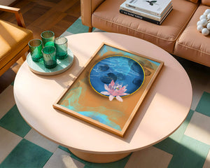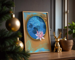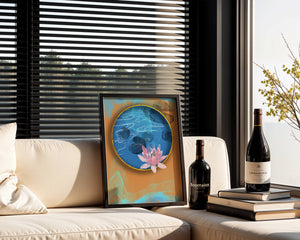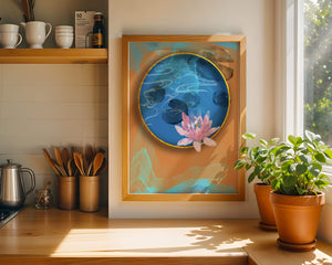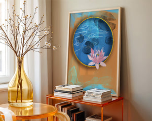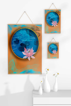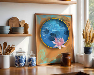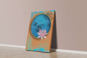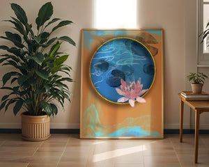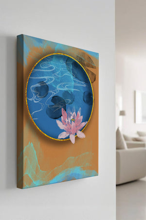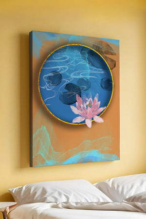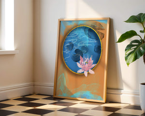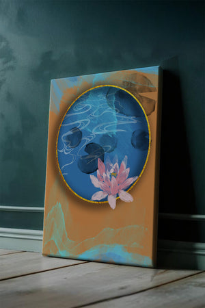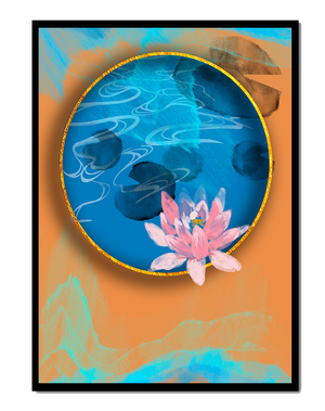 This piece of art captivates with its tranquil rendition of a water lily floating peacefully within a blue circular pond. The detailed floral illustration is emphasized by the intricate blending of colors that mimic ripples of water, creating a sense of calm and serenity.The gold border adds a touch of luxury, seamlessly integrating with the contrasting orange and blue abstract background. The overall design offers a modern aesthetic that embodies both elegance and harmony, making it a perfect addition to any space in need of a contemporary and nature-inspired accent.| Type |