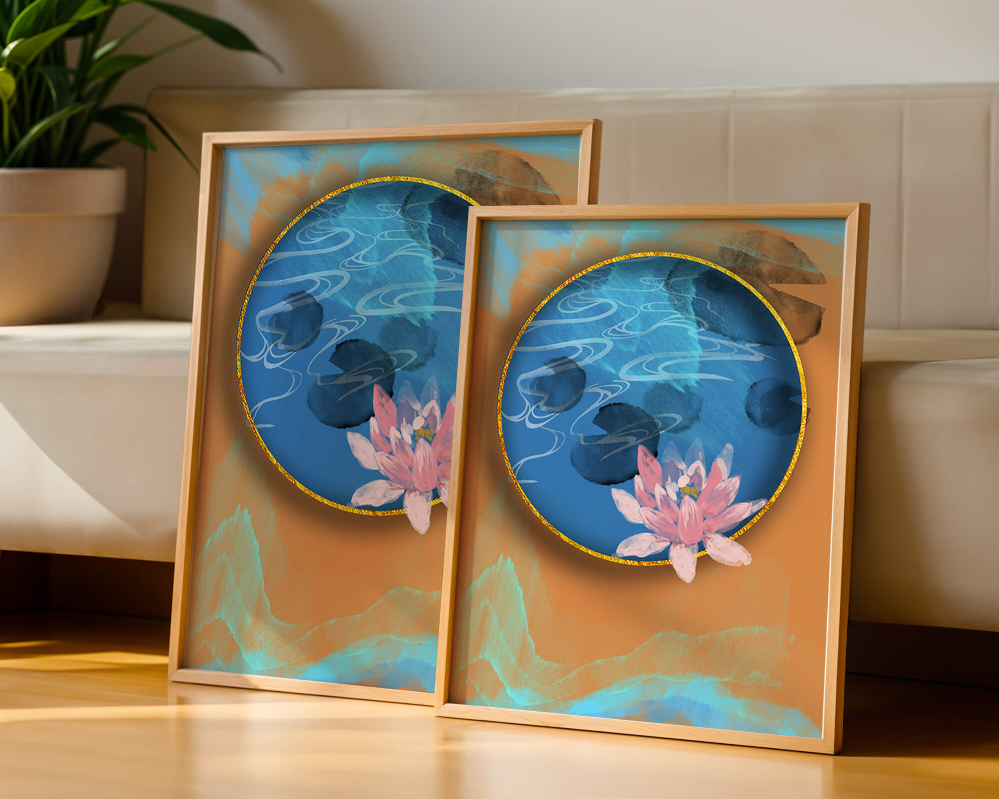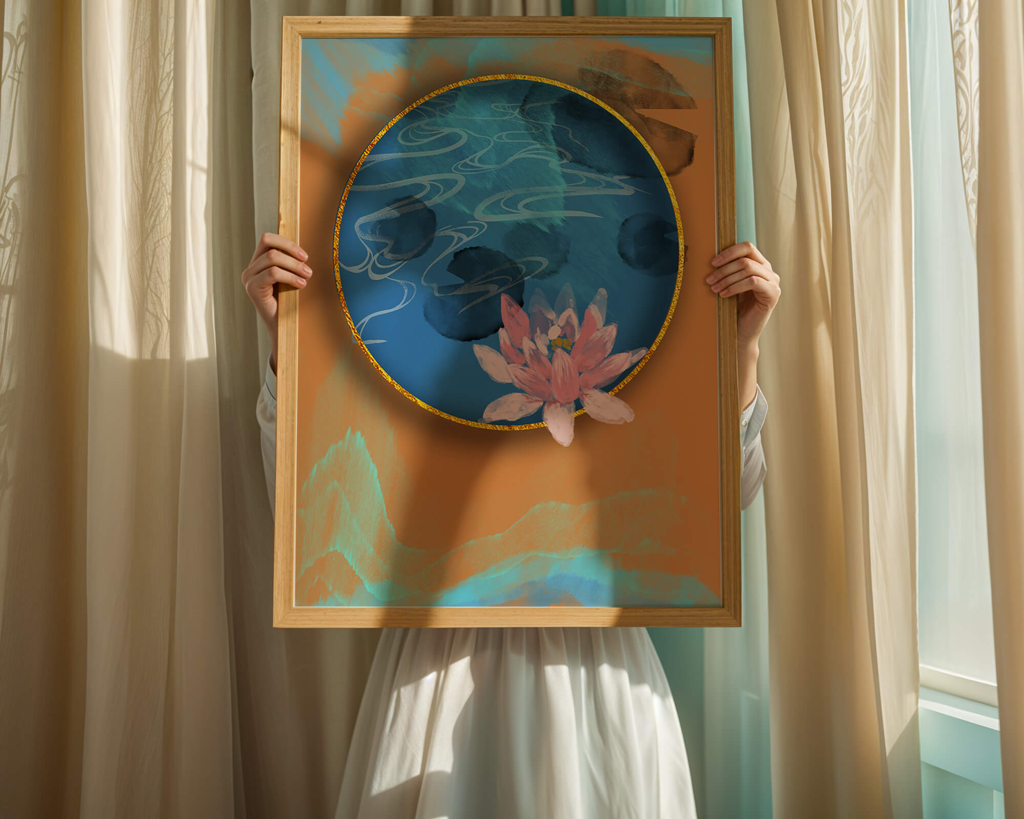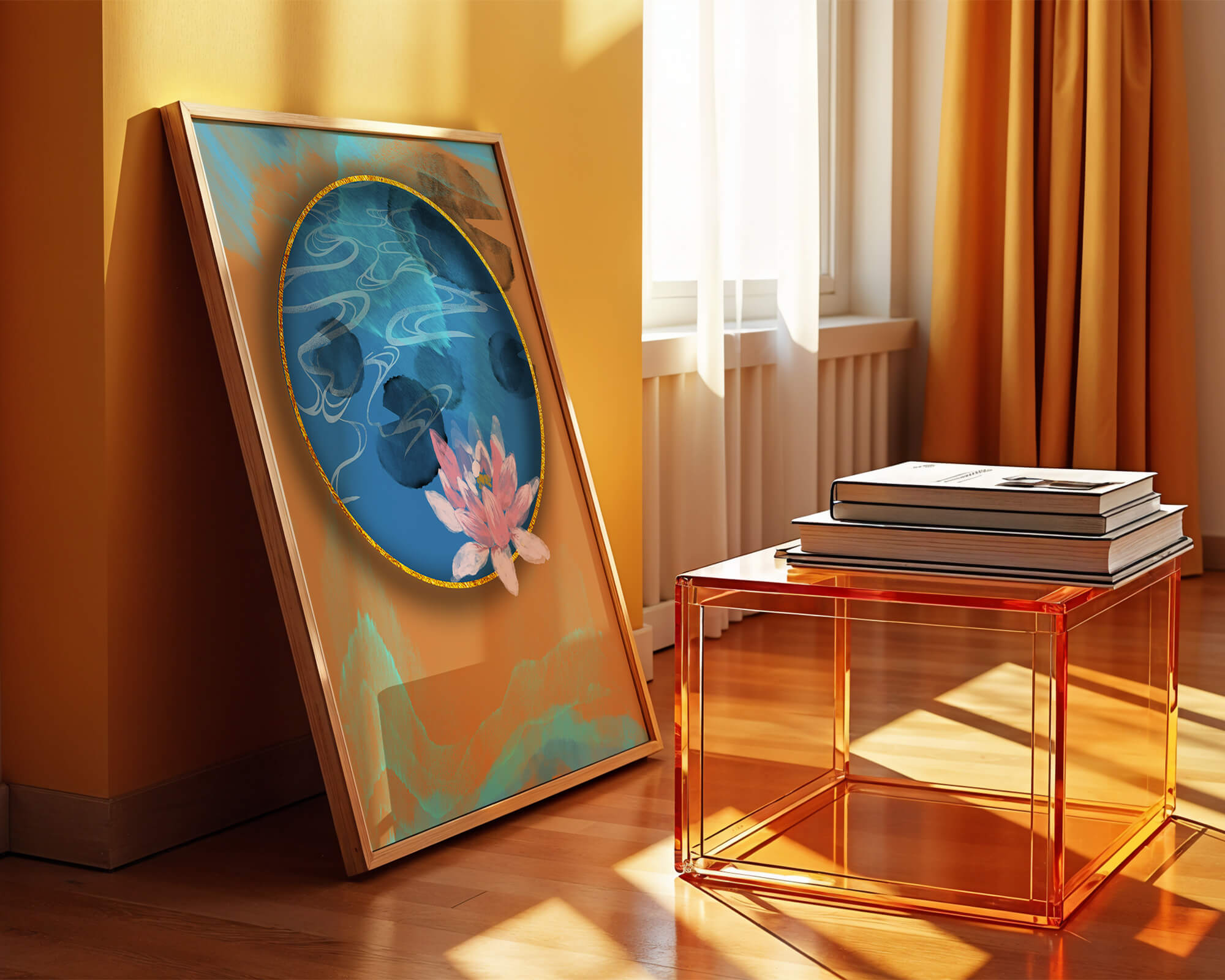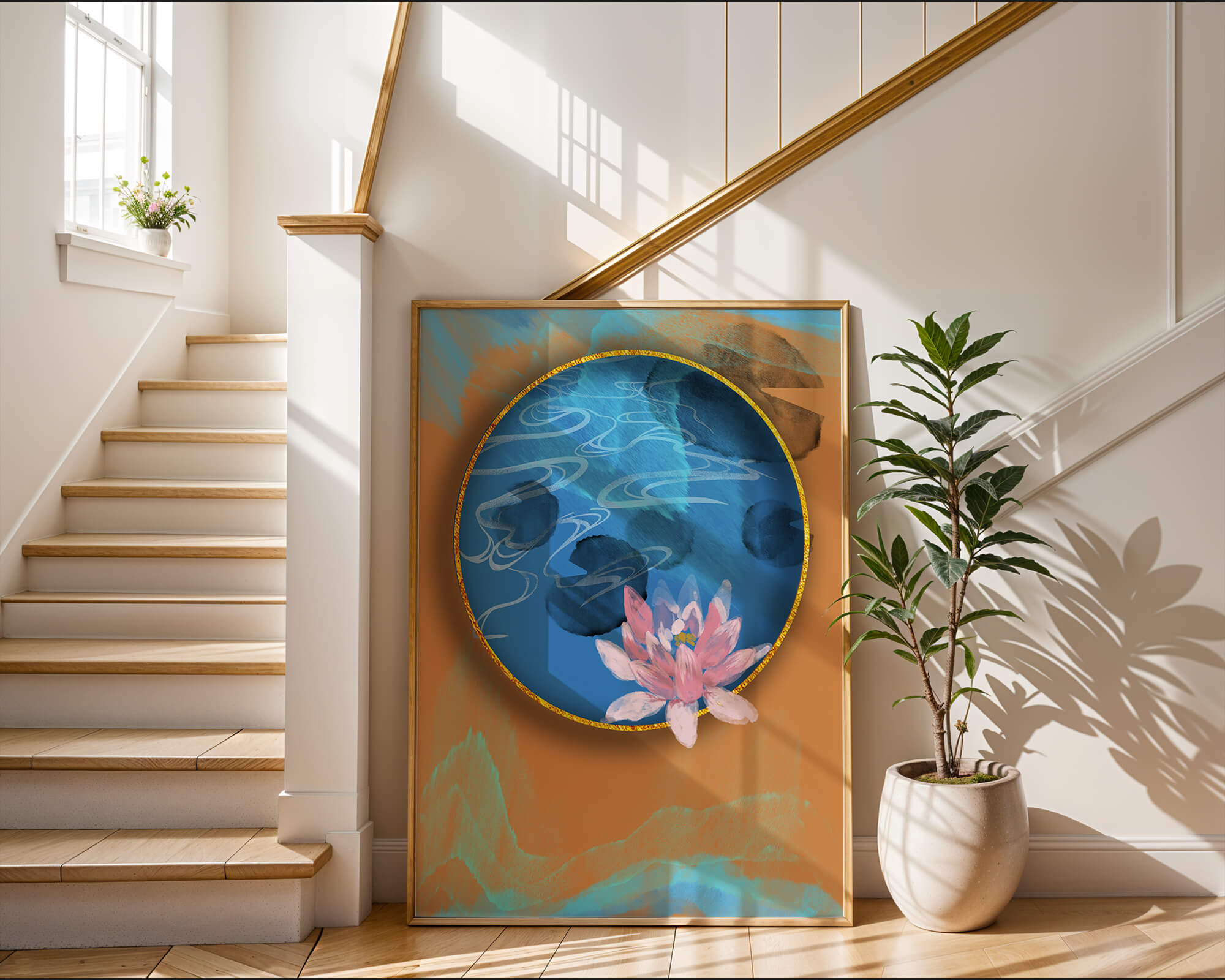 This piece of art captivates with its tranquil rendition of a water lily floating peacefully within a blue circular pond. The detailed floral illustration is emphasized by the intricate blending of colors that mimic ripples of water, creating a sense of calm and serenity.The gold border adds a touch of luxury, seamlessly integrating with the contrasting orange and blue abstract background. The overall design offers a modern aesthetic that embodies both elegance and harmony, making it a perfect addition to any space in need of a contemporary and nature-inspired accent.| Type |