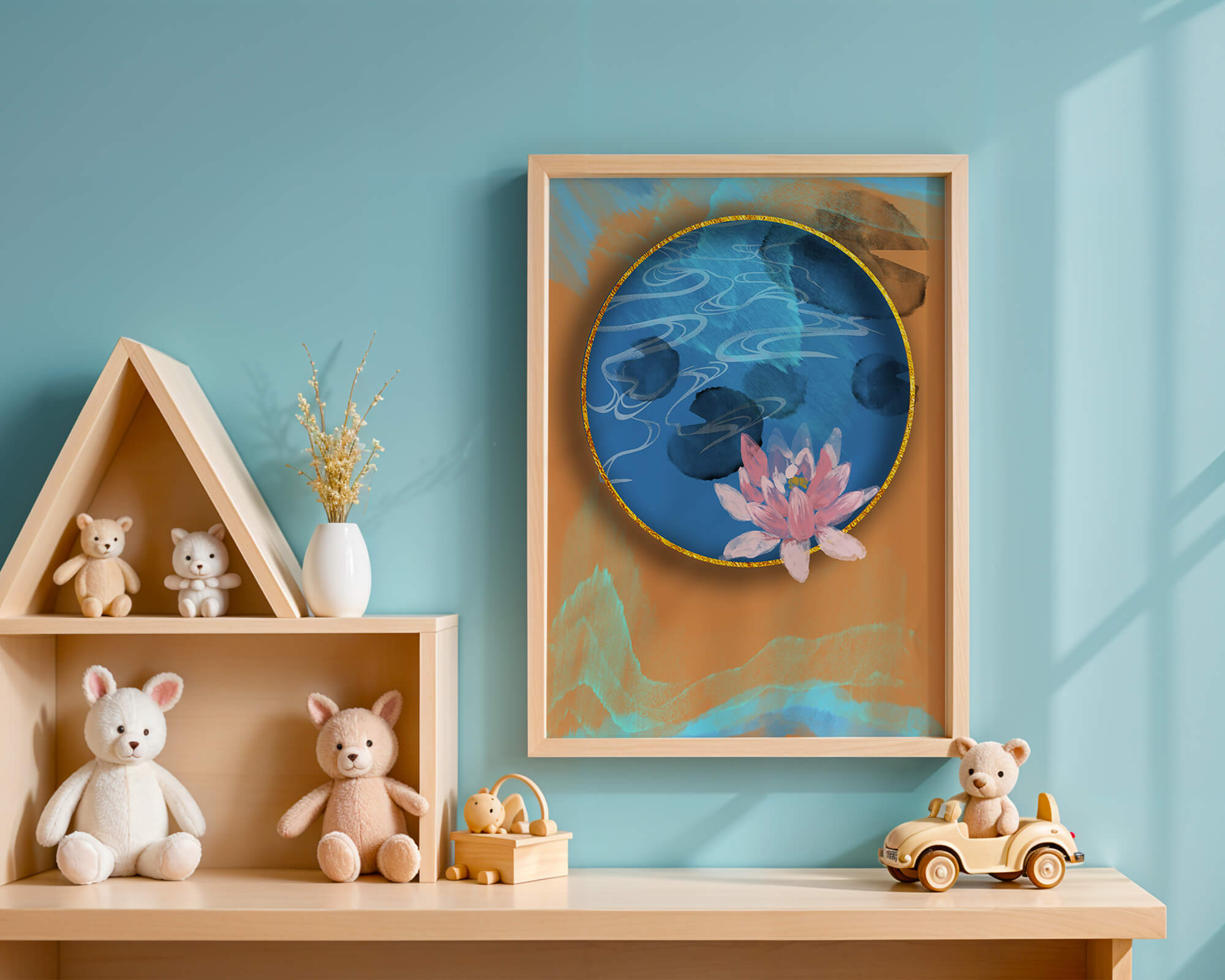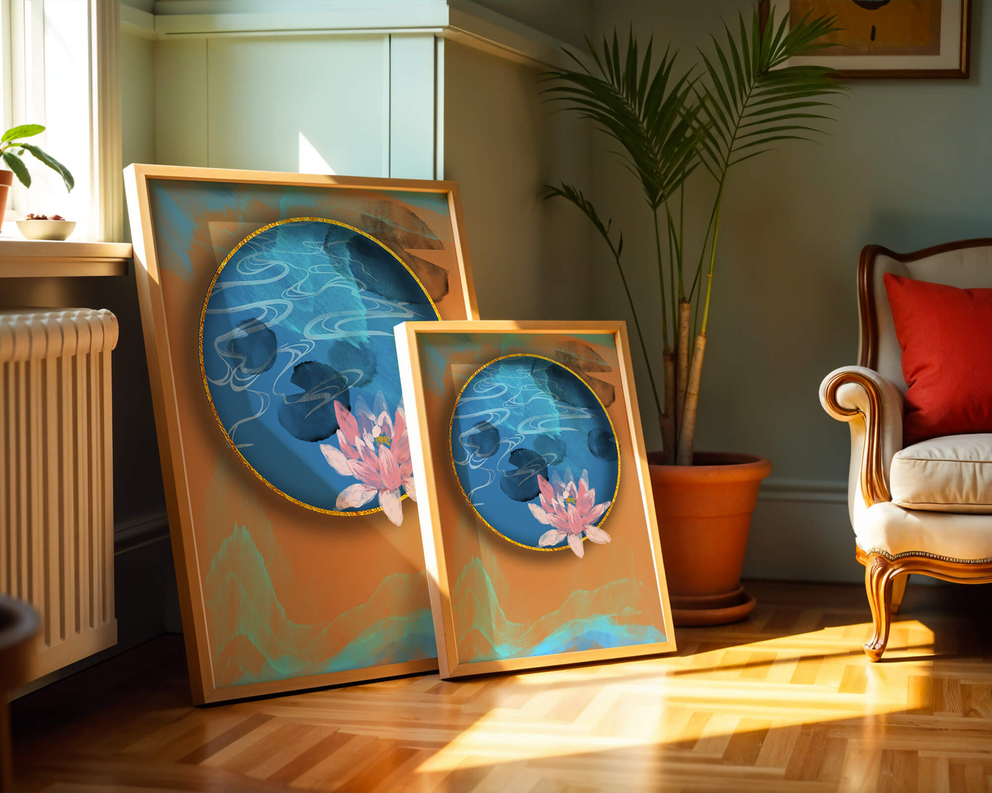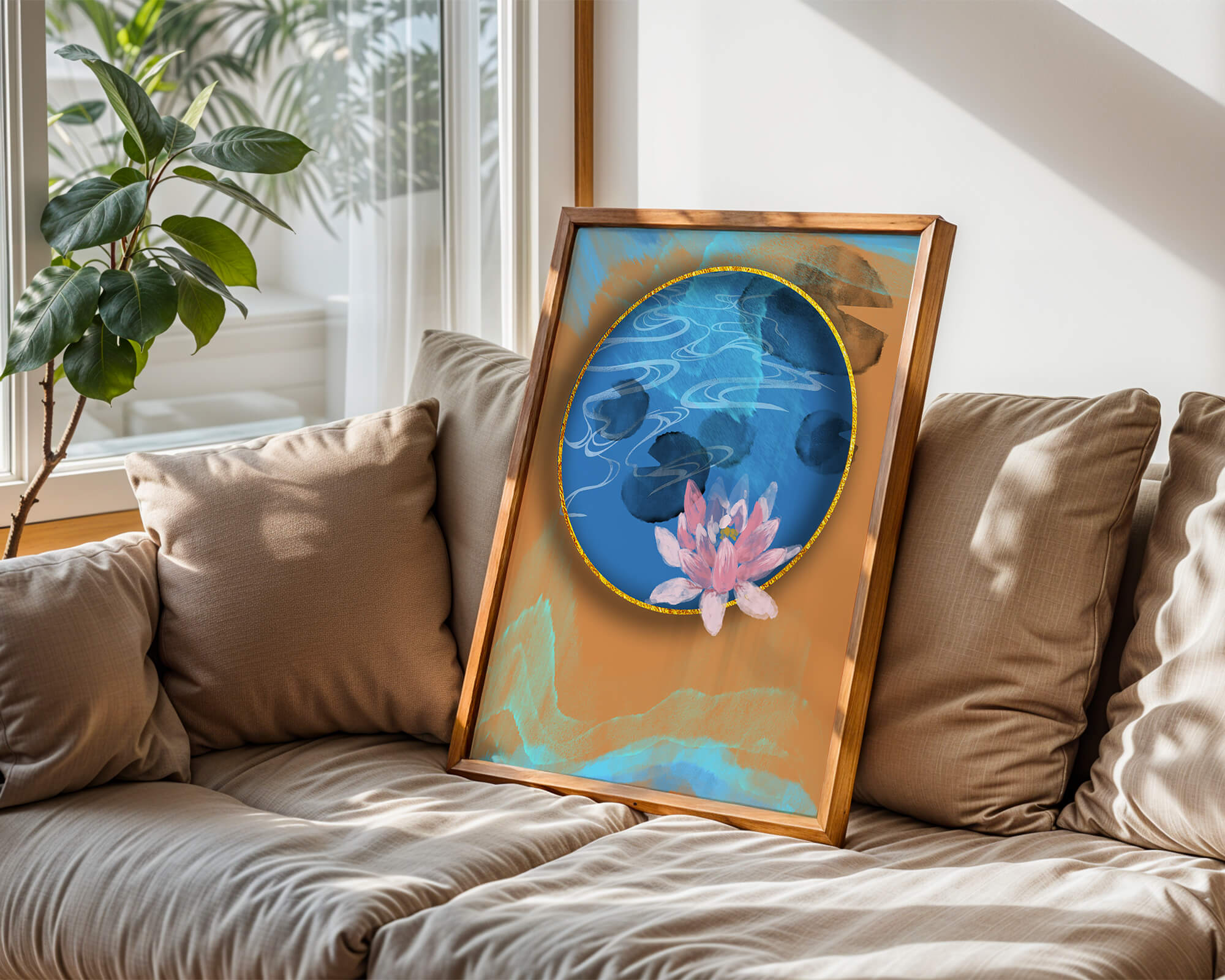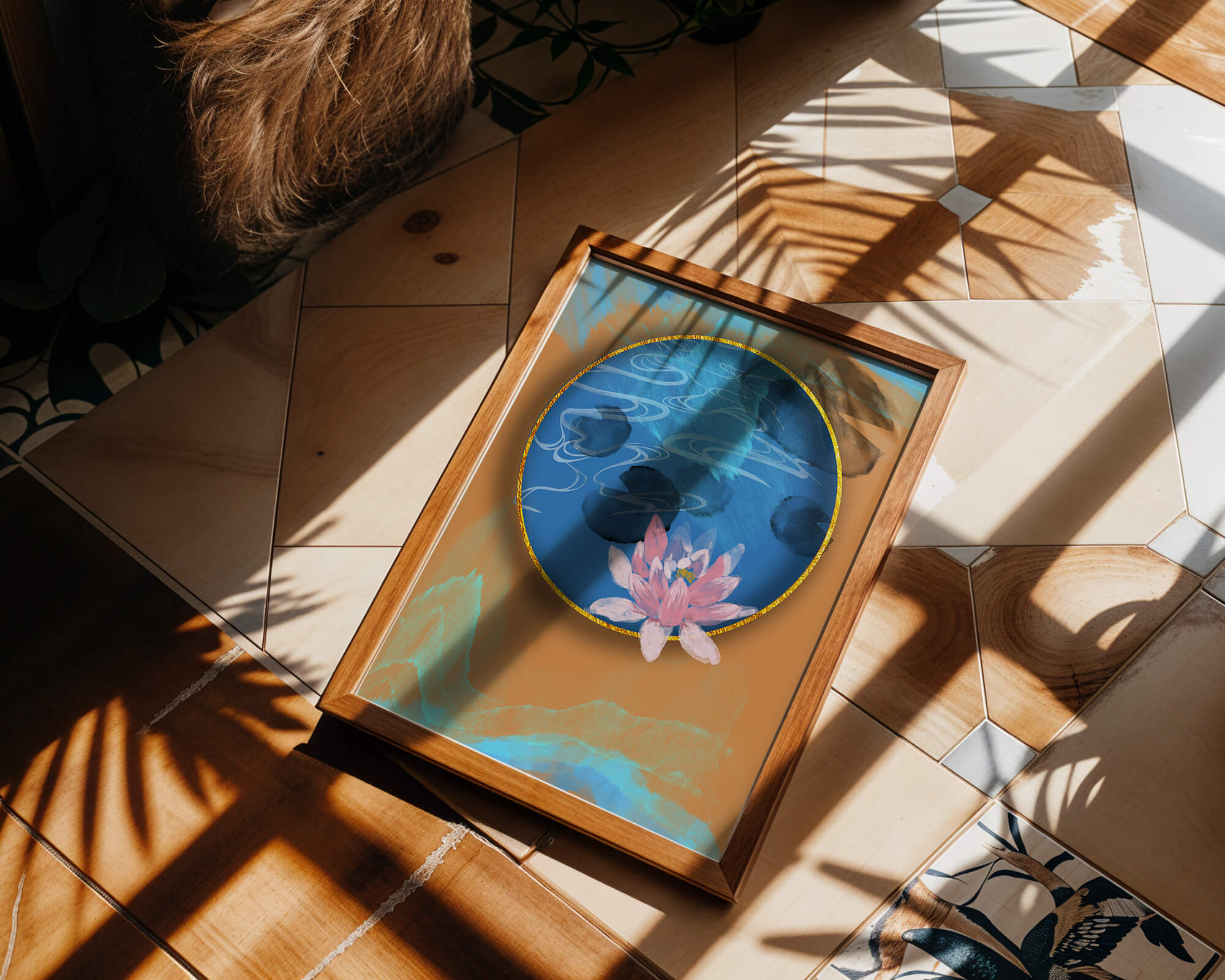 This piece of art captivates with its tranquil rendition of a water lily floating peacefully within a blue circular pond. The detailed floral illustration is emphasized by the intricate blending of colors that mimic ripples of water, creating a sense of calm and serenity.The gold border adds a touch of luxury, seamlessly integrating with the contrasting orange and blue abstract background. The overall design offers a modern aesthetic that embodies both elegance and harmony, making it a perfect addition to any space in need of a contemporary and nature-inspired accent.| Type |