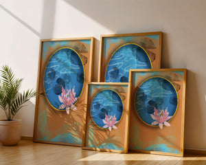 The image presents an abstract artistic composition featuring a serene blue pond encapsulating a beautifully depicted water lily. The artwork is elegantly framed with a shimmering gold band that contrasts with the vibrant orange and blue backdrop.
