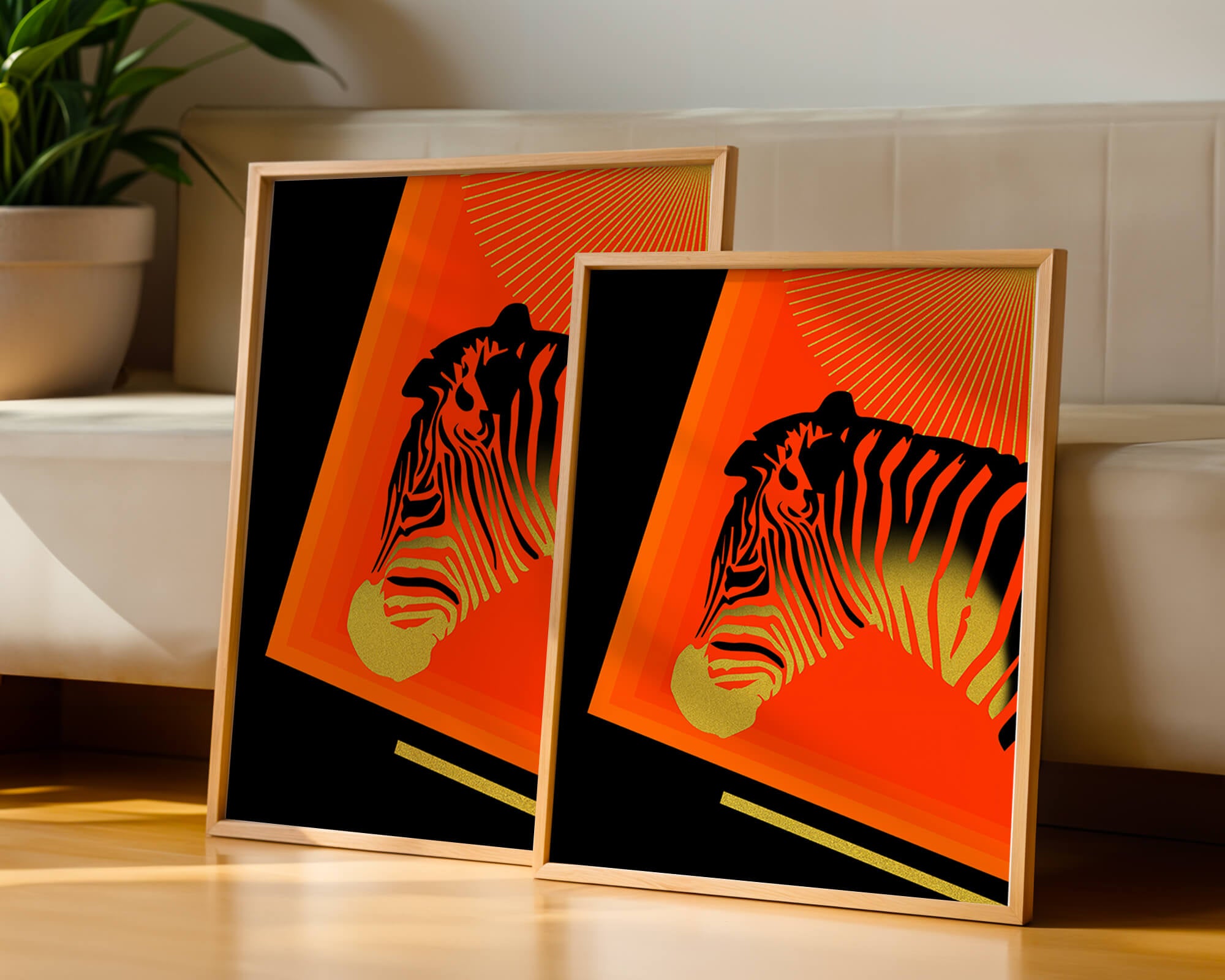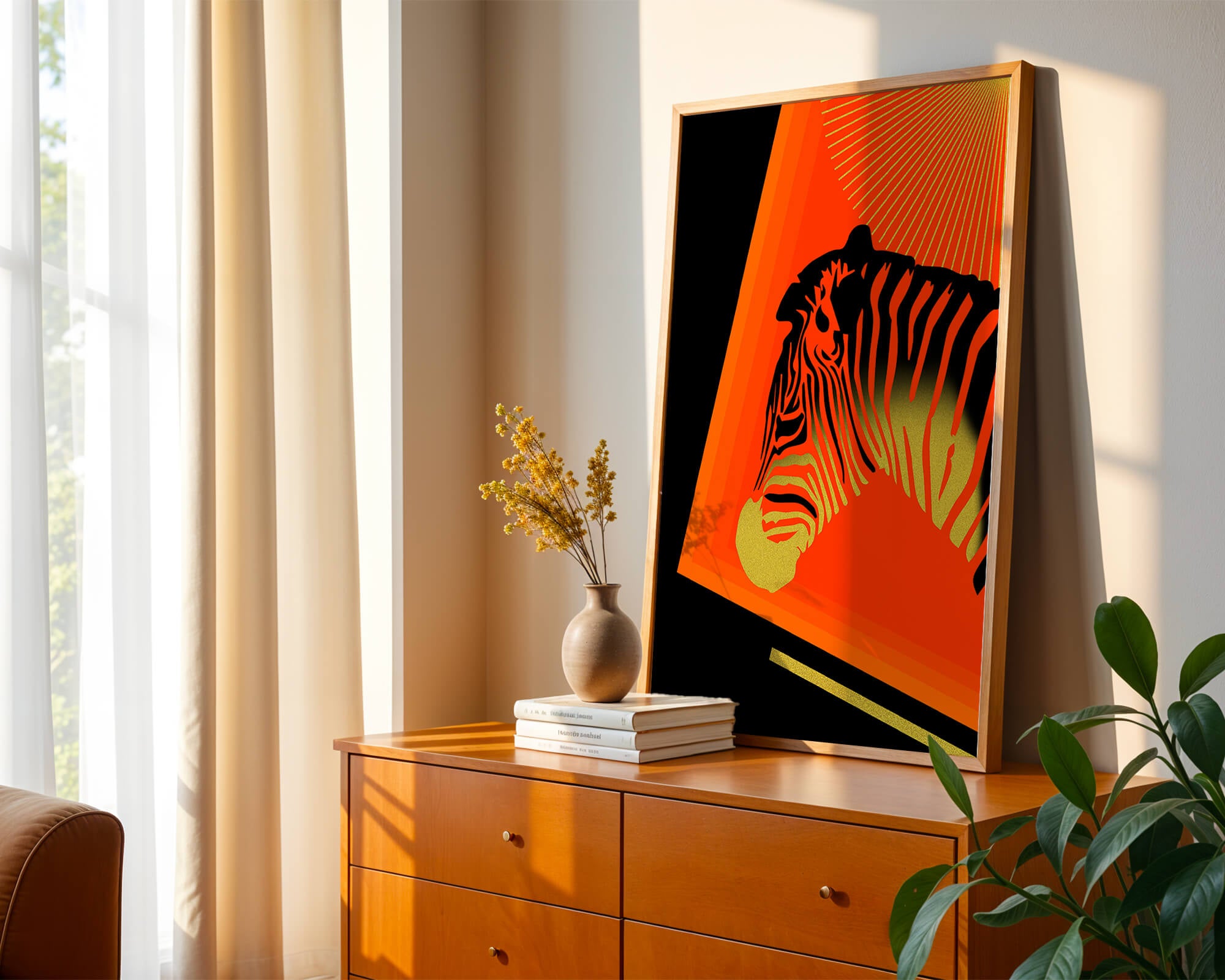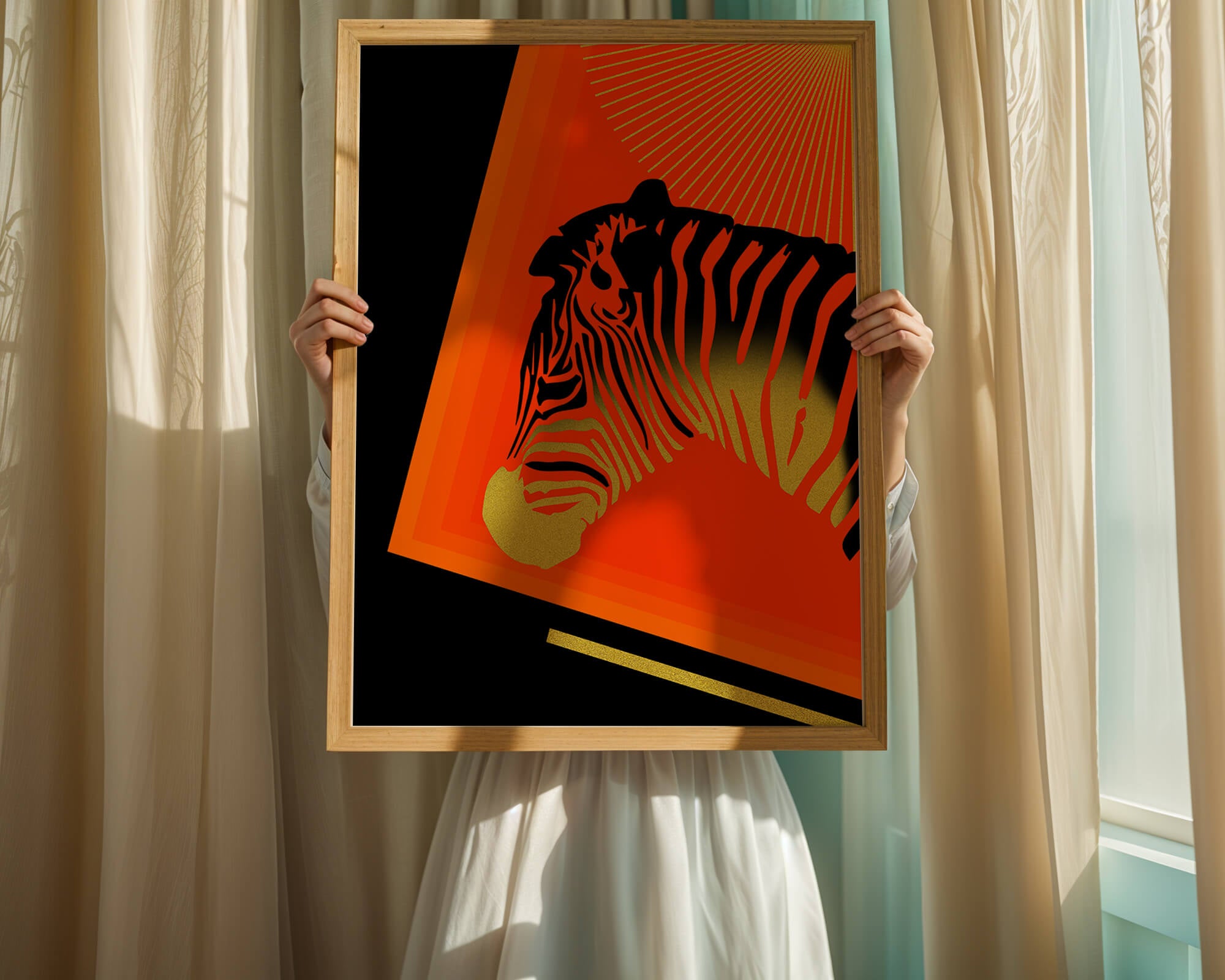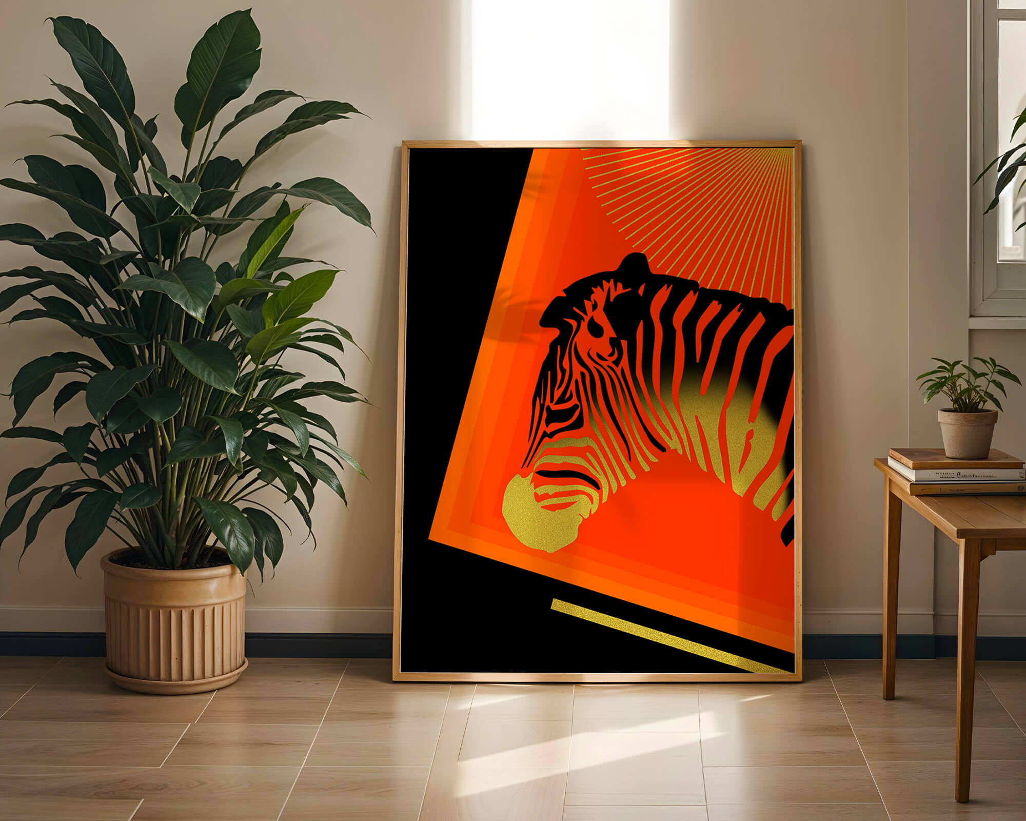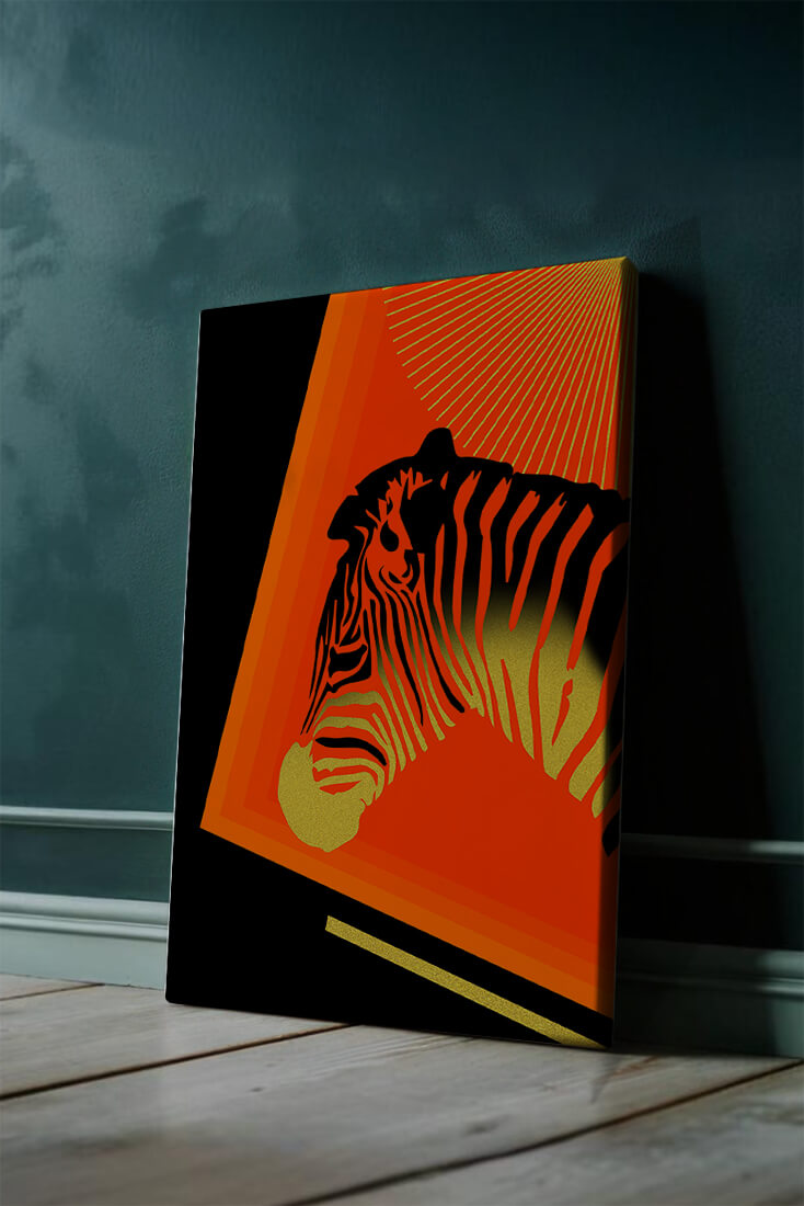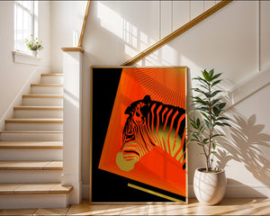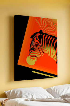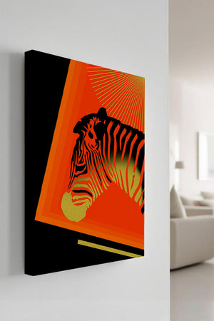 The image showcases a striking abstract depiction of a zebra, set against a vibrant orange background. The zebras stripes are accentuated with golden elements, creating a bold and modern showcase of wildlife art. The dynamic composition is both eye-catching and stylish, perfect for adding a touch of the exotic to any room.