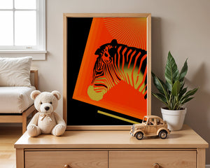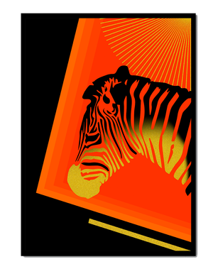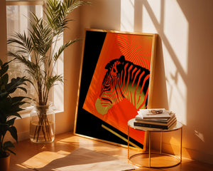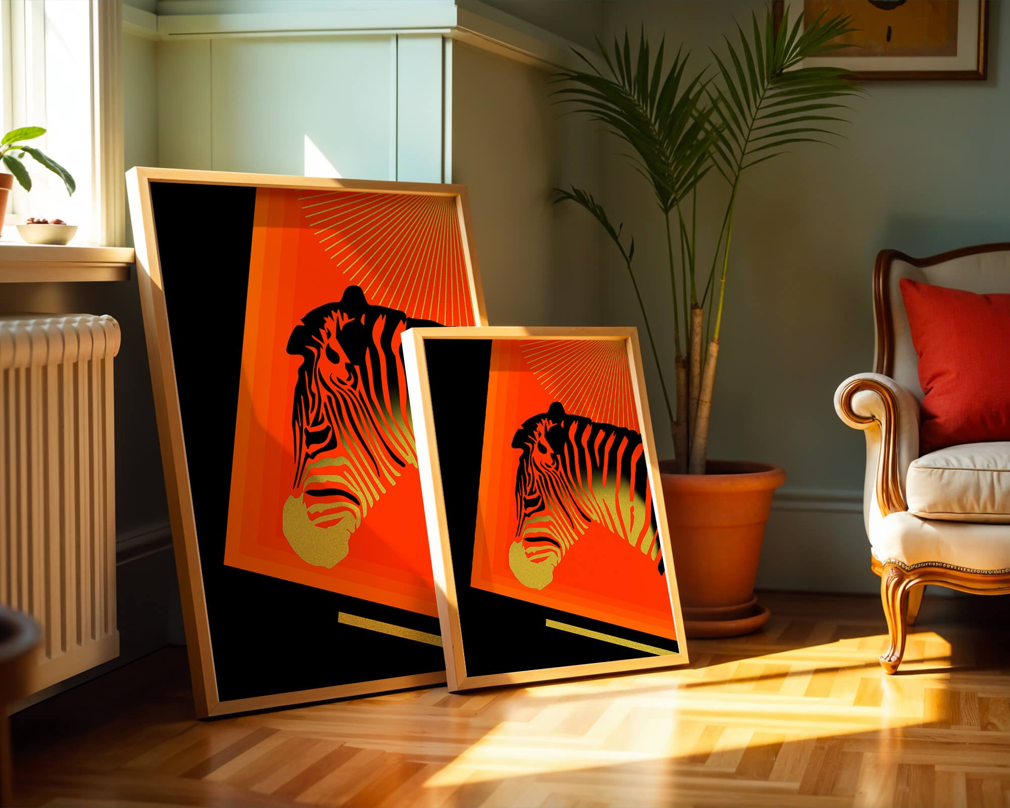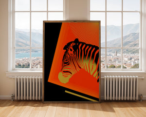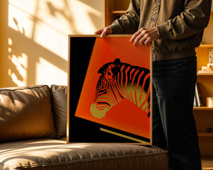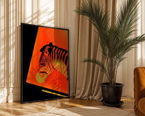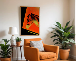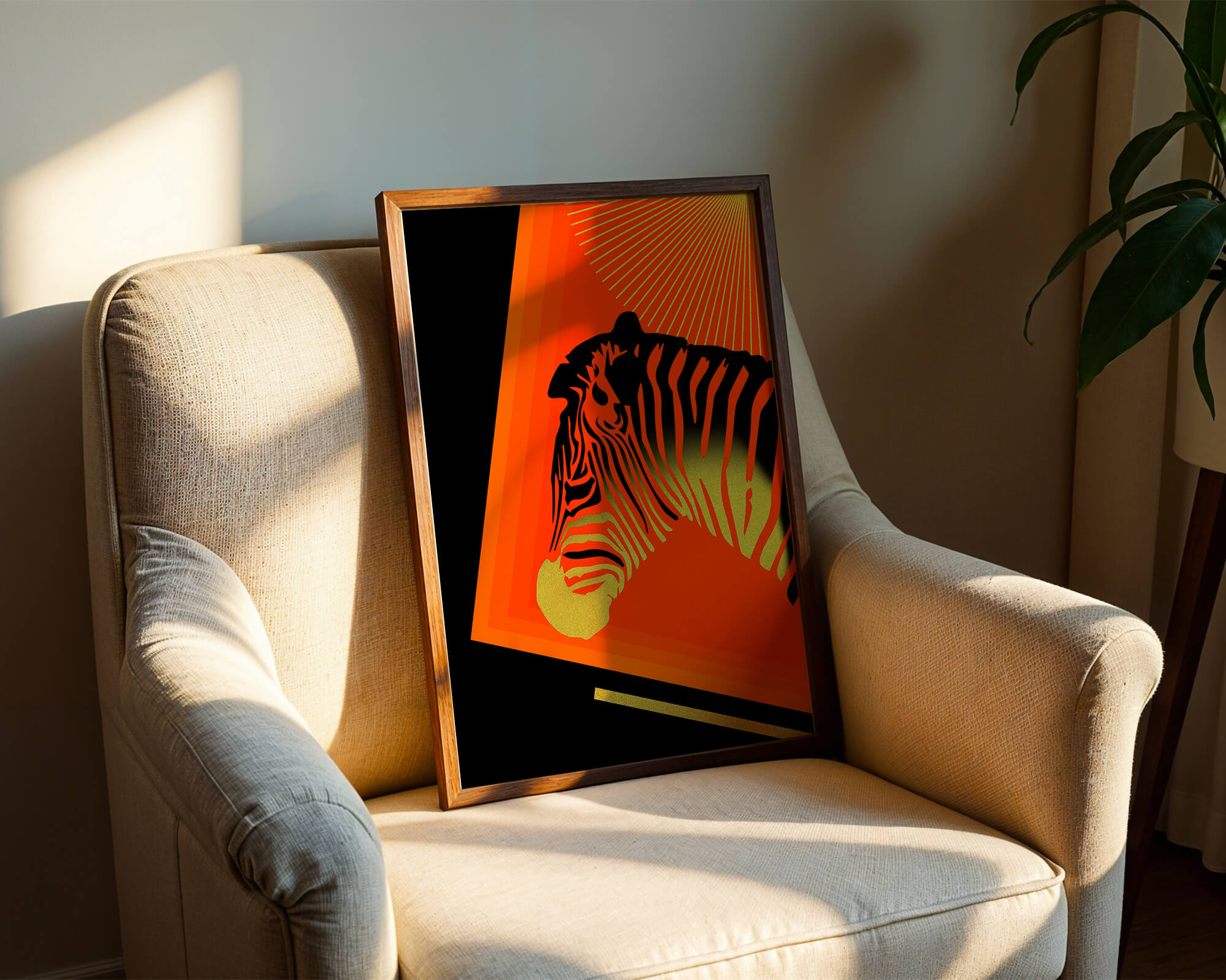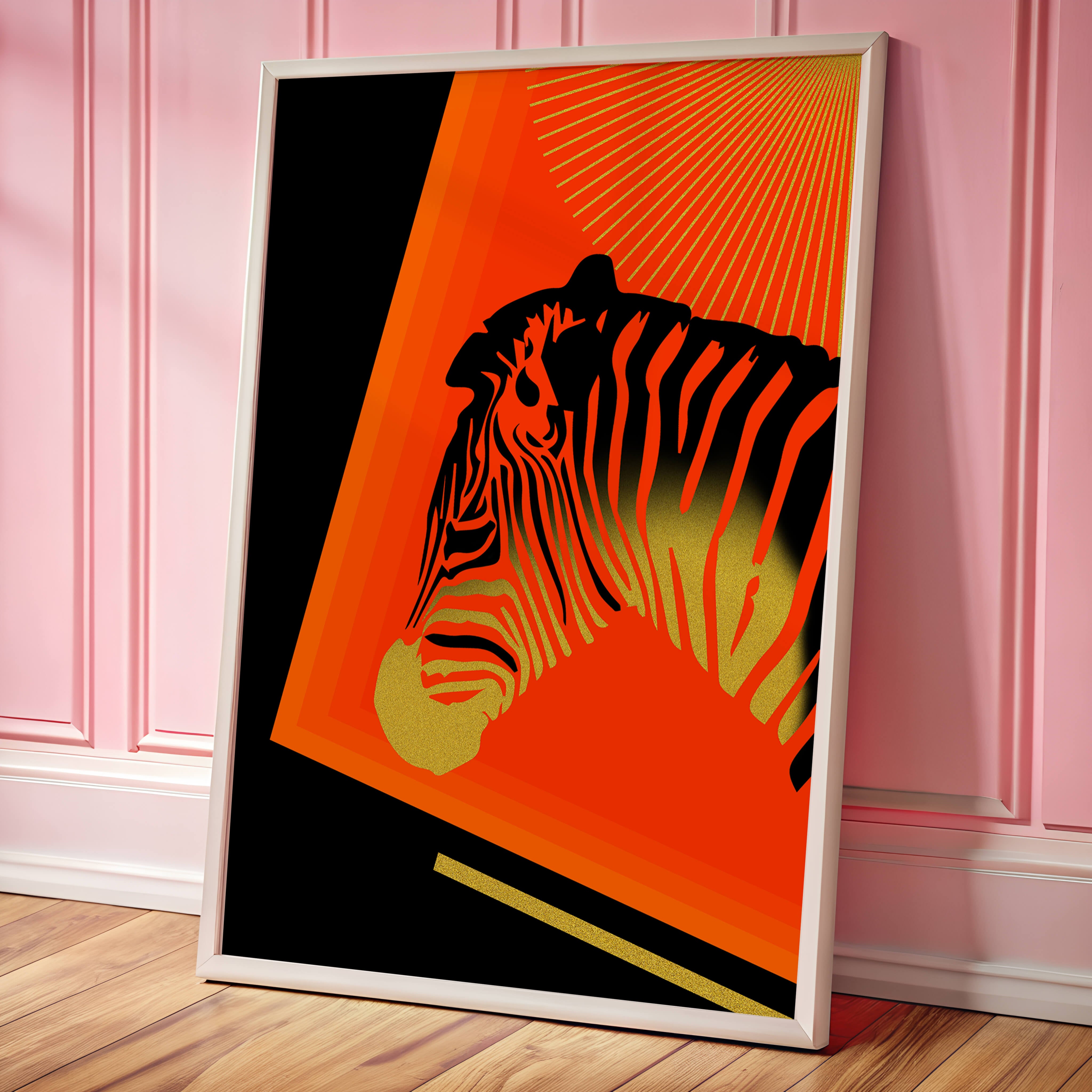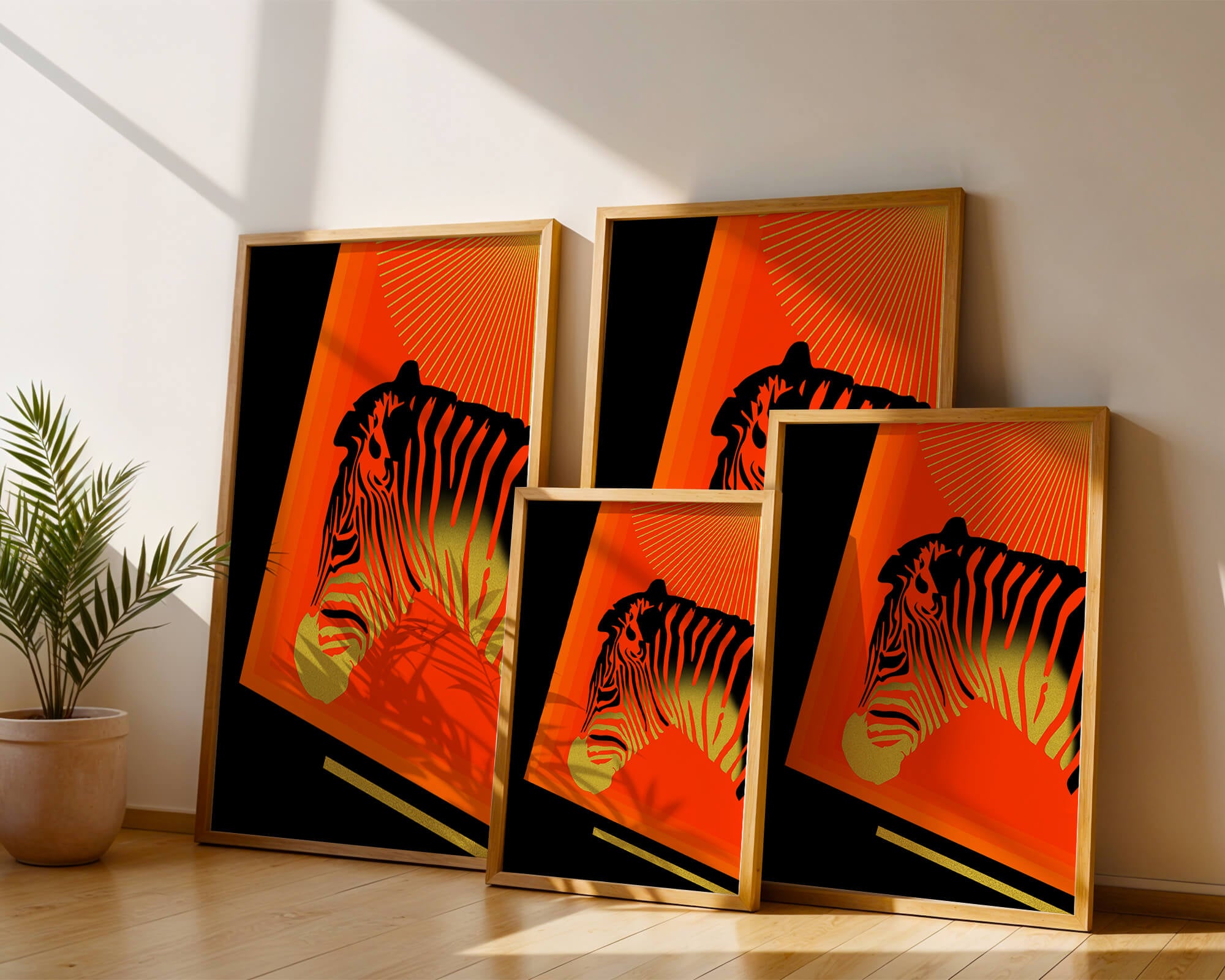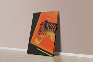 The image showcases a striking abstract depiction of a zebra, set against a vibrant orange background. The zebras stripes are accentuated with golden elements, creating a bold and modern showcase of wildlife art. The dynamic composition is both eye-catching and stylish, perfect for adding a touch of the exotic to any room.