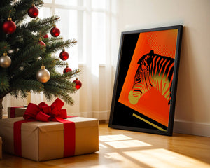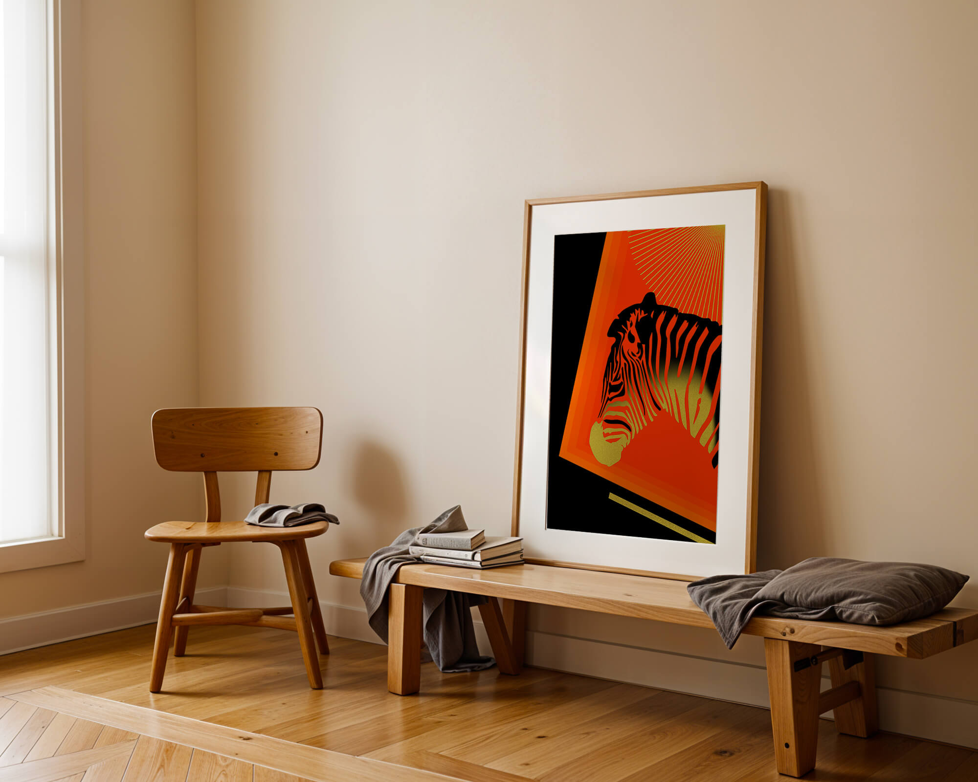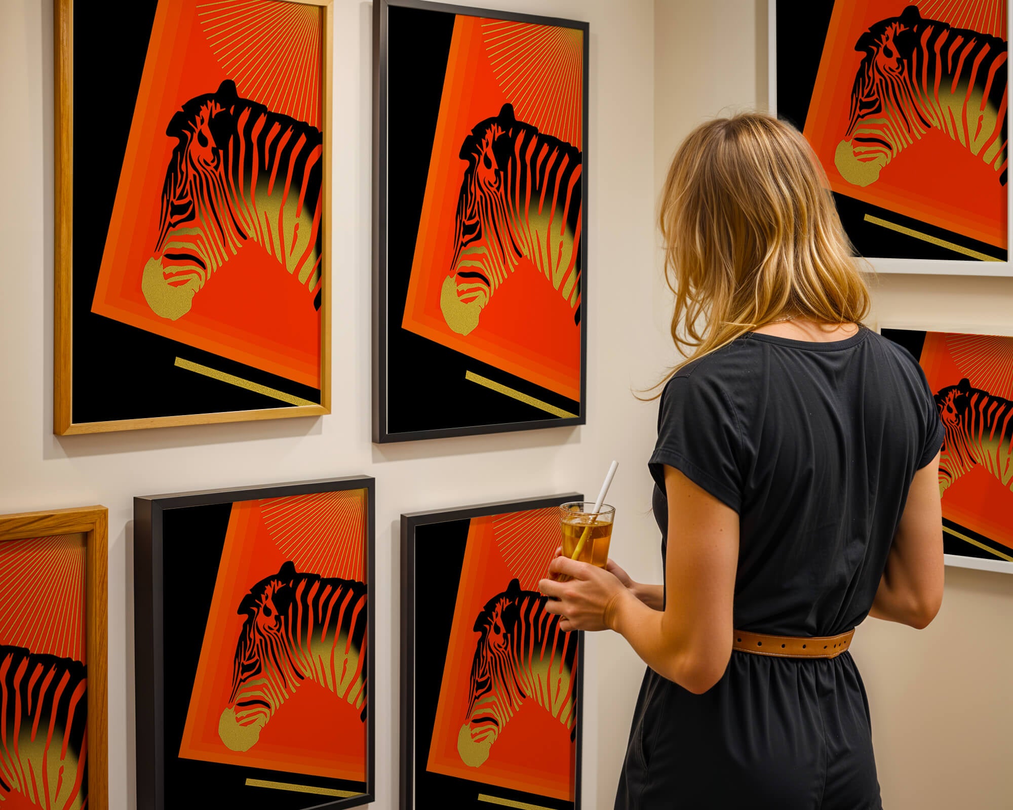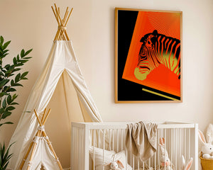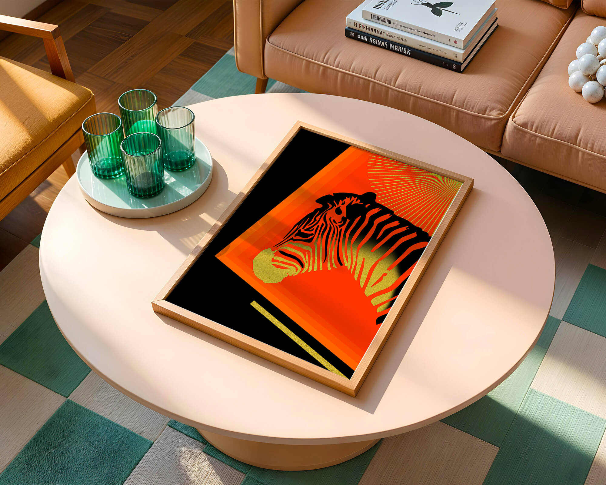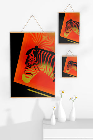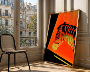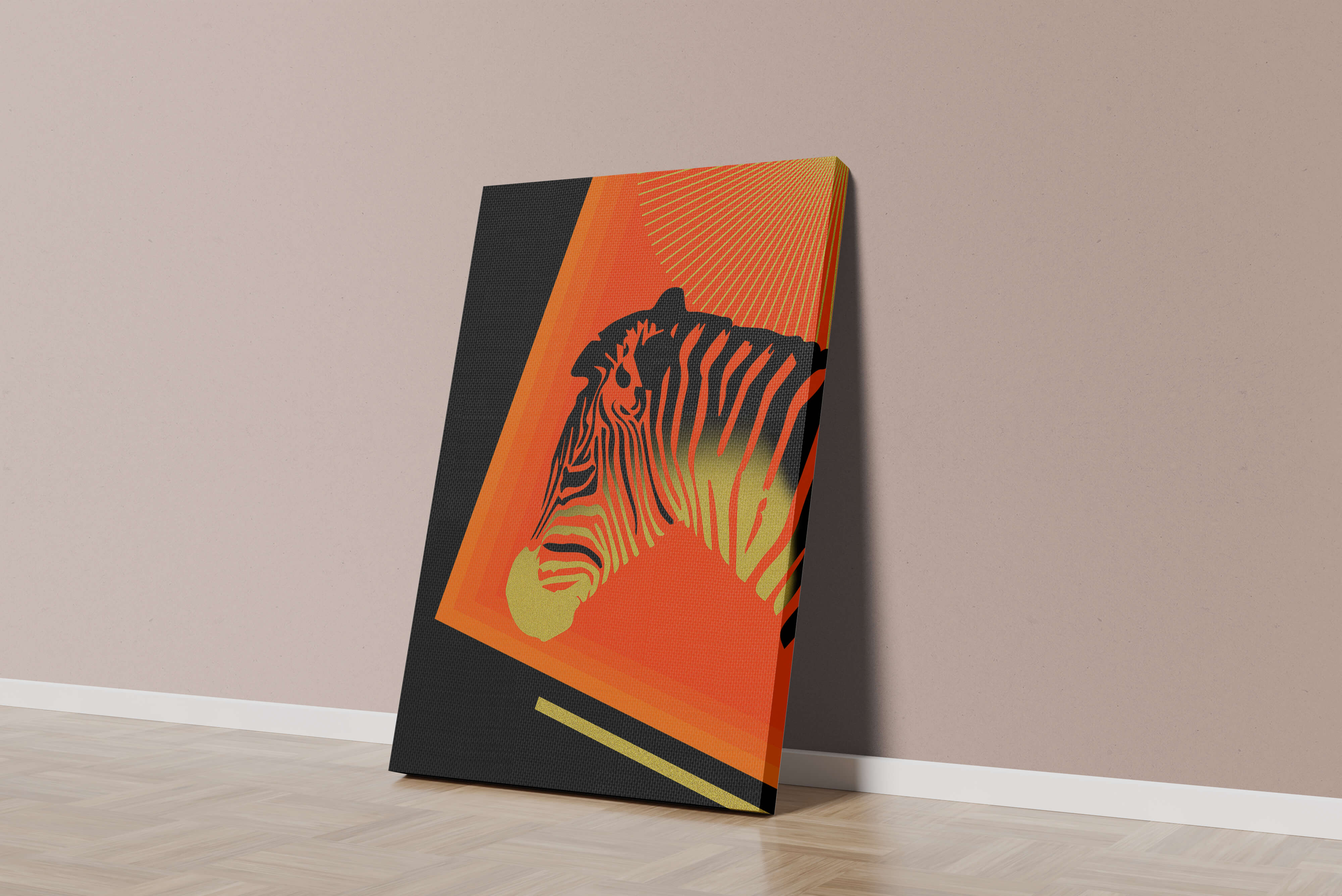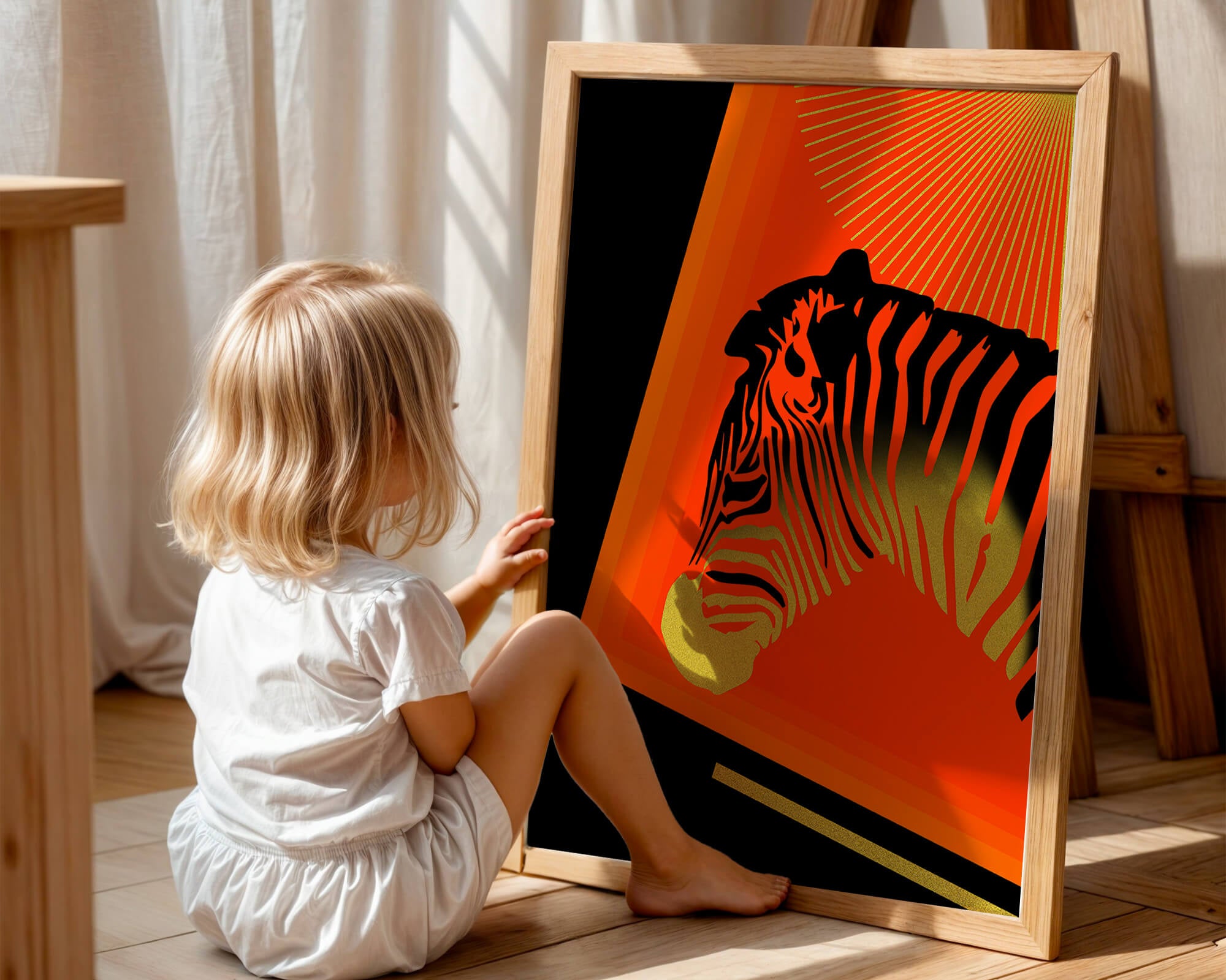 The image showcases a striking abstract depiction of a zebra, set against a vibrant orange background. The zebras stripes are accentuated with golden elements, creating a bold and modern showcase of wildlife art. The dynamic composition is both eye-catching and stylish, perfect for adding a touch of the exotic to any room.