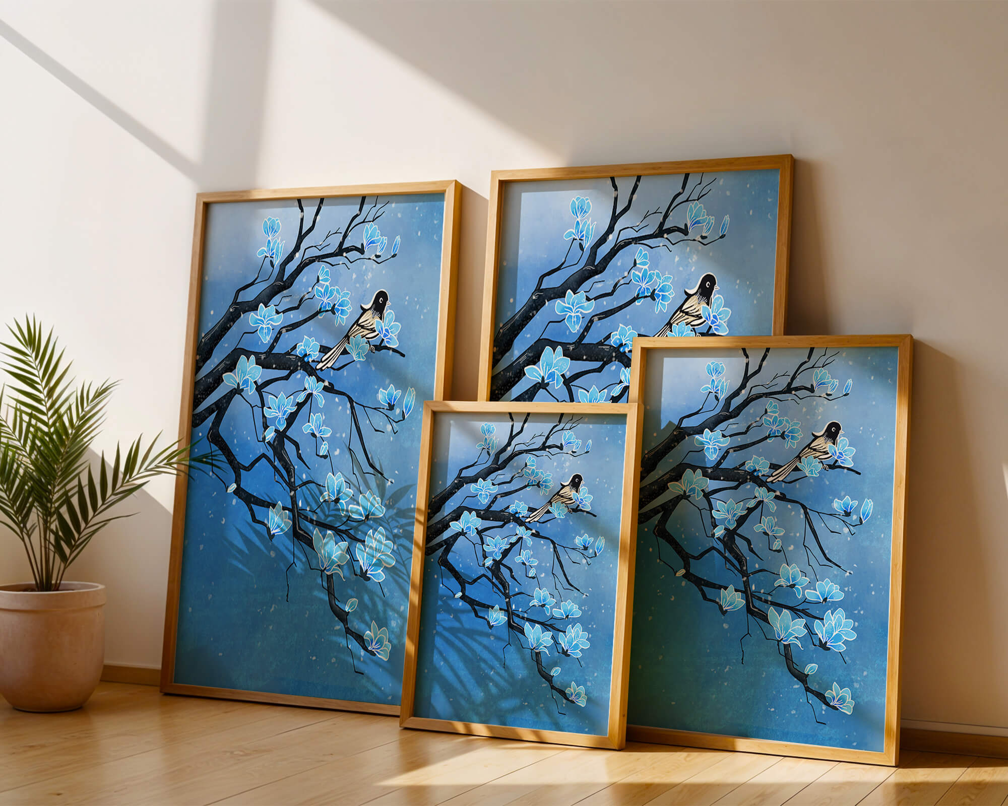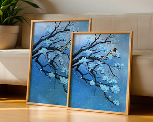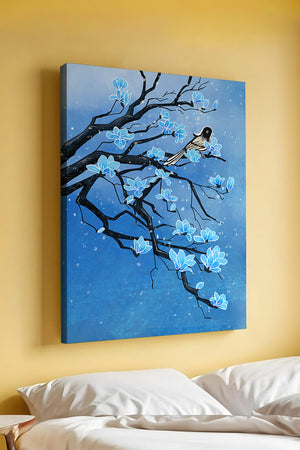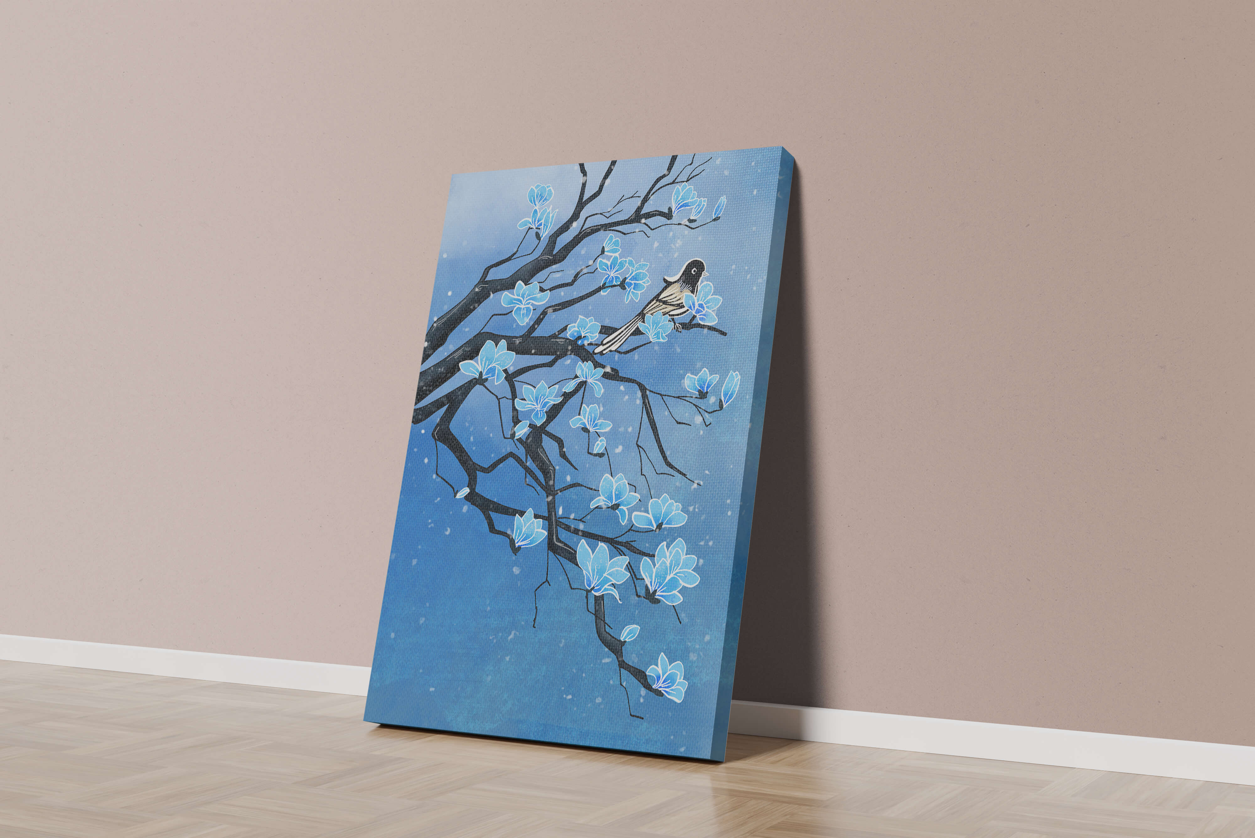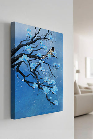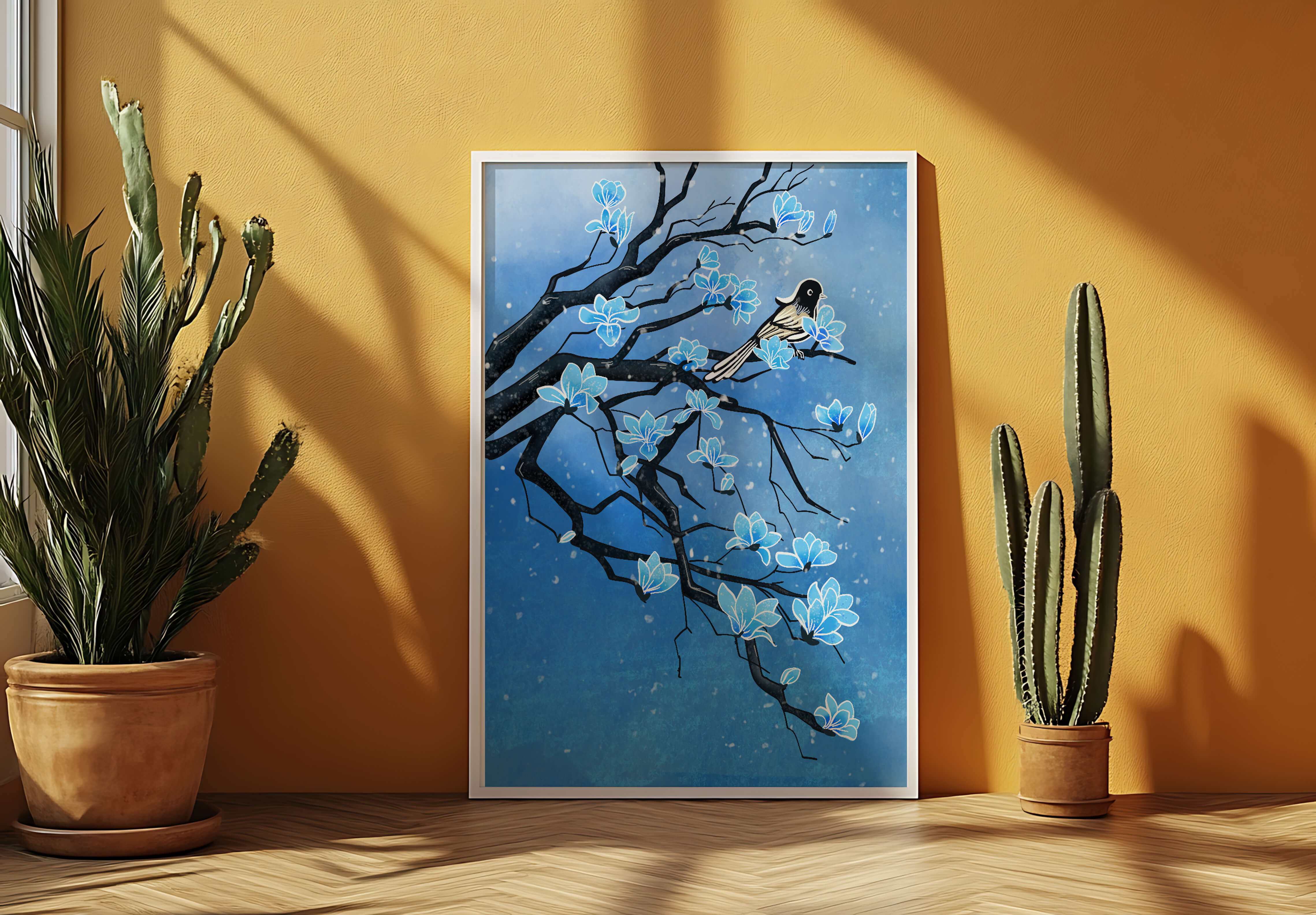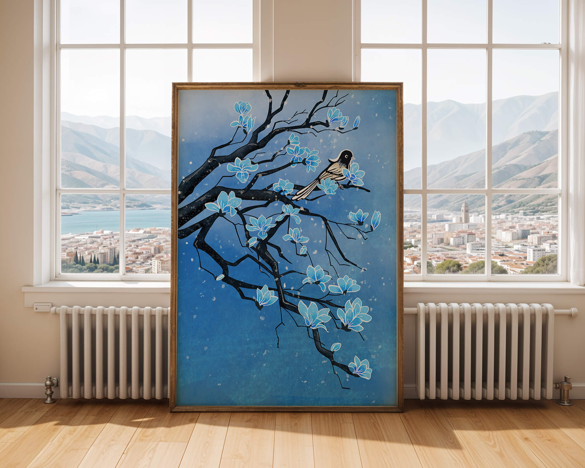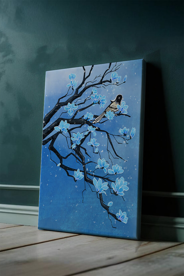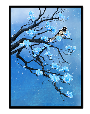 This image captures the essence of winter with a mesmerizing blend of art and nature. The vivid blue blossoms stand in contrast against the muted tones of the winter sky, drawing attention to the delicate details and harmonious composition. The bird, perched gracefully among the flowers, adds a touch of life and vibrancy to the otherwise still scene. The artistic approach in this piece highlights the contrast between the barrenness of winter and the promise of spring, symbolized by the blossoms. The interplay of colors and textures invites viewers to appreciate the serene beauty found in the seasonal cycle of nature.| Type |