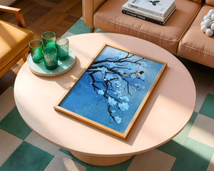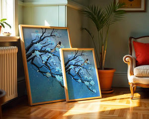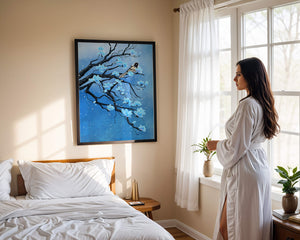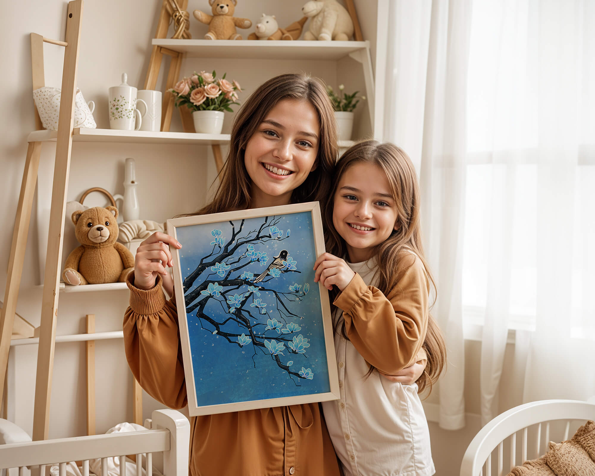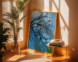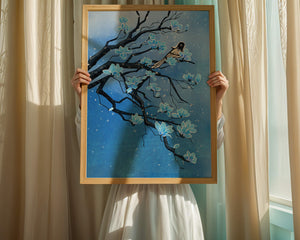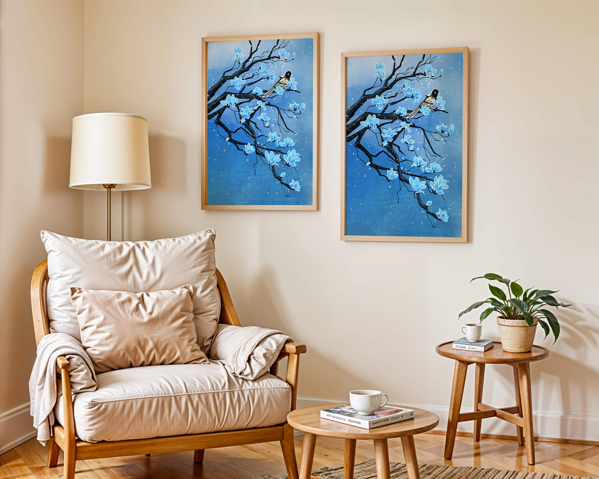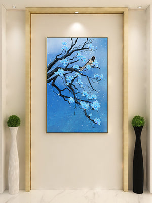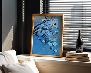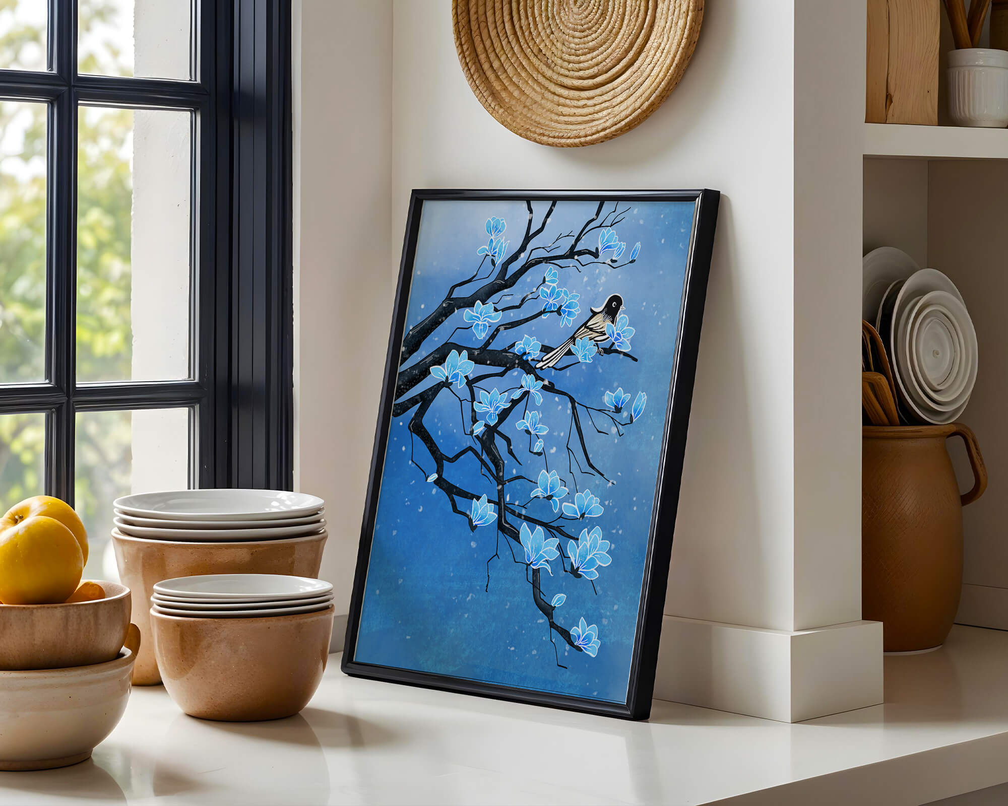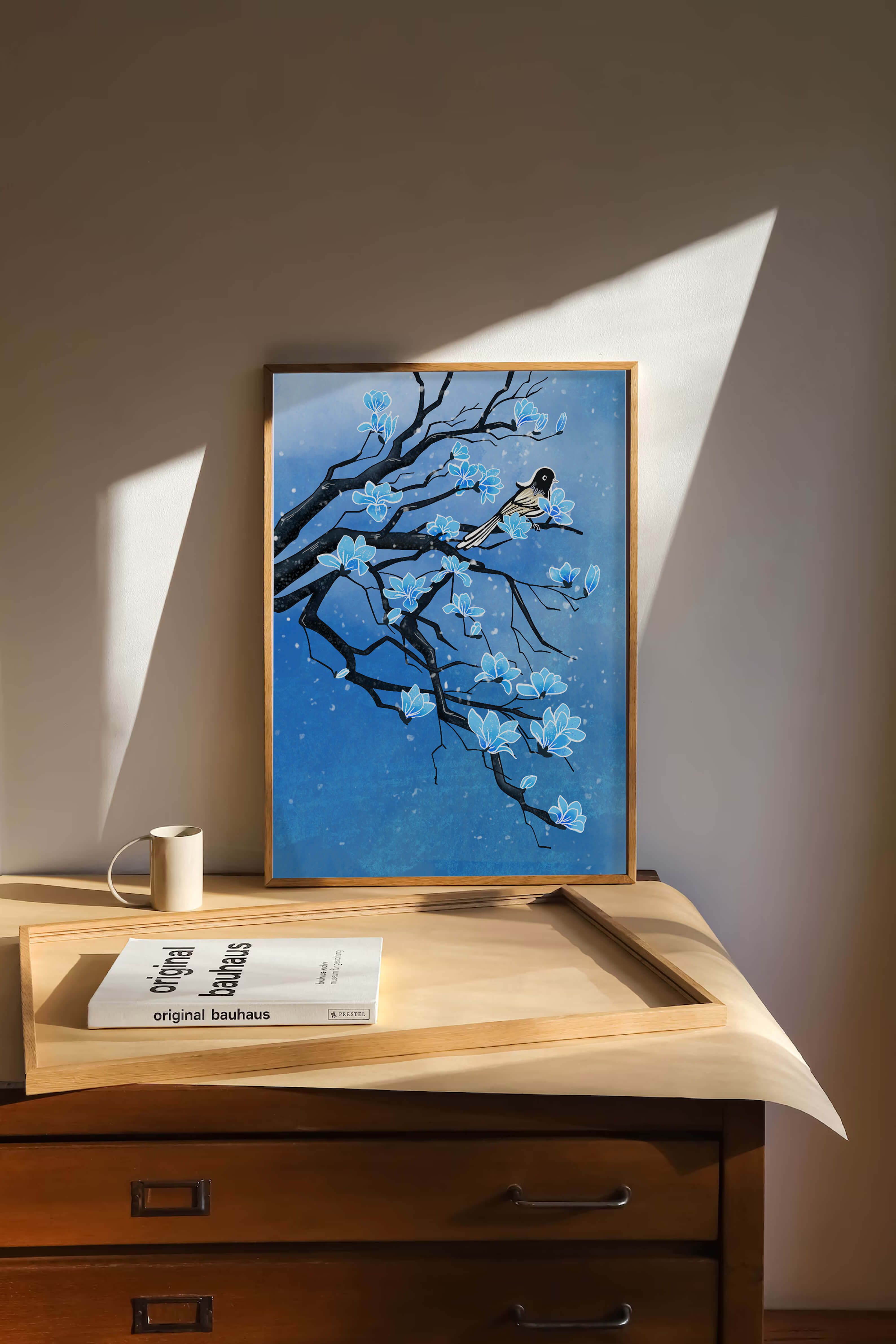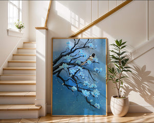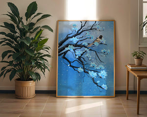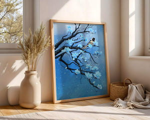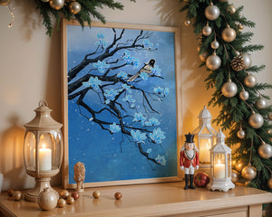 This image captures the essence of winter with a mesmerizing blend of art and nature. The vivid blue blossoms stand in contrast against the muted tones of the winter sky, drawing attention to the delicate details and harmonious composition. The bird, perched gracefully among the flowers, adds a touch of life and vibrancy to the otherwise still scene. The artistic approach in this piece highlights the contrast between the barrenness of winter and the promise of spring, symbolized by the blossoms. The interplay of colors and textures invites viewers to appreciate the serene beauty found in the seasonal cycle of nature.| Type |
