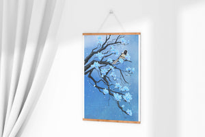 A stunning visual composition featuring a beautiful bird perched on a branch covered with blue blossoms. The scene is set against a serene winter background, creating a tranquil and peaceful atmosphere.