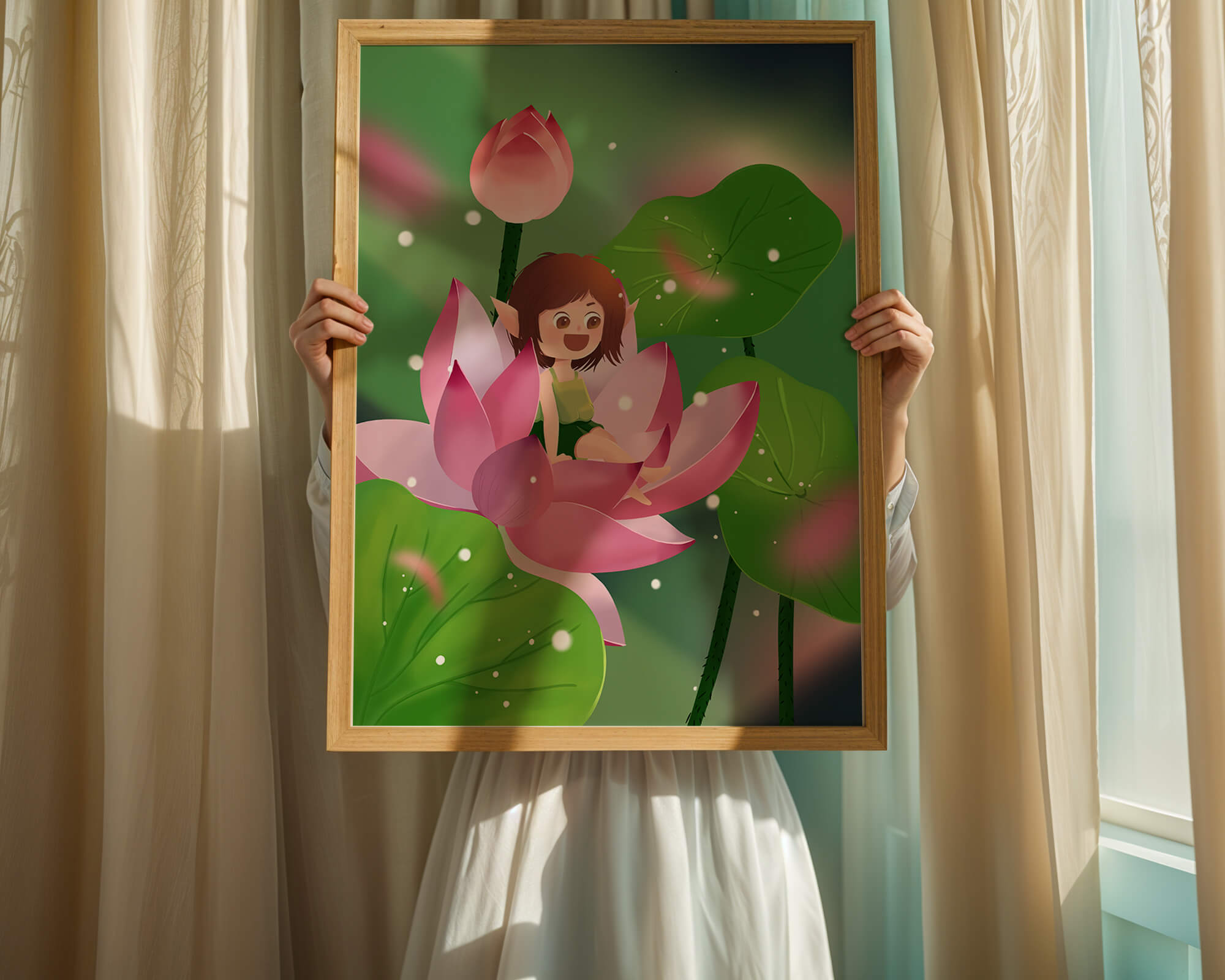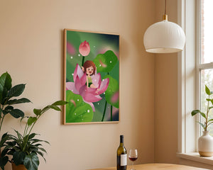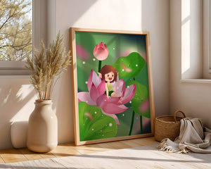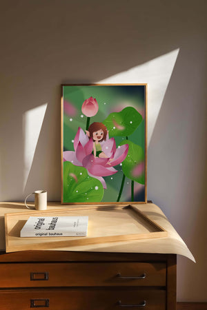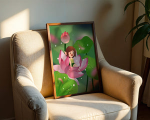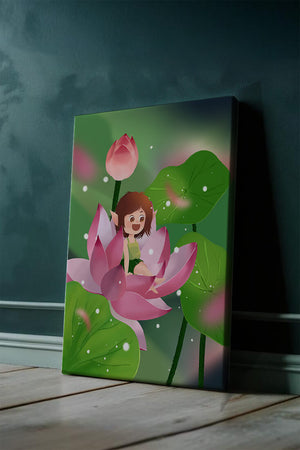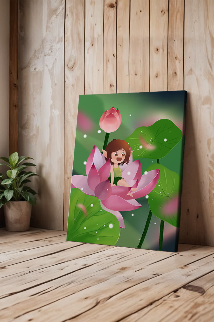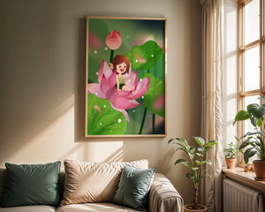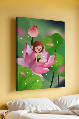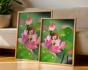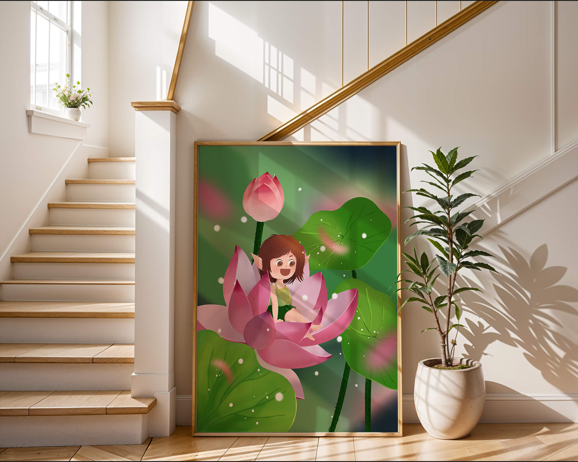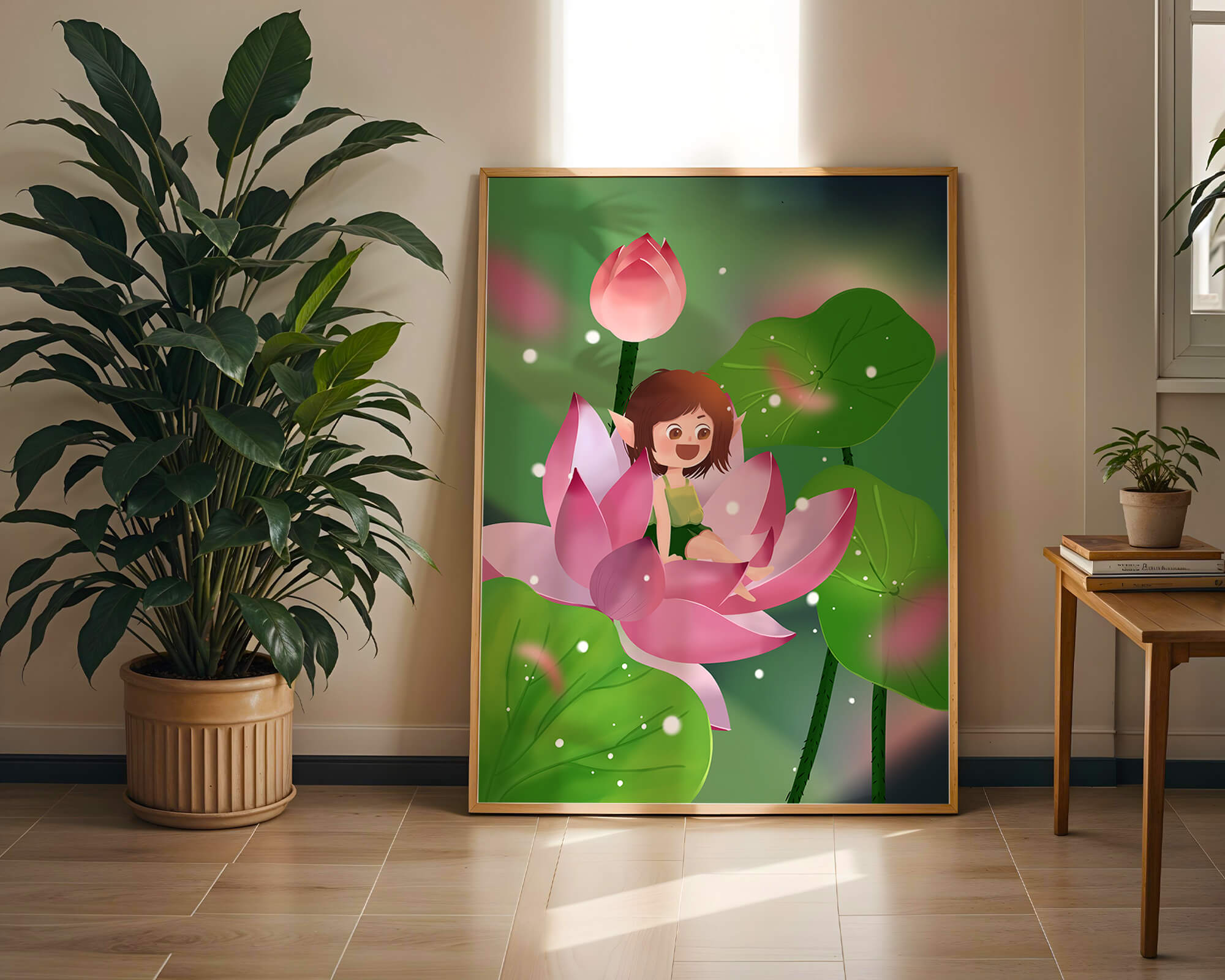 In this enchanting image, a small fairy is seen joyfully sitting atop a beautiful pink lotus flower. The surrounding environment is lush with greenery, creating a dreamy and whimsical atmosphere.The image captures the essence of a magical garden, where vibrant colors and playful elements combine to create a scene straight out of a fairy tale. The fairy, with her delightful expression, adds to the charm, making it ideal for adding a touch of fantasy to any childrens room.The interplay of pinks and greens gives the piece a refreshing look, making it perfect for those who appreciate imaginative and vibrant wall art. Whether its for a childs space or a nature-themed corner, this illustration brings the magic of fantasy to life.